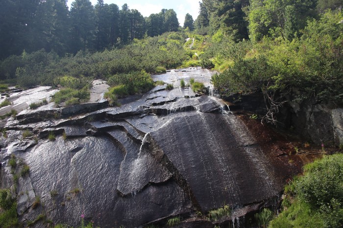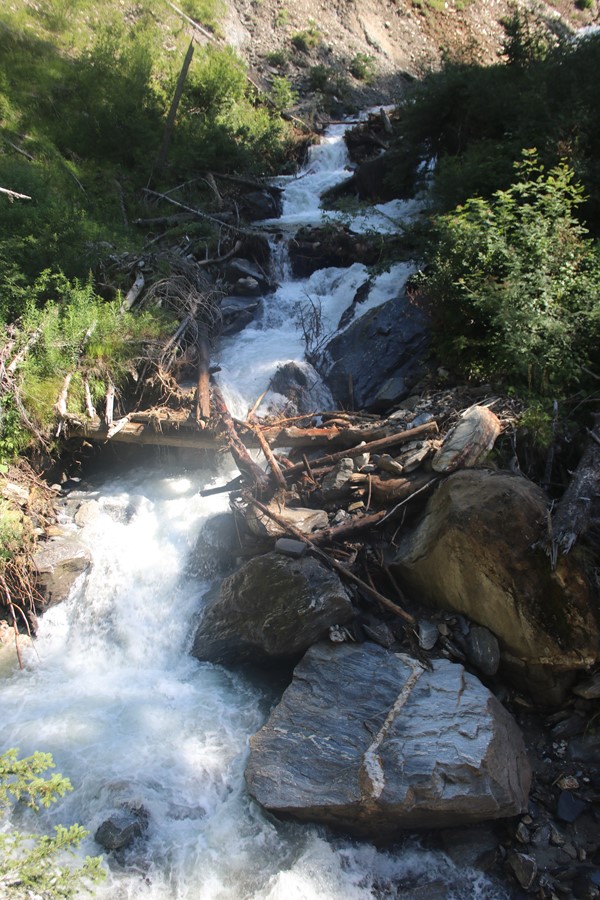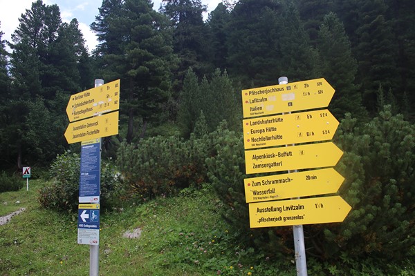 Noch vor der Lavitzalm die etwas über dem Wanderweg liegt, endet das breite Schotterbett des Baches der in unzähligen Armen fließt, der Wanderweg zweigt ab, die Schotterstraße steigt zur Alm an. Das Wasser vereinigt sich fließt über mehrere Stufen Tosend in die Tiefe. Der Wanderweg nicht immer zum Radfahren geeignet da bleibt nur ein Schieben. Ein Gatter trennt den Almbereich. Ein kleiner Zipfel des Stausee wird sichtbar. Zerzauste Bäume begleiten den Steig Von Links mündet der Haubenbach ein weiterer Bach speist den Zamsbach, ein großes Einzugsgebiet für den Speicher ohne Zweifel. Relativ gleichmäßig bis auf Höhe des Schrammbach Wasserfall der von Westen über den Hang inmitten eines Grünen Hanges mehr als Auffällig die Touristen anzieht. Eine Gelegenheit für die Betrachter wurde durch Bänke und Tische geschaffen. Direkt neben dem Unterschrammbach verläuft ein Aufstieg zum Höhenweg oder Übergang zur Geraer Hütte. 2 Massive Garnituren eine Familie Picknickt im Großen Still, Hungergefühle überkommen. Kurze Pause mit Blick in die Karte, noch c. 15 Min.Ein lichter Wald aus Zirben und Lärchen beginnt. An manchen Stellen, besonders wo es sehr feucht ist, wurde der Pfad vorbildlich mit Steinplatten befestigt. Es beginnt zu Tröpfeln, Große Wasser Partikel schädlich für die Kamera, Decke so gut wie es geht mit dem T-Shirt ab. Rote Sonnenschirme wie getimt, Schrittfolge Logischerweise etwas erhöhen. Das Kiosk Zamsgatterl das erste Gebäude bietet Schutz. 13.50 Uhr, Wurle setzt sich auf die Eckbank unter dem Dach des Urigen Holz Gebäudes. Mehrere Garnituren stehen auf dem Asphalt, Plätze sind noch frei. Frage ein Ehepaar das auch auf der Bank unter dem Schutz des Daches Vespert, wegen des Service, hier ist Selbstbedienung! warten bis Bodo und Christian dazu kommen, es Tröpfelt stärker. Bestelle 4 Russ, leider fehlt die Zitronenlimonade, Stattdessen 4 Franzi, Christian übernimmt die Kosten von 16.40 €. Der Sohn stellt die Gläser an den Tisch. Christian erklärt sich bereit das Seil Morgen mitzunehmen. Kläre das mit der Chefin ab, es ist kein Problem, kann ich gern hinterlegen, Morgen in der Früh ab 10 Uhr, ist ihr Mann hier. 2 Kg Ballast abgeworfen Top! der Kondition Starke Wurle, für ihn wäre es ein leichtes gewesen das Seil zwischendurch zu Schultern. Christian entscheidet sich eine Plastiktüte darin die Steigeisen zu deponieren, Bodo die Steigeisen ich die Grödel und das Akku Ladegerät. Für den Aufstieg sind 1 ½ Std. angegeben die Zeit für ein zweites Bier, Zeit ist gegeben, Wurle lehnt ab.