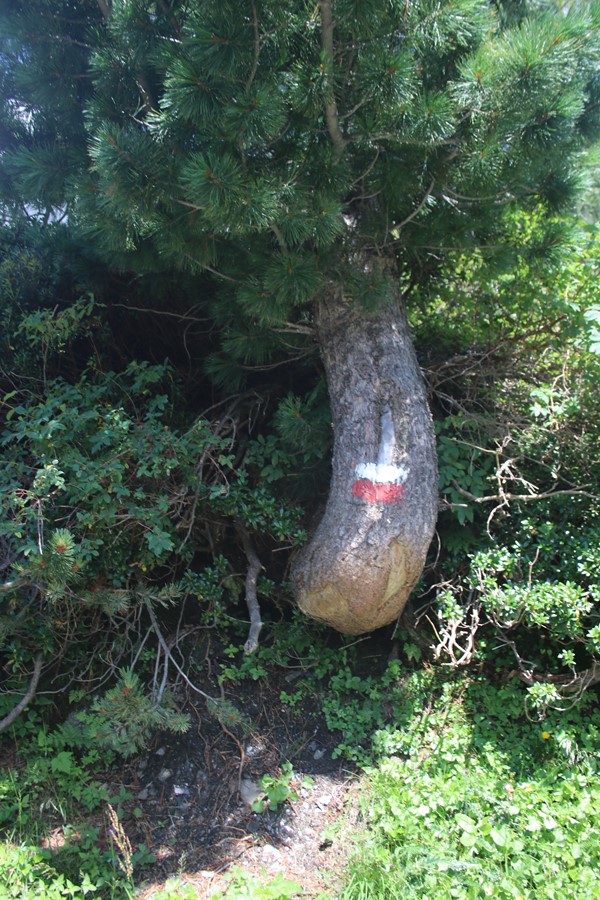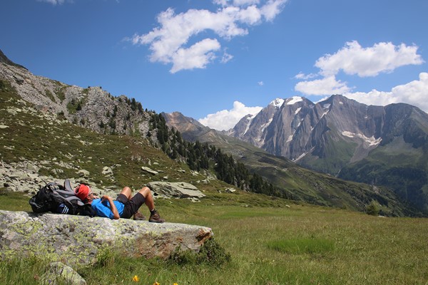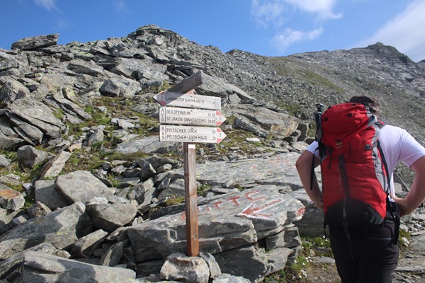 GPS starten, der 4 Tag, die neuen Varta Akkus Überragend. Verabschiedung beim Chef, er bestätigt die Zeitvorgabe von 7 Std. bei Nutzung des Shuttle Bus ist die Gehzeit kürzer. 8.35 Uhr, die Tochter knipst uns Freundlicherweise im Eingang. Der Winterraum zieht mein Interesse an kurz noch auf den Auslöser drücken. Langgezogen das Tal, Tief unten der Bach der Unüberhörbar Abwärts fließt. Gut Markiert viel Begangen Temperatur Ansprechend die Sonne ist Spürbar. Schon nach wenigen Minuten ist die Wegteilung Rechts zum Hochfeiler. Erste Personen wählen den Weg zum Gipfel, wohl schon sehr früh gestartet. Die Route verläuft am teils steilen Hang nicht wie vermutet tiefer. 9.30 Uhr, eine gesicherte Steile Querung „Gliedergang“ unter einem Ausläufer des Blauen Kofels , teils ist diese Passage mit Seilen versichert. Die Hütte ist von nun an nicht mehr Sichtbar, der folgende Wiesen Hang neigt sich nun zurück. Deutlich hebt sich der Weg ab, über eine längere Distanz bis in den Bereich der Baumgrenze ist er zu sehen. Das Tal nach Stein öffnet sich. In Kürze ist die Baumgrenze erreicht. Latschen und Sträucher kleinere Wasserläufe der Untergrund teils Tief und Morastig mehrere Teilstücke verlaufen über Holzbohlen. Auch kürzere Gegenanstiege, insgesamt Langatmig. Ständig steigen Wanderer auf. Sehr Eng an manchen Stellen wie ein Kanal im Buschwerk. Tief unten hat sich das Tal zu einer engen Schlucht geformt. Wohl deshalb verläuft der Weg soweit Oben. Das letzte Teilstück verläuft im Wald, kurzes Rätsel Raten an einer Wegteilung eher Links, der Parkplatz bzw. die Straße ist immer mal wieder zu sehen. Kehren bis zu einer Massive Holzbrücke über den Oberbergbach. Bäume , Äste, Wurzel Werk liegen Verkeilt im Bachbett. Wegteilung dem Bach Entlang zum Pfitscherjoch über eine Alternative Route. Aufstieg auf der Schotterstraße, die Parkplätze nahe Kehre 3 der Pfitscherjochstraße ist belegt, kein Wunder so viele Menschen sind heute schon begegnet. Eine Hinweistafel auch über das Shuttle, 3x am Tag verkehrt es für 5 €. Eine Sonderfahrt bei Anruf wäre Möglich. Bodo stellt klar wir Laufen. An der nächsten Kehre 4. Beginnt der Wanderweg 4 der Später in den Höhenweg Pfitscherjoch zur Europa Hütte mündet. Top Sicht in das Grüne Pfitschtal. Gut belegt auch dieser Parkplatz. Eine Große Wanderkarte in einem Unterstand lässt die Route wie ein 3D Modell sehr gut erkennen. Die Temperatur auf 1800 m, verdammt Warm. Bodo erzählt uns später....Christian gibt sich auf. Hätte er seine Frau erreicht, wäre die Tour nun für ihn zu Ende gewesen. Bodo redet auf ihn ein, so wird nicht aufgegeben! (Man kann es nicht für Möglich halten das wir denn Aconcaqua in einer „Rekord Zeit am Gipfeltag“ bezwungen hatten, ja er lebt von einer kurzen Epoche) Wie gerufen eine Wasserstelle um die Akkus auftanken. Eine Magnesium Tablette auch für Wurle. 1000 Hm. im Abstieg sind in 3 Std. absolviert noch einmal dasselbe im Aufstieg und dies am Südhang in der Sonne. Ab hier ist die Straße für den Öffentlichen Verkehr gesperrt. E-Biker radeln Cool Bergauf. Die Route lässt sich erahnen. Eine Pause am Durrnsee wird vereinbart. Die Schotterstraße endet geht in den Wanderweg 4 über. Die Sonnenbrille unendberlich. Gut Markiert am Grünen Hang Nördlich, gut begangen, vereinzelt Sträucher am Wegesrand. Prima eine Wasserstelle. Wegteilung zwischen Latschen Gehzeit 2h 50 die erste Zeitangabe. Querung auf Weg 4a in den Latschen, teils die Typischen Stellen „die Luft scheint zu stehen“ bis zu einem steileren Hang der im Schatten von Nadel Hölzer im Schweiße des Angesichts aufgestiegen wird. Ein Plateau wird erreicht, Sträucher und vereinzelt Bäume hier sollte der See liegen, Verfallene Gebäude, darunter auch die unbewirtete Griepl Alm. Wegtafel 2 ½ Std. wo könnte der See liegen? Am Hang eine Rinne diese sollte in den See führen. Wir Wählen einen Markanten Felsblock für die Pause.