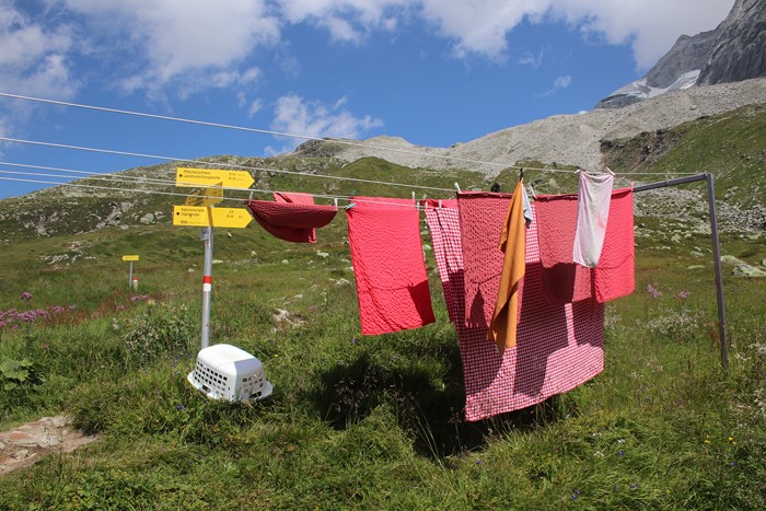 Als letzter der Gäste, bringe ich die Schuhe in den Container. Windböen deutet auf das kommende an, der Wind lässt die Fahne fast Waagrecht stehen, wenig später prasselt der Wind gegen die Scheiben des Wintergartens, wehe der jetzt noch nicht im Trockenen. Eine gute Portion Spagetti wird Serviert. Bodo`s Wunsch nach etwas Zuschlag der Tomaten Soße wird abgelehnt. Zu allem Unglück geht der Knobi Vorrat zur Neige. Einmal mehr fesselt der Bericht wie gehabt gleicht ein Russ den Flüssigkeits Haushalt aus. Ein Naturschauspiel die Wetterfront die schon Östlich abgezogen, legt unerwartet den Rückwärts ein. Ein Radfahrer völlig durchnässt nimmt am Nachbartisch Platz. Er berichtet das ihn sein Navi in einem auf und ab hierher leitete, es kostete ihm viel Zeit und Kraft, es war wohl nicht die Ideal Linie. Zwischen Gletscher und dem Standort, überspannt ein Regenbogen das Tal. Tauschen das Getränk stellen auf Weißbier um, die Preise Fair, er spart am Personal das wird klar. Kurz vor 21 Uhr, zieht Blitz und Donner durch. Mittlerer weile findet das geschehen im Modernen in Hellem Holz gehaltenen Nebenzimmer statt. Von den 35 Anwesenden halten sich 9 im Gastro Bereich auf. Chef informiert das bis 22 Uhr, der Ausschank möglich ist. Unterhaltung mit dem Radfahrer, der sich an den Tisch setzt. Ein waschechter Franke, er schwört auf die Komoot Software Hoch und Heilig. Kurz vor 22 Uhr, ist Zapfenstreich, die Bohlen unter den Füßen knarren unüberhörbar. So Lautlos wie möglich im Licht der Taschenlampe, obwohl das Fenster gekippt steht noch immer die Luft. Das Licht das durch das Fenster dringt, reicht beim Toilettengang bis zum Treppenhaus zu gelangen dort ist die Notbeleuchtung eingeschaltet.