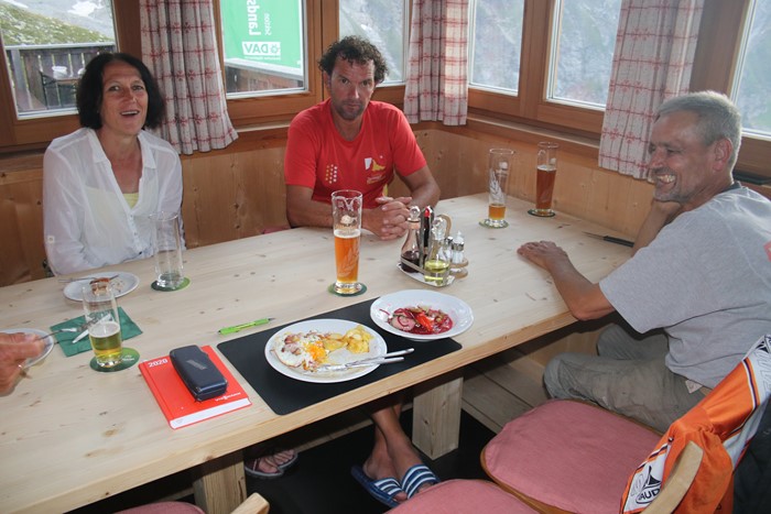 Das Essen wird Serviert, schmackhaft das Essen auch die Portion ordentlich, der Salat lecker. Ein Schlafplatz im Zimmer 30 € Lager 24 €, es ist keine AV Hütte. Notizen mein Zeitvertreib Wurle lässt sich vom „Bergsteiger fesseln. Roland verlagert uns in das Nebenzimmer am Rechten Ende des Ganges, gleich nach der Küche. Die Gäste der HP finden sich zum Essen ein. Aus Russ wird Weißbier das Gute Franziskaner wird Ausgeschenkt, Christian bestellt ein Johannisbeersaft Schorle, die Tod Sünden der letzten Inaktiven Jahre verlangen ihr Opfer. Rustikal der Raum mehr in Dunklem Holz gehalten, Rechts zur Küche eine Spültheke und Wandregal mit Gläser. Fühlen uns ganz Wohl obwohl wir in irgendeiner Form „abgeschoben wurden, als uns Roland einen Beistell- Gasofen bereitstellt entspannt sich die Lage. Die Jungs sind in reger Unterhaltung, die Konzentration gilt den Tag informativ in ein größeres Notiz Buch auf Papier zu bringen. Kleine Änderung für den Morgigen Tag, da wir einen Teil des Höhenweges heute schon gegangen, ist der Abstieg zum Stausee naheliegend, zumal diese Tour zur Edelraut Hütte (Eisbruggjoch Hütte) Zeitlich kürzer ist. Roland lässt wissen das in der Gaststube Platz wäre. Schwarz der Himmel die Wolken sind wie angewurzelt. Roland reicht ein Fernglas zeigt die Richtung ja in einer Rinne Unterhalb einer Scharte steht das Bauwerk, würde da kein Licht aus den Fenstern dringen wohl für einen Unwissenden schwer zu erkennen. Bodo kommt grinsend aus der Gaststube zurück, eine Gruppe von Gästen ist um die Theke versammelt, Gesellig das Treiben. Bodos Pistazien ein salzig leckerer Snack. Die Chefin und Bedienung decken die Tische für das Frühstück ein. Es kehrt Ruhe ein auf dieser Privaten Hütte. Roland wird erst Morgen Abrechnen, um 22.45 Uhr, geht dieser Tag zu Ende.