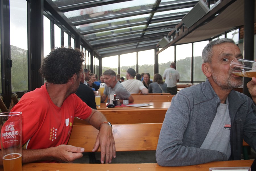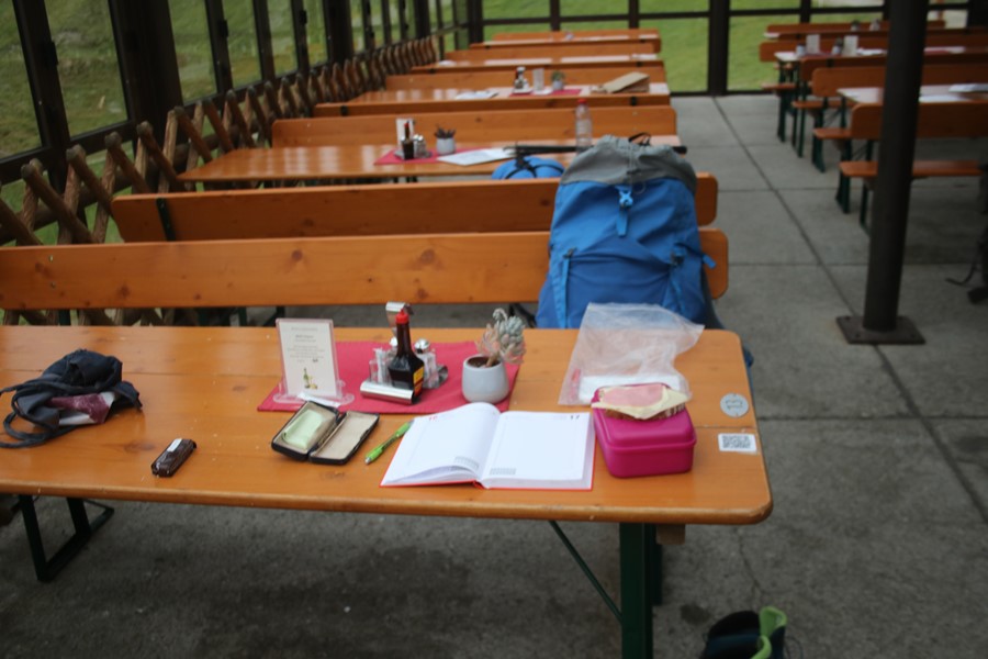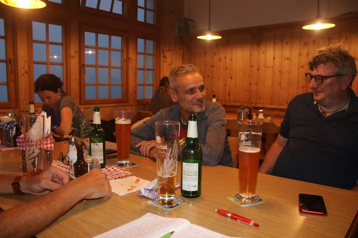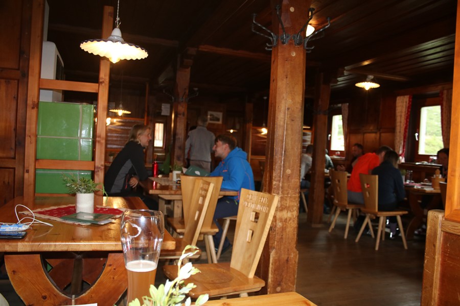 Zur Stärkung bestellt Wurle und ich je ein paar Wienerle, Flott steht das Mahl am Tisch garniert mit Kren und Senf, dazu ein Chile aus dem Rucksack, für 4.80 € bezahlbar. Wurle gibt mir 2 Scheiben Brot. Die hebe ich mit für den Morgigen Tag auf. Noi klingelt an, Sie hat für das Bad die Einrichtungs Gegenstände gekauft. Das Geld für die Häusles Bauer liegt bereit. Der Bericht steht an, damit bin ich für einige Zeit außen vor. Die Bedienung drängt auf die Bestellung um das Essen Vorzubereiten. Bodo und Wurle die Halbpension, begnüge mich mit einem Abendessen. Bei einem Toilettengang wird klar, hier war ein guter Architekt am Werk, überragend die Integration des alten Gebäudes mit der des modernen. Nördlich der Anbau mit Treppenhaus, im UG der Schuhraum und die Technik. In der oberen Etage die Lager und Zimmer. Nach und nach erreichen Wanderer ihr Tagesziel. Infos zum Tag, 14,57 Km Wegstrecke, 4.18 Std. reine Gehzeit, Bedingt durch das Wetter beträgt die Zeit im Stand nur 1.28 Std. 916 Hm Aufstieg, 1100 Hm. Im Abstieg. Gegen 15 Uhr, ändert sich sehr schnell das Wetter, von Westen ziehen Dunkle Wolken auf. Die Zeit verging beim Schreiben viel zu schnell. Es bleibt keine Wahl, das Lager im OG wird bezogen. Im Raum wird fast jeder Zentimeter für die Doppelstock Betten genützt. Ein Ehepaar liegt unten ich und Wurle eine Etage darüber. Bodo wählt das Bett rechts des Fenster das den Raum etwas aufteilt. Wurle gönnt sich eine Kalte Dusche danach ist es im Pudelwohl. belassen es bei einer Fußwäsche. Windböen pfeifen jetzt durch Kündigen das kommende Unwetter an. Wohl der jetzt ein Dach über dem Kopf besitzt. Das geschehen verlagert sich in die Gaststube Tisch 6 in dem alten Teil der Gaststube. Ein Hauch von Nostalgie. Kassetten Vertäfelte die Wände alles in Dunkel gehalten, wahrlich ein Schmuckstück. Eine durchgehende Eckbank an der Außenseite Da ich überhaupt kein Freund des Erdinger Weißbier bin, wird ein Starkenberger Dunkel bestellt. Wurle Erdinger Hell, Bodo das Dunkle. Ja Flexibilität ist gefragt. Es ist 16 Uhr, geworden. Regen setzt ein. Später kommt Blitz und Donner dazu, ein Temperatur Sturz findet gerade statt. Aus der Türe ein Foto knipsen mehr geht da nicht, es schüttet richtig, Große Tropfen prasseln zu Boden ihr Aufschlag ist unüberhörbar.