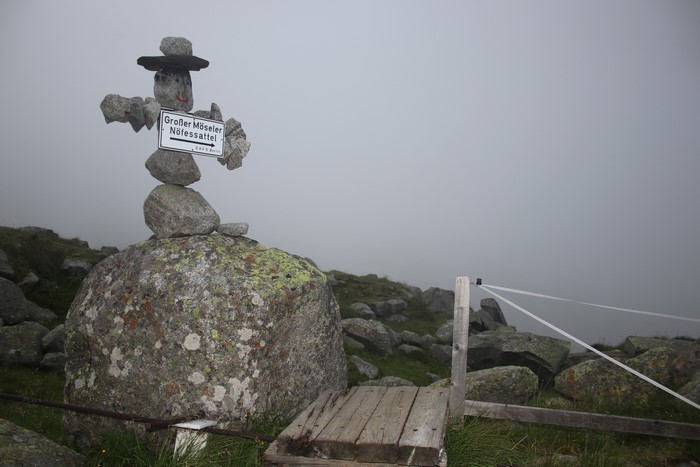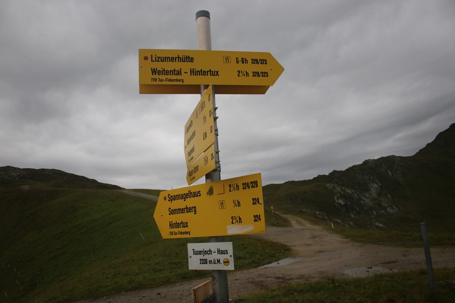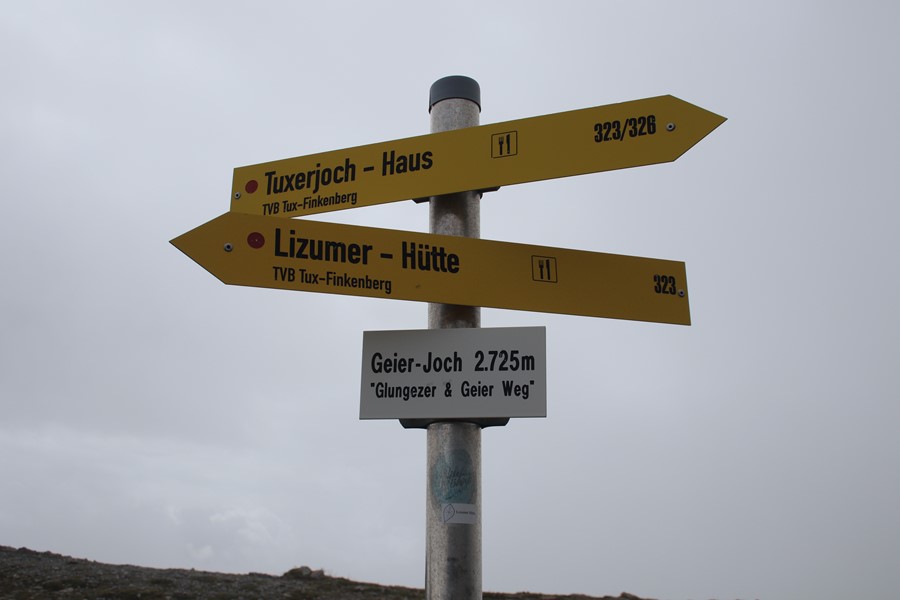Unüberhörbar das läuten von Glocken, übertönt die Regentropfen die auf den Regenschirm tröpfeln. Wurle tauscht sich mit einem Entgegenkommenden aus. Bis zu meinem Eintreffen harrt er, anscheinend sind es noch 2 Stunden bis zur Tuxer Hütte, das kann ja gar nicht sein. Wenig später klärt sich das mit der Zeitangabe, ein Wanderer berichtet das der Vorausgehende ein Tempo vorlegt im Stile eines Bergläufers. Eine Ziegenherde hält sich am Weg auf, erlabt sich im Paradies, so um die 20 Tieren. Beim Näherkommen preschen die Schwarz Weiß gescheckten Tiere plöckend auseinander. Der Schirm wird endlich überflüssig. Langsam hellt es ein wenig auf. Bei genauem Hinsehen ist nun der Heli Einsatz im Bereich des großen Tuxer Ferner zu beobachten. Bei einem Blick zurück ist ein Großteil des Wegverlauf bis kurz vor der Tuxer Hütte gut erkennbar. Wegteilung Östlich Abstieg nach Tux, dieser Weg ist wohl gesperrt, zwei Personen haben vor wenigen Minuten diese Route gewählt. Es quert jetzt Links in die steilere Flanke. Am Grat sind 3 Gemsen Sichtbar, fast schon was Besonderes, nur wenige Wildtiere wurden dieser Tage gesichtet. Schmal Windisch und tiefer, ganz anders der Weg nun. Gräser neigen sich vom Gewicht der Wassertropfen, sehr zum Leidwesen der Schuhe. Die Sicht in die Stubaier Alpen wird frei. Querung bis zu einer Rippe etwas Unterhalb parallel zu dieser, in der Gschützspitzsattel 2657 m, eine Weg Tafel hier hängt Wurle Regenjacke. Bodo liegt etwa 10 Min. zurück. Die Landschaft ändert sich schlagartig eine Wüste aus Steinplatten im Oberen Bereich. Dieser Flache Kessel endet in einem großen Bogen. Im Norden Thront mit seinen Graten auffallende Kegel des Sägenhorst 2713 m. Rechts inmitten des Kessels Weiden Schafe. Als Bodo nach einer Pause startet, folgen wir ihm. Eine Person mit Blauem Rucksack kommt entgegen. Schneller als gedacht begegnen wir ihr im Plattengewirr, des Wanderwegs München Venedig, ein Freundliches Hallo. Oh weh ihr Gepäck ist in Relation zu ihrem Körper viel zu groß so wird eine Expedition Ausgerüstet. Erste Wolkenlücken am Himmel, beim gehen ist die Temperatur ganz Erträglich. Im Prinzip verläuft die Tour Nördlich, doch etliche Natürliche Hindernisse erfordern etlich „Umweg“. Überraschend, im Abstieg verläuft die Route bis zu einer Wegteilung, hier eine Weg Tafel ohne Zeitangabe, rechts Tal Abstieg, Links zum Tagesziel das nähert kommt. Sehr viele Schafe verteilen sich im weiten Rund, ein kleiner See inmitten. Abwechslungsreich ja, weniger Alpin die Tuxer Alpen, auch dies wird diese Tour eindrucksvoll prägen. Eine Wasserstelle kommt ganz gelegen, zwischen den Platten entspringt ein Rinnsal, Wurle lässt wissen das gestern die Wasserflasche verschütt ging. Gerne helfen wir aus, ein Teil einer Magnesium und Vitamin Tablette sorgen für einen Wohlschmeckenden Geschmack. Kurze Querung, ab und an ist ein Stein mit Rot und weißer Farbe zur Orientierung bemalt, danach steht ein zum Ende fordernder Aufstieg an. In etwas Entfernung bewegen sich Personen am Grat, dahinter könnte eine Ebene liegen. Ein kleiner Bergrutsch versperrt den Weg, auf geschätzte 30 Meter ist der Hang abgesackt. Kurz danach befinden sich besagte 7 Personen im Abstieg. Ein Blick nach Süden lässt erkennen das Wolken aus dem Tal nach Oben abziehen. Als die Gruppe Älterer Herren passiert, ein Oberflächliches Hallo. Das letzte Stück geht Anstrengend auf schmalen Pfad durch Schotter nach Oben. Auffallend nun der Geier mit 2857 m. Auch dieser Aufstieg endet, in diesem Fall wird ein Hügelige Anhöhe erreicht. Wurle steht an einer Weggabelung mit Hinweis Tafeln, die Hände in der Hosentasche ja es ist kühler als die Tage zuvor. Wurle hat seine Windjacke zum Trocknen an die Hinweisschilder zum Trocknen gehängt. Schnee liegt einer Senke, wohl noch die Überreste der Niederschläge die vor 10 Tage niedergingen. Ein Mix mehrheitlich in Grau, die Steine sind jetzt abgetrocknet.