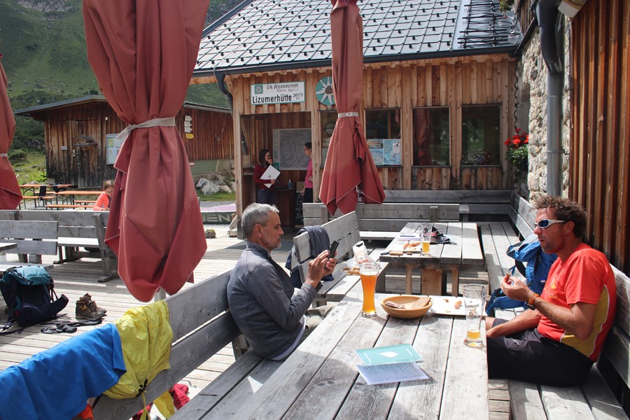Es ist 12.20 Uhr, ungewöhnlich früh wird das Tages Ziel erreicht sein. Ein Stein wird zum Trocknen des Textils verwendet, auffällig die Gesteinsschicht wechselt auf das Graue Typische Kalkgestein. Schade das Gras ist noch nicht abgetrocknet, dafür finden sich Steine zum Sitzen, mehr und mehr lichtet sich die Wolken Decke. Logisch, die Essens Vorräte sind leider verbraucht, auch ohne lässt es sich gut sein. Oben ohne ist angesagt, schnell trocknet der Schweiß auf der Haut, Links eines Abbruchs ist der Abstieg erkennbar, er führt durch die Schotter gesäumte Flanke. Inmitten hatte sich der Bach einen Weg geschaffen. 15 Minuten relaxen genug. Erdig teils Feucht sowie Tief der Untergrund. Anfangs direkt und Geradlinig, eine Natürliche Barriere wird Östlich bis zur Straße und Bach verfolgt. Es ist 13 Uhr. Wurle zieht es schnurstracks zum Wasser. Warum nicht, aus einer Trinkpause wird ein Halt von 15 Minuten. Körperwäsche und ein Sonnenbad setzt Motivation Pur frei. Die Temperatur auf 2000 m, um die 20 °C. Eine wirklich gute Internetverbindung, liegt wohl daran das das Österreichische Militär hier ansässig ist. Immer wieder Fesselt, der Blick zurück in das geleistete, eigentlich gar nicht so lange zurück, als wir von Oben in das Tal blickten konnten. Auf Schusters Rappen durch die Alpen, Bergwandern kann so schön sein, ja wenn dafür die Zeit ausreichend vorhanden ist, ja Cool deutlich vor dem Offiziellen Renten Beginn ist der Ausstieg gelungen, und das nur weil ich Rechtzeitig auf die Krypto Währungen gesetzt habe. Auffällig viele Felsbrocken liegen verstreut im Tal, durch die Wucht des Abrechens sind sie weit gerollt. Wir halten uns gerade an der Baumgrenze Auf, wie sich doch in wenigen Minuten die Natur ändert. Das Grün eine Wonne. Der kleine See und die Hütte dahinter weckt sofort Erinnerungen an die Bremer Hütte, es scheint eine Kopie dessen zu sein. Ist das eine Schutz Hütte oder eine Ferien Anlage wahrlich Heimelig. Zweimal wird der Bach über eine Brücke gequert. Vorbei an alten verfallen Gebäude die wohl dem Spieltrieb für das Militär zum Opfer gefallen sind. Ist das im Hintergrund Nördlich die Innsbrucker Kette? Später klärt sich das auf. Das Bauwerk passt gut in die Landschaft. Störend sind die Fahrzeuge, wenn es auch für die Betreiber von großem Vorteil ist. Ist es die gelungene Mischung aus Natursteinen und dem verschmelzen des Holzvertäfelnden Altbau mit dem des Neubau, oder liegt es an der Gestaltung der Dächer dieser Gebäude? Die Begeisterung ist der Winner. Vorbei am Teich ist die Große Terrasse erreicht, der Boden die Bänke und Tische all das Holz ist unbehandelt, das natürliche Grau erzielt seine Wirkung. Eine Kletterwand für die Boulderer wie selbstverständlich. 13.30 Uhr ist es dann doch geworden, jetzt wo das Wetter auf Seite der Gäste ist, spielt das keine Rolle. Eine Tafel der Sektion Hall in Tirol, Lizumer Hütte 2019 m, das ist die Tiefst gelegene Hütte dieser 8.Bergwoche. Wurle der als erster eingetroffen ist wählte einen Tisch nahe dem Eingang. Trotz eines lockeren Tages, sind es die Schuhe und Socken die abgelegt werden. Nur wenige Gäste verteilen sich um diese Frühe Zeit. Kurz später trifft eine ruppe ein es wird nun Lebhafter, die Bedienung kümmert sich vorsorglich um die Gäste. Was für uns weniger wichtig ist die Anmeldung, doch hier steht es an erster Stelle. Wurle legt den Test von der Tuxerjoch Hütte vor der ja 24 Std. Gültigkeit besitzt. Zimmer 25 wird zu gewiesen 12 € für die Mitglieder je Nacht. Die Speisekarte interessiert uns noch nicht, wir möchten uns später Entscheiden, locker nimmt alles seinen Gang, doch der Durst auf ein Russ Grenzenlos. Wer hätte das noch am Morgen erwartet, die Sonne gönnt uns noch ein paar schöne Stunden. Verteilt um den Tisch Trocknet vom Schuhwerk bis Shirt.