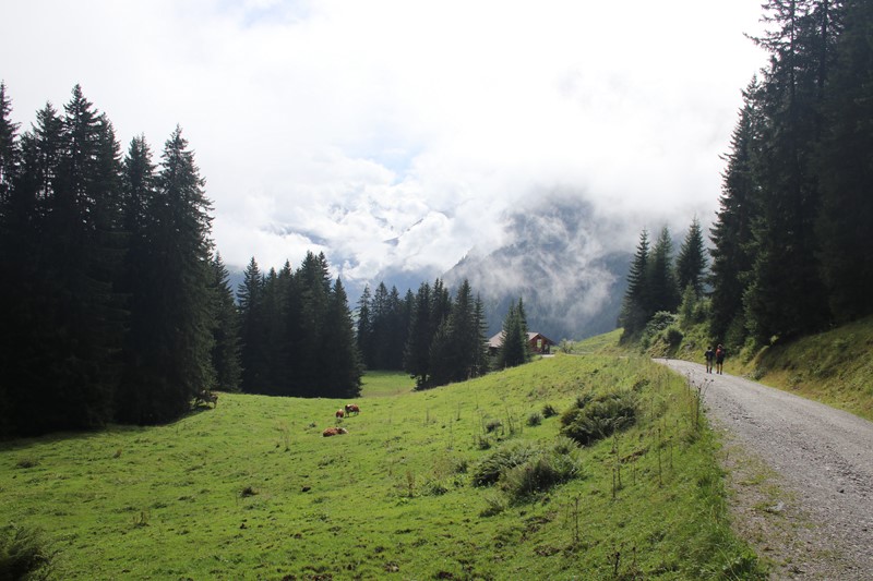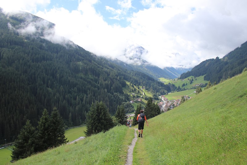 Die Querung im Nordhang endet plötzlich an einer Schotterstraße, die für die Alm Wirtschaft gebaut wurde. Eine erste Auflockerung der Wolken. Ein Stacheldraht am Rand der Schotterstraße, kurz danach taucht eine Bewirtschaftete Alm aus dem Nebel (Wolken) auf. Massiv und in gutem Zustand die Gebäude, darunter auch eine Stallung. Ein Abscheider rechts reizt, der Untergrund leicht aufgeweicht, doch es sollte sich lohnen, die Straße verläuft in einem Bogen. Treffen wieder auf diese. Das läuten von Glocken wird lauter, eine Alm liegt unterhalb auf einer Ebene am Hang im Hochkar. Die ersten Bäume an den Hängen, wohl um die 2000 Müdm. Sicherlich die Nasse Tuxalm 1843 m, die Alm ist Bewirtschaftet, ein Traktor inmitten des Hofes, umgeben von mehreren Gebäuden mit den Sonnengegerbten Dunklen Lärchenholz Fassaden, darunter wohl auch zwei Wohnhäuser. Die Milchkühe Genießen einen weiten Auslauf. Eine frische Milch das wäre es doch. Eine Mähmaschine ein PKW, doch die Bewohner wohl in der Landwirtschaft, es scheint das keine Bewirtung oder freier Verkauf hier möglich ist. Der Abstecher quer durch den Weiler ohne Erfolg, für die Moral hätte ein Erfolgserlebnis sicherlich gut getan, die Physische Verfassung wirft das nicht so zurück, bei Schönwetter kann ein jeder, trotz allem ein Versuch war es allemal wert. Gute 2 Std. nun auf den Beinen, es ist 10 Uhr. Gatter versperren denn Weg. Sehr viele Kühe weiden weit verteilt hier. Kurzer Anruf bei Noi ein sehr gutes Netz, zeige ihr die Kühe, die von anderer Statur als die der Thailändischen Gattung. Abstieg über einen steileren Wanderweg entfernt der Schotter Straße. Bodos Hose ist mittlerer Weile bis an die Waden Nass. Etwas kurz vor dem Bach ein Gatter, hier endet das Privat Gelände der Alm. Massiv die Holzbrücke über den Wilden Bach, dieser wechselte durch die Regenfälle seine Farbe. Kurze Stopp auf der Brücke, mit Getöse fließt das Wasser des Niederlahnerbach Talwärts. Von Gegenüber mündet ein Bach in diesen. Die Sicht gibt für einen Moment einen Blick Südlich in den wenn auch nur wenig Bewaldeten Berghang frei. Kurzer Gegen Anstieg die Richtung wechselt Östlich, oberhalb des Baches verläuft nun der Wanderweg zu diesem Talwärts. Nur kurz später mündet dieser in die Schotter Straße von der Nasse Tuxalm kommend. So richtig im Wald, zum ersten Mal seit Tagen umgeben von Nadel Bäumen, wohl nicht schön auf einer Straße zu gehen, eins ist klar die Tour endet in der Zivilisation und das sind die Vorboten. Eine Lift Anlage mit der leider dazu gehörenden Schneise wird passiert. Unterhalb steht das Betriebs Gebäude und ein Rondell einer Schneebar, sowie die dazu gehörende Asphaltierte Straße. Monoton aber Flott, der Himmel lichtet sich, die Temperatur nimmt zu, die Regenkleidung wird entledigt. Der Verlauf des Haupt Tales wird klar erkennbar, trennt die Berge. Erste Größere Blau Löcher am Himmel, die grauen Wolken lösen sich langsam auf ziehen nach Oben. Unterhalten uns über die Hütte mit dem Besten Essen. Es war die Gerarer Hütte, die das Beste Essen Servierte, gefolgt von den Köchen der Hochfeiler Hütte. Negativ bleibt die kümmerliche Portion die gleich am ersten Tag auf dem Furtschagl Haus gereicht wurde. Die so Hochgelobte Lizumer Hütte mit kleiner Karte, ansonsten keinen Grund zur Beanstattung.