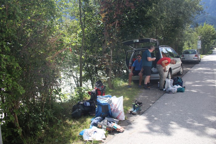 Nahe des Auto starten Gruppen einer Rafting Tour. Oh weh, ein Stück Papier in Folie liegt unter dem Scheibenwischer, an der Windschutzscheibe