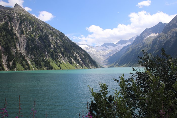 In weiter Ferne Südlich der Nevesattel mit dem Gletscher davor, aus Süden ziehen Wolken über den Grenzgrat. Es ist deutlich kühler hier auf 1700 Meter. Immerhin über 1000 Meter höher als der Ausgangspunkt. Der Parkplatz will nicht enden. Es zweigt rechts zur Olperer Hütte ab, Gehzeit 1 ½ Std. von hier werden wir nächsten Freitag diesen Aufstieg angehen. Die Parkplätze ziehen sich locker über 0,5 km hin. Laut Wegtafel 3 Std. das ist mehr als die Angaben zur Tour. In einem Rechtsbogen verläuft der Zustieg um die Zunge des Sees, hier mündet der Zamserbach ein Zufluss aus dem Zamsergrund dieser entspringt am Pfitscherjoch, aus dem Gletscher des Schrammacher 3410 m. Zwei Gasthäuser liegen am Weg gut Besucht die Gastronomie. Das geschehen verläuft 10 m, über dem See. Wasserläufe queren den Schotterweg ein Zeichen der Regenfälle aus den letzten Tagen. Wanderer begegnen. Vergebens die Olperer Hütte bekann für den Blick auf den See ist nicht auszumachen, ist sie so der Natur angepasst? Flott der Schritt, ohne Pinkeln geht es nicht die zwei Bier wollen nicht im Körper bleiben. Beinahe vergesehen das GPS einschalten wenn auch schon ein Stück der Wegstrecke bewältigt. Gegenüber dringt eine Größere Wassermenge aus dem Berg, wohl ein Stollen der hier mündet, in der Nähe stehen größere Baufahrzeuge.Die Kulisse hat schon was für sich, wohl beliebt bei den Touris eine einfache Auffahrt mit dem PKW ermöglicht dies. Treibholz schwimmt auf der Wasseroberfläche. Allein 1 Std. Wanderung bis zum Ende des Speicher. Es quert Nach Osten, etliche Rohre wurden unter der Straße für den Bach auf der Gesamtem Breite des Bachbetts eingebaut. Jetzt wird der Aufstieg ein wenig Sichtbar, er verläuft am Ausläufer des Gegenhangs. Bis hier waren nun 5 Km Wegstrecke bewältigt. Wurle geht voran, erste Aufsteigende werden passiert Stützen der Materialseilbahn werden Sichtbar, eine davon weit oben am Grünen Hang. Jungvieh weidet am Wegesrand. Der Markante Groß Möseler 3478 m, und der Hochfeiler 3508 m, höchste Erhebung der Zillertaler Alpen, weiß gezuckert, der Gipfel wird von Wolken verhüllt, dazwischen liegt der Nevessattel. Wasserläufe an den hängen die dem Schlegeiskees entspringen. Guter Weg relativ Trocken. Ein VW Bus steht am Ende des Materiallift, das nebenstehende Gebäude schaut sonderbar aus. Querung bis an den Lift die Schritt Frequenz relativ Hoch, wohl vorausgehende die Magisch anziehen, Wasser fließt über einen Stein Gesicht abkühlen eine Erfrischung tut gut. Zwei jüngere die vorher uns überholten legen eine Pause ein. Ein etwas gewichtiger klebt an den Fersen, wohl sehr Sportlich. Wurle enteilt. Die Konzentration gilt dem nächsten Schritt, eine Blondine zieht wie ein Magnet an. Längere Ansteigende Querung auf die Südliche Seite der Seile Wohl eine Hobby Fotografin ihr Motiv ein Wasserfall der hier Sichtbar wird, dieser ist dem Gletscher entsprungen stürzt unüberhörbar in die Tiefe. Relativ geradlinig steigt es an, das Furtschaglhaus wird Sichtbar, kurz Unterhalb wechselt es auf die andere Seite der Seile.
