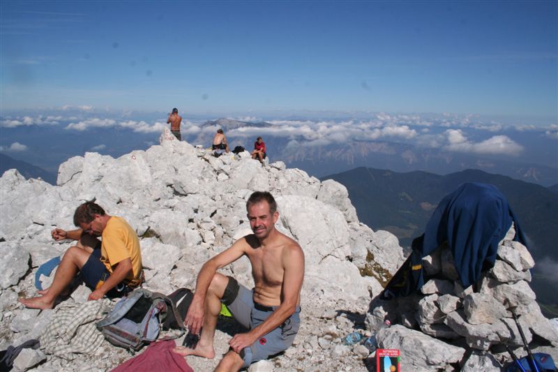 Sonntag 25. Sept. Punkt acht brachte Jürgen Leben in die Bude, ja der gute hält sich hald beim dringa a wenig zruck. Nach der Abzocke begnügten Olaf und ich, uns mit einem Teewasser, Jürgen erlabte sich an einem dürftigen Frühstück: Zwieback ohne Butter mit Gsälz und Honig.9.30 Uhr war Start: Begehung der Steiganlage auf die Hohe Ponza 2272m. Abwechslungsreicher im oberen Teil spannender Steig! Gehzeit 2 Std. Sonne satt, die Temperatur stieg stetig obwohl wir uns nicht gerade langsam nach oben bewegten.In relation zur Nähe des Gipfels und der doch großen Höhendifferenzvon 900 Hm. war das Gelände anfangs noch nicht so ausgesetzt, dies sollte sich dann nach einer 1 Std. ändern, es galt einen Wasserlauf zu queren, um dann auf seiner Südlichen Seite immer steiler werdend, über Felsbänder in die Schlucht einzusteigen. Über eine gut gesicherte und Steinschlagsichere Rippe wird dann an denn Fels gequert, von hier ab begnint dann der interessanteste Part,der bis zum Gipfel für Spannung und Klettersteig Vergnügen pur sorgt!! Leider sorgt aber der lose Schotter für große Steinschlag Gefahr. Pure Zufriedenheit dann am Gipfel, eine Gruppe Slowenen grinzte mit uns um die Wette, ja solch ein Wetter verzückt eben die Menschen! Nach und nach gesellten sich Bergsteiger/innen aus Österreich, Italien und Slowenien auf den breiten Gipfel. Eine geschlagene Stunde verweilten wir an diesem schönen Ort, Großklockner Großvenedigerder Ponzagrat, Mangart, Jalovec (Matterhorn der Julier) um nur einige zu nennen, zogen in ihren Bann.