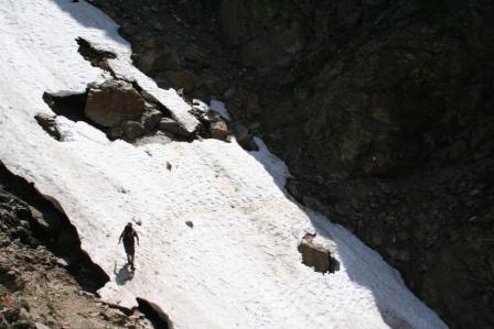 In der wilden, urwüchsigen Felslandschaft des Stubai, liegt in völliger Einsamkeit der fast vergessene Hochreichkopf 3008 m.Es besteht die möglichkeit von der Hochreichscharte in leichter Kletterei diesen zu Besteigen.Wolf Peter versuchte sich bis zu der alten Bielefelder Hütte, aufgrund der doch enormen Anforderung besann er sich auf eine Umkehr.Es ist eine sehr lange Etappe, von der Entfernung her sollte man meinen No problemo, doch meist ist es dann vorort anderst. Durch ein Auf und Ab sind es nicht nur die angegebenen 800 Hm, einige Mal wurde an Höhe verloren, diese galt es dann wieder aufzusteigen, intensiv waren die einzelnen Rinnen diese kosteten einiges an Zeit, ja es summierte sich, denn Aufstieg zum 3000er Hochreichkopf der direkt in der Hochreichsscharte abzweigt, blieb wortwörtlich Links liegen. Etliche Altschneefelder an der Nordseite des Berges zeugten noch vom letzten Winter. Der langatmige Abstieg ermüdeten die Beinmuskulatur ganz gehörig, irgendwann dann kam die Schweinfurter Hütte in das Blickfeld, zwar liefen die Beine nicht ganz allein, aber leichter!