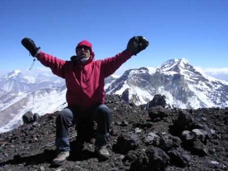 Donnerstag 14.Jan. Scheußlich wenn inmitten der Nacht, war es doch erst 5.00 Uhr, der so genannte Wecker schrill klingelt. Deutlich Milder als noch Gestern (nur) -7° C im Zelt -2° C wurde im Licht der Stirnlampen gefrühstückt, nebenher wurde der Marsch Tee je 1 Liter pro Person aufbereitet. Das anziehen der Textilien und der Schuhe erfolgt im Zelt bzw. Eingang. Wie vereinbart starten 7 Members (die Lisa blieb auf eigenen Wunsch zurück) Pünktlich um 6.00 Uhr, zu unserem „Traumberg“. Bei noch Windstille und langsam einsetzender Dämmerung, umrunden wir die Hochfläche zunächst in südlicher dann östlicher Richtung, zunächst galt es denn Grat, der die Grenze zu Argentinien bildet zwischen Piuquenes und Pyramid zu erreichen, schon nach wenigen hundert Meter werden die Abstände immer größer, Bea fällt sogar weit zurück. Etwas unterhalb des Grates an einem leicht gefrorenen Windgeschützten See halte ich länger inne, wir dürfen ja keinen „verlieren“ eine zu große Distanz könnte zu einem abreißen führen. Es ist mittlerer weile Taghell, aber noch befinden wir uns im Schatten des auserkorenen Ziels. Als die letzten, die Erste von Fünf Etagen erreichen, war der Körper der wartenden ausgekühlt. Das Gelände wird nun deutlich steiler und brüchiger, noch sitzen die Schritte in dem Vulkan Gestein, es gilt nun die ersten großen Felsen zu umgehen, in diesem Teilstück werden etliche Höhenmeter gewonnen. Der langsam aufkommende Wind *mit der aufgehenden Sonne tritt eben dies Phänomen ein, kühlt denn durch denn von Sauerstoffmangel geschwächten Körper noch mehr aus. Der Stuhlgang drückt auch noch, ich nütze die Flanke nach der zweiten Etage, versteckt hinter einem Fels für dieses Menschliche Bedürfnis, Jens ereilt selbiges Problem. Amin der weiter Rechts näher am Grat aufsteigt entfernt sich langsam. Hier in diesem Abschnitt wählt jeder seine eigene Taktik. Ich bevorzuge das etwas steilere mit großen Felsen durchsetzte Gelände, um die Hände für eine 3 Punkt Halt, der eigentlichen Klettertechnik eben, (warum die Hände baumeln lassen, wenn sie Arbeit abnehmen können) Jens, Alvaro und Gonzalo sind dran die Mädels halten gut Anschluss. Im noch Schatten ist es durch die zunehmende Höhe und eines zunehmenden Windes bitter Kalt, längst sind die gewalkten Handschuhe von einer Plastiktüte die vor Wind schützen soll eingehüllt. Alsbald lege ich eine Pause, und warte auf die Franziska, sie kommt zwar „nur langsam“ vorwärts ist sich des Gipfelerfolgs aber sicher. Franzi bietet mir ihre Überhandschuhe an, mich vergewissernd das sie diese wirklich nicht benötigt, nehme ich diese Dankend an.“ Ja diese Südamerikanischen Power Frauen haben es in sich“. Zügig erreiche ich denn letzten Schneebedeckten Aufschwung. Für diese Passage hatten wir die Steigeisen im Rucksack, aber der an der Oberfläche nicht angefrorene Schnee lies ein leichtes eindringen der Stiefel zu! Für uns erfahrene Westalpen Hochtouren Geher, ein eigentlich „normales Gelände“ zumal es wenig ausgesetzt war. In 5700 m Höhe, der letzten ca.200 m² großen mit Neuschnee bedeckten Ebene, legten wir noch vor 10.00 Uhr eine „Frühstücks Pause“ ein, wobei der Tee ziemlich gefroren war. Die Südamerikanischen Freunde benützen die Steigeisen. Ja ich hatte starke Schmerzen, waren doch die Glieder an Hand und Fuß, fast schon Taub. Wir verzichteten auf die Mitnahme unseres Gepäcks, daher ließen wir unseren Rucksack zurück. 10.00 Uhr, mit einem Vamos folgte ich Amin zur letzten Etappe. Was jetzt folgt war der schier unglaublich, ich wählte anders als die anderen, die schneebedeckte anfangs wenig ausgesetzte, später für die anderen zu gefährliche aussehende Gratflanke, in einem unglaublichen Tempo, um eben denn Blut Fluss der Adern in Wallung zubringen, zuerst an Amin vorbei dem Gipfel entgegen, zwar legte ich kurze Verschnaufpausen im eisigen Wind ein, aber der Adrenalin Spiegel war so hoch, es gab eben kein Halten mehr. Mit einer unglaublichen Euphorie, und innerlichen Begeisterung erreichte ich um 10.50 Uhr, also genau 50 Min. nach dem letzten Stopp mit warmen Gliedern denn Gipfel des 6021m Hohen Piuquenes. Vor lauter Begeisterung stemmte ich die Gipfelbuch Kassette, gestiftet von der Banco de Chile gen Himmel, leider konnten die folgenden, aufgrund deren Entfernung dies wohl nicht war nehmen. Die Zeit zum Fotografieren nützend, erreichten unter persönlichem Jubel Jens, Amin, Alvaro später Gonzalo den Gipfel, jeder Grüßte jeden mit Umarmungen Schulter klopfen und Shake Hands. Die Franziska und die 1 ½ Std. später ankommende Beatriz wurde mit einem Typischen zusätzlichen Küsschen auf die Wange beglückwünscht. Ja diese Momente sind absolute Höhepunkte im Leben, vor allem dann, wenn alle am gewählten Ziel Gesund und wohlbehalten ankommen, für einen nicht Bergsteigenden wohl weniger verständlich sich dies anzutun! Was überraschte war der hier Senkrechte Abbruch nach Argentinien, vom Marmolejo aus glich dieser Berg eher einer gleichmäßigen Flanke. Versteckt hinter dem so gut wie nie bestiegenen Alto (meiner neuer Traumberg) war vom 6565 m Gigant Tupungato, die Besteigung erfolgte 2008 leider nur sehr wenig sichtbar. Bei guter Fernsicht wurden unendlich viele Fotos platziert, wir Marmolejo Bezwinger von 2006, ließen uns vor der mächtigen Kulisse dieses doch unglaublich imposanten Bergs ablichten. Alvaro hielt die Einträge des separaten Buches in einer Metall Schachtel, (dieses war so zugerostet das es nur mit Gewalt geöffnet werden konnte) deutschen Erstbegeher in Bild fest. Später beim Treffen lernten wir Hinrich Schneider) einen noch lebenden dieser Expedition vor 25 Jahren kennen. Um 12.45 Uhr traten die Stolzen Gipfel Stürmer denn Rückweg an.