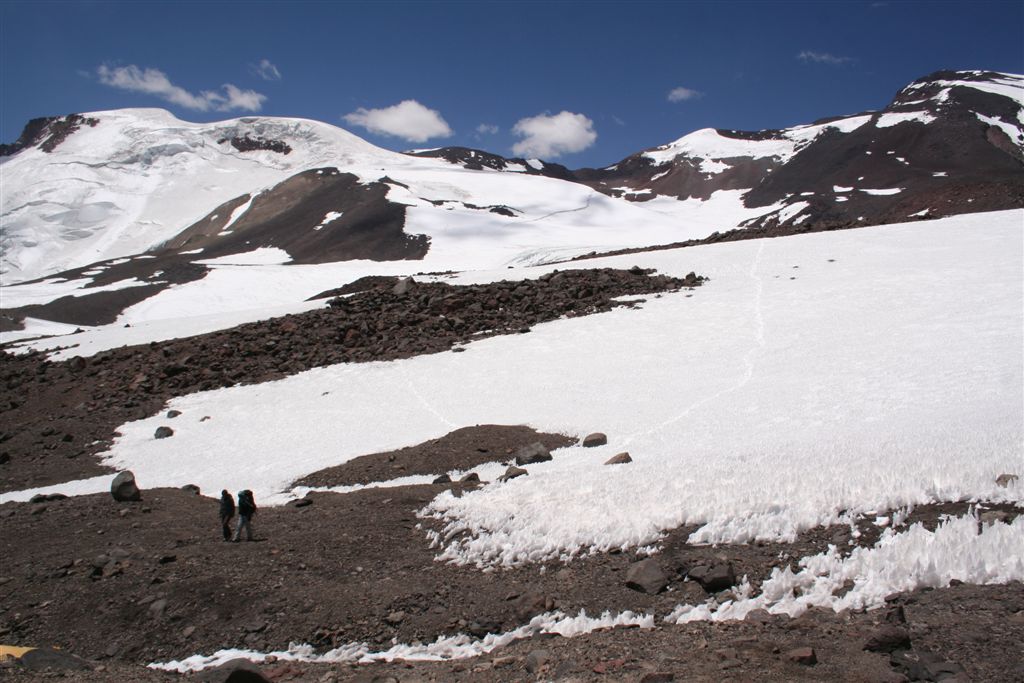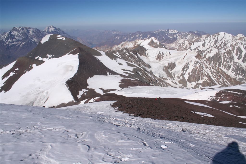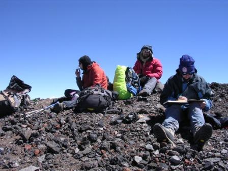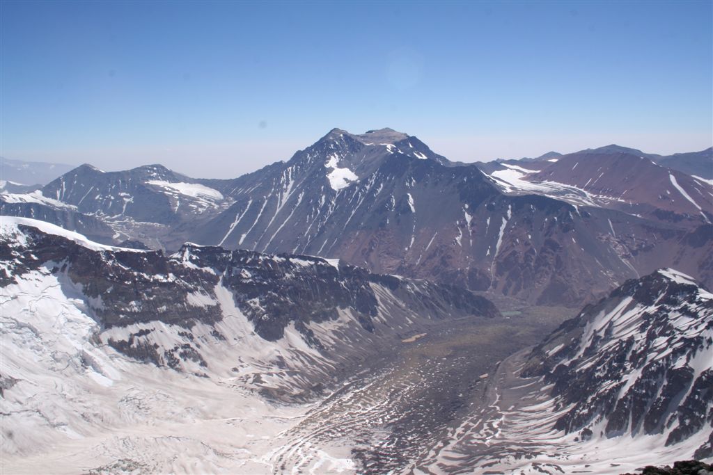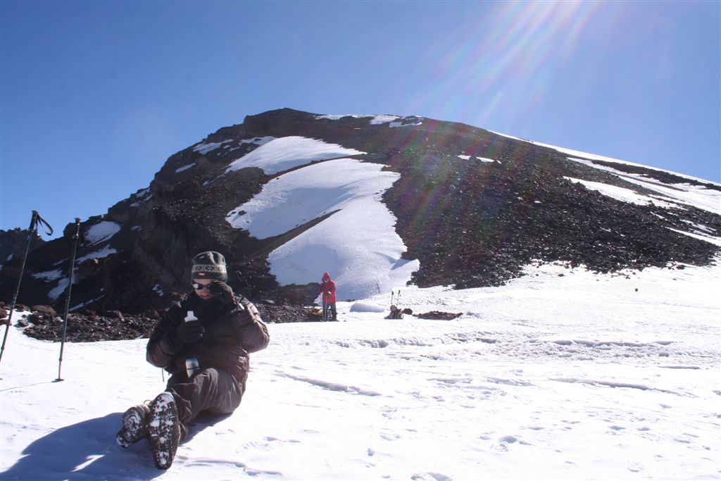 Am ca. 500 m langen Gipfelgrat denn ich aufgrund des starken Winds in der Ostflanke begehe, treffe ich mich mit Alvaro kurz vor dem Gipfel, gemeinsam erreichen wir zum ersten Mal überhaupt einen Anden Summit, gegen 11.45 Uhr stehen wir nach 2 ½ Std. und 615m Anstieg auf dem 5545m Hohen Pyramid. Von hier aus genießen wir zum ersten Mal einen Blick auf denn mächtigen Felsklotz des 6000 er Marmolejo. So langsam trudelt einer nach dem anderen ein. Die zwei Mädels sind noch nicht in Sichtweite, so begebe ich mich auf denn Weg, um nach denn beiden zusehen, die ich bald treffe, voller Stolz erreichen wir gemeinsam das Tagesziel, Lisas erster Gipfel über 5000m Höhe. Nach unzähligen Fotos, bei Super Fernsicht verewigen wir uns in dem unter einem Stein in Folie verpacktem Gipfelbuch. Im Abstieg nehme ich mich der Lisa an, um ihr noch so einige Techniken beizubringen, an dieser Stelle möchte ich feststellen, das dass Schuhwerk einiger Teilnehmer, auch die von Jens absolut nicht für dass Höhenbergsteigen geeignet sind, kaum Sicherheit für denn Fuß im speziellen für den Knöchel!Im Abstieg begegnen wir Ernst und Richard die schon sehr früh auf ca.4600 m gestarrten waren, allein bis zu unserem Camp waren sie 2 ½ Std. unterwegs! Die Zeit im etwas windstillen Lager nützen wir zum Waschen, soweit es in diesem verdammt kalten Wasser (wenige Minuten zuvor waren es ja noch Schneekristalle) eben möglich war. Am spätnachmittag gesellen sich unsere glückstrahlenden Nachzügler zu uns. Es sei erwähnt, das der geplante Schneebedeckte und vergletscherte 5000er Trono, ein echtes Highlight, eigentlich für denn nächsten Tag geplant war, aufgrund der bereits erwähnten Aufstiegs Ereignisse, dem Zeitplan zum Opfer viel. Unsere volle Konzentration galt nun dem Piuquenes ein wenig begangener, abseits des bekannten Tupungato liegender Riese. Nach einem für uns dos Alemanos erholsamen Tag, überließen wir die Küche Alvaro, der obligatorischen Suppe, folgte Reis mit Thunfisch dazu gab es die letzten Traumhaft guten Tomaten.