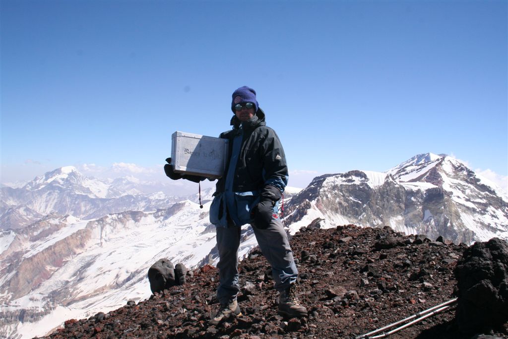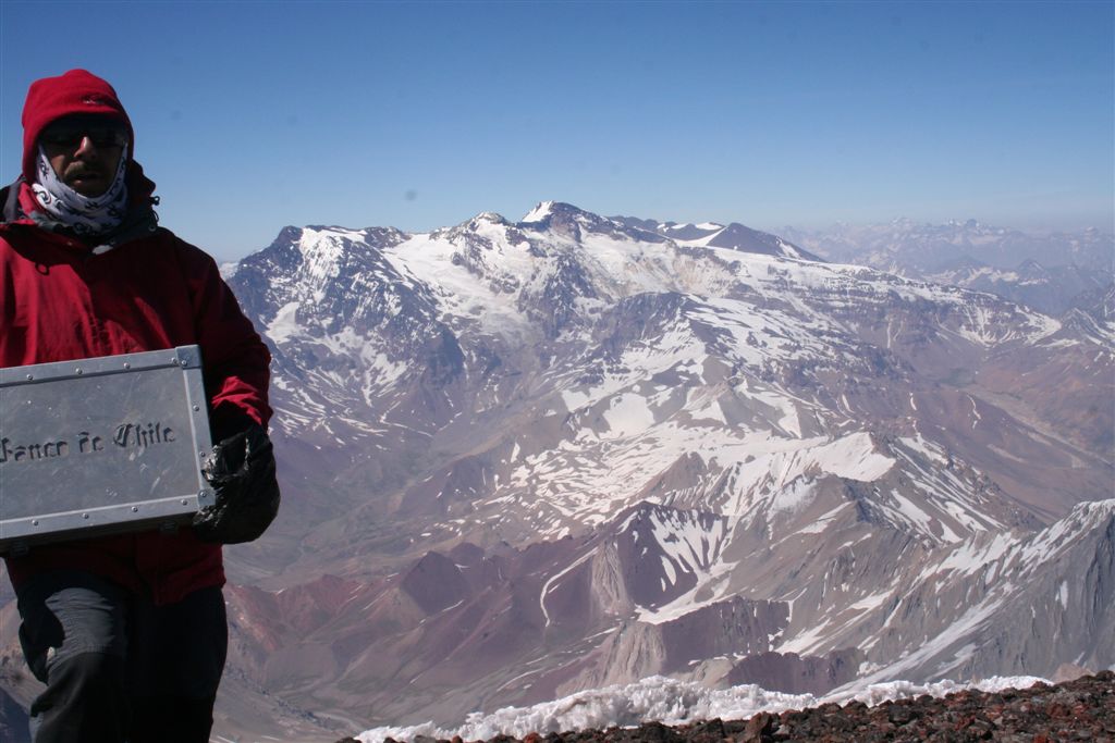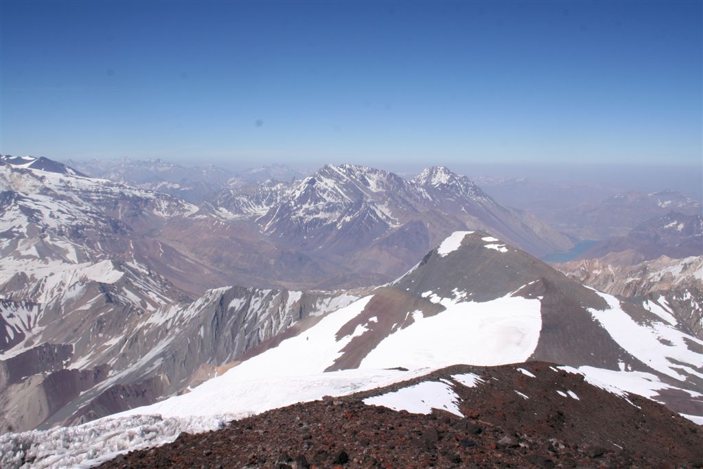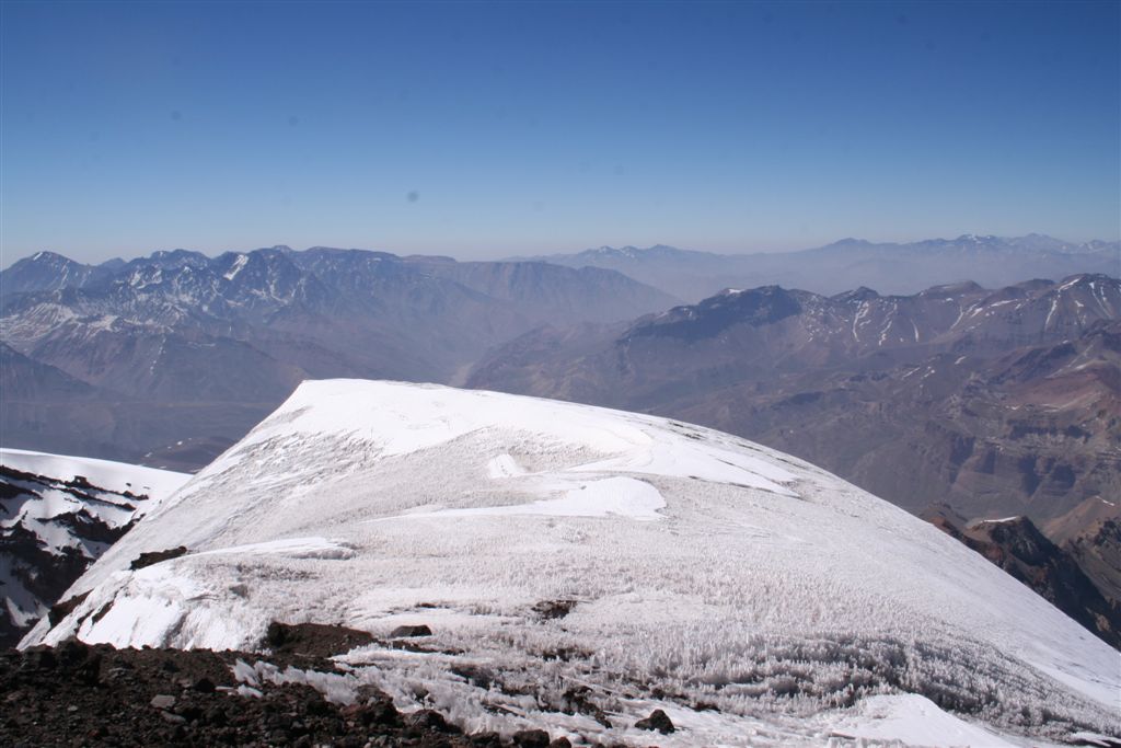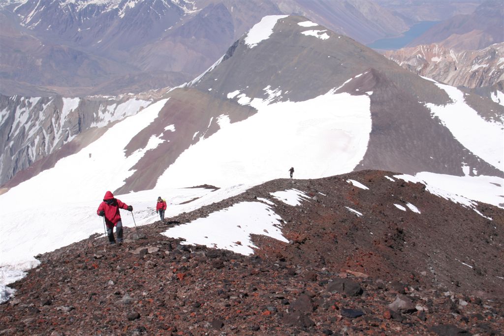 Am ca. 500 m langen Gipfelgrat denn ich aufgrund des starken Winds in der Ostflanke begehe, treffe ich mich mit Alvaro kurz vor dem Gipfel, gemeinsam erreichen wir zum ersten Mal überhaupt einen Anden Summit, gegen 11.45 Uhr stehen wir nach 2 ½ Std. und 615m Anstieg auf dem 5545m Hohen Pyramid. Von hier aus genießen wir zum ersten Mal einen Blick auf denn mächtigen Felsklotz des 6000 er Marmolejo. So langsam trudelt einer nach dem anderen ein. Die zwei Mädels sind noch nicht in Sichtweite, so begebe ich mich auf denn Weg, um nach denn beiden zusehen, die ich bald treffe, voller Stolz erreichen wir gemeinsam das Tagesziel, Lisas erster Gipfel über 5000m Höhe. Nach unzähligen Fotos, bei Super Fernsicht verewigen wir uns in dem unter einem Stein in Folie verpacktem Gipfelbuch. Im Abstieg nehme ich mich der Lisa an, um ihr noch so einige Techniken beizubringen, an dieser Stelle möchte ich feststellen, das dass Schuhwerk einiger Teilnehmer, auch die von Jens absolut nicht für dass Höhenbergsteigen geeignet sind, kaum Sicherheit für denn Fuß im speziellen für den Knöchel!Im Abstieg begegnen wir Ernst und Richard die schon sehr früh auf ca.4600 m gestarrten waren, allein bis zu unserem Camp waren sie 2 ½ Std. unterwegs! Die Zeit im etwas windstillen Lager nützen wir zum Waschen, soweit es in diesem verdammt kalten Wasser (wenige Minuten zuvor waren es ja noch Schneekristalle) eben möglich war. Am spätnachmittag gesellen sich unsere glückstrahlenden Nachzügler zu uns. Es sei erwähnt, das der geplante Schneebedeckte und vergletscherte 5000er Trono, ein echtes Highlight, eigentlich für denn nächsten Tag geplant war, aufgrund der bereits erwähnten Aufstiegs Ereignisse, dem Zeitplan zum Opfer viel. Unsere volle Konzentration galt nun dem Piuquenes ein wenig begangener, abseits des bekannten Tupungato liegender Riese. Nach einem für uns dos Alemanos erholsamen Tag, überließen wir die Küche Alvaro, der obligatorischen Suppe, folgte Reis mit Thunfisch dazu gab es die letzten Traumhaft guten Tomaten.