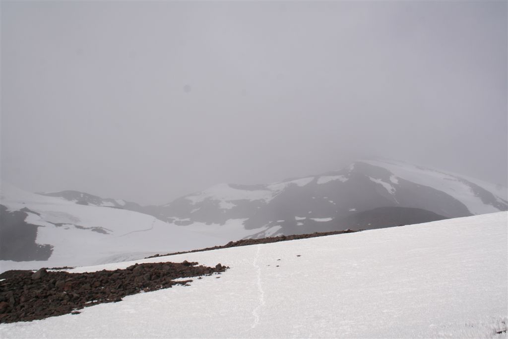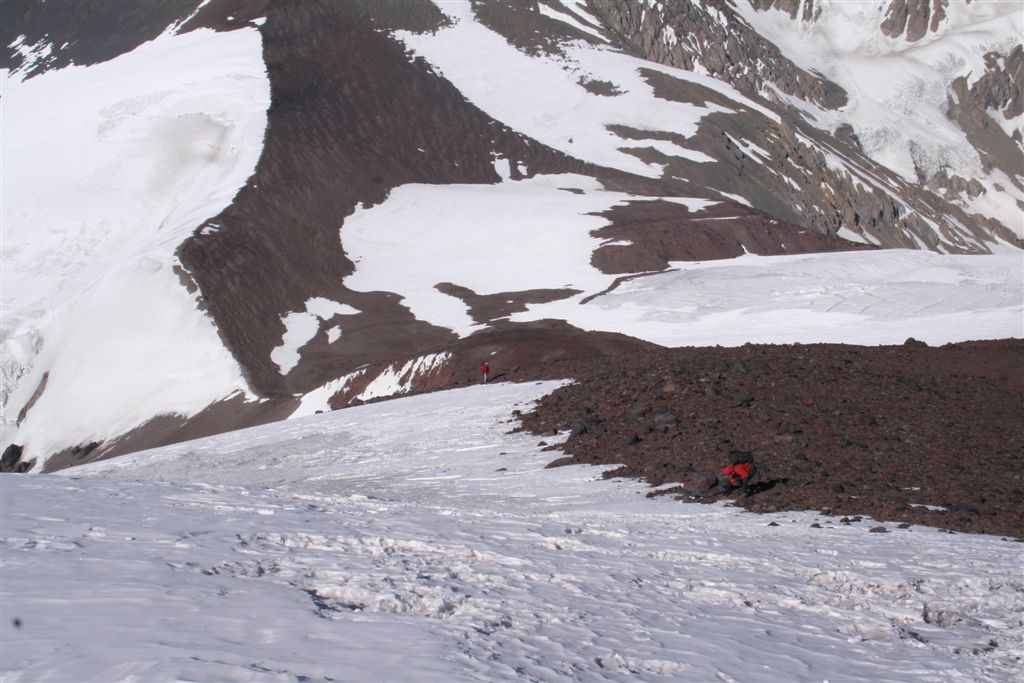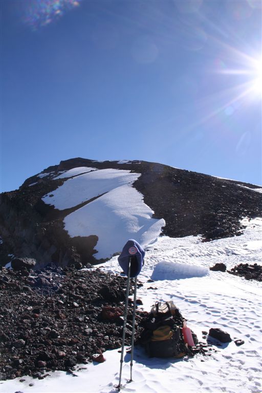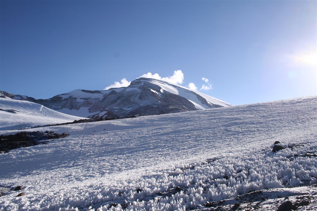 Mittwoch gegen 8.00 Uhr,gibt uns Alvaro das abgesprochene Signal zum Teekochen, selbstverständlich im Zelt, das durch die Feuchtigkeit insbesondere durch denn Atem erzeugt absolut vereist war, trotz eines geöffneten Reisverschlusses, sowohl vom innen und außen Zelt. Nach dem Genuss von Tee, Schokolade sowie Keksen, verlassen wir um 8.30 Uhr die tauende Tropfsteinhöhle. Bei regem Lagerleben werden die Schlafsäcke zum Trocknen ausgelegt, gemeinsam mit Jens verstauen wir etwas Proviant in einem Rucksack, alle anderen tragen je ein Gepäckstück, auf die Frage warum ein jeder seinen eigenen Rucksack der ja doch so ca.2 Kg wiegt trägt? War die Antwort, es sei so üblich wegen Wetter und so. Was passiert wenn es wirklich so kommen sollte, geht dann jeder seinen eigenen Weg? 9.15 Uhr, mit einem Vamos starten 8 Gipfelhungrige einem neuen Abenteuer entgegen. Nach einer kurzen „Plateau“ Querung, erreichen wir die nun ca.30° sehr lose Nordflanke, in einem stetigen mühevollen 1 Schritte nach oben und etwas zurück, quälen sich die Abenteurer gen Gipfel, jetzt zeigt sich Wille, Stärke und Anpassung, Lisa kämpft heftig, Jens machen Atemprobleme zu schaffen. Alvaro hält Anschluss, Beatriz und Gonzalo bleiben im größeren Abstand dran. Nach einer ersten kleineren Versorgungs- und Pinkelpause in der jetzt Ostflanke, macht sich Alvaro unbemerkt auf und davon, bald schon habe ich ihn teilweise kletternd auf einer etwas Südlichen Route,wenn man davon sprechen kann, Höhengleich erreicht, und passiert. Dieser Aufstieg ist im Prinzip bei Wahl einer einfachen Route unkompliziert, es bestand daher kein zwang gemeinsam diesen Anstieg zu begehen.