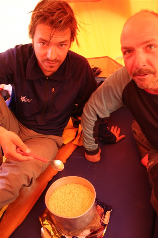 Nach dem befreien des Wasserlaufs von Eis werden die Töpfe befüllt. Ja dies war der beste Lagerplatz weit und breit. Langsam machen wir uns Sorgen um die Chicas. Alvaro und ich kurz dahinter folgt Amin, gehen zurück, wobei der Kamerad mir nicht folgen kann, bald kann ich die beiden ausmachen, mit wildem zurufen werden die beiden aufmerksam, wenige Min. später und sie wären auf dem Weg nach oben, uns ziemlich sicher aus denn Augen geraten, ja das war Rettung in höchster Not! Noch ein Schneefeld galt es zu queren und die beiden hübschen Mädels stehen mit strahlenden Augen vor mir. Franziska deutet an dass ich nicht ihres, sondern das Gepäck von Lisa aufnehmen sollte, gesagt getan, landete der deutlich „leichtere“ Rucksack auf dem Rücken und los ging’s. Alsbald trafen wir auf Amin der sich dem zweite Gepäckstück annahm. Unter letzter Kraftaufwendung aber überglücklich erreichen sie das eigentlich „nur“ 530 m höher liegende Hochlager. Alvaro übermittelte via Satelliten Telefon unsere Koordinaten die mein GPS ermittelte. *Eigentlich war geplant, dass eben diese Expedition im Internet unter „Expe News“ die eben auch dafür das Gerät zurverfügung stellte, verfolgt werden konnte. Bedingt durch das Eintreffen von Nachrichten der Angehörigen oder Freunde der Teilnehmer, wurde Alvaro beim erstellen der Infos gestört bzw. die eingegeben Daten gelöscht, dazu bedingt durch eben die Kälte, bereiteten die Akkus ständig Probleme. So blieb es letztendlich bei einer sehr abgespeckten Information. Bei einem gemeinsamen Austausch, legen wir die Startzeit zum ersten großen Gipfel dem Pyramid auf 9.00 Uhr fest. Eine windgeschützte Kochstelle wurde mittels Steinplatten neben dem Zelt errichtet, wenig später war eine mit Nudeln und Knobi verstärkte Beutelsuppe gekocht, zum Abendessen gab es Nudeln mit Hackfleischsoße und Würstel. Jens kredenzte zum Ausklang des Tages einen guten Kamillentee dazu eine große Tafel leckerer Schokolade. Bevor die Sonne hinter denn Bergen um 20.10 Uhr verschwand, lagen wir schon gebettet, noch war es aber Tag Hell! Über unserem Basislager schwebten in der Nacht Wolken der Glückseligkeit! Wie schon am Vortag herrschte eine Aussentemperatur von -14°C bedingt durch das höhere Lager eben von über 500 m war es eigentlich (Wärmer als Tag zuvor)*Ca. 150 m Höhendifferenz entsprechen in etwa eine Differenz von 1° C.