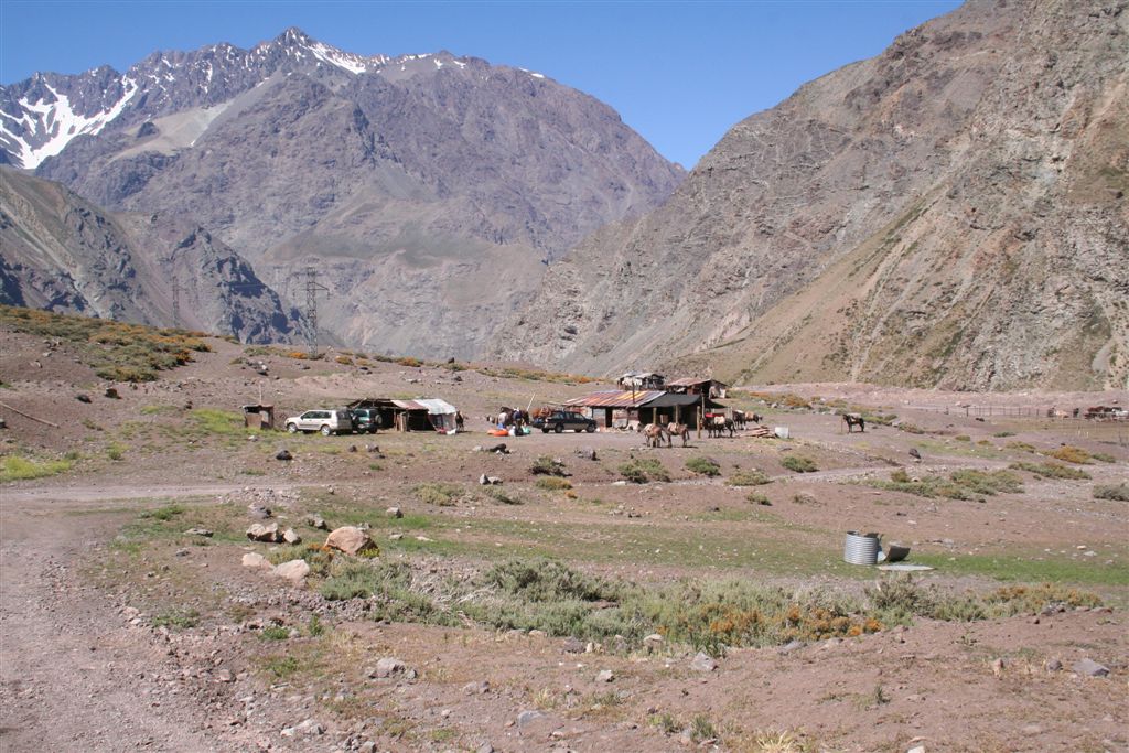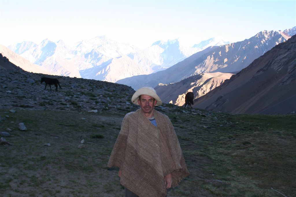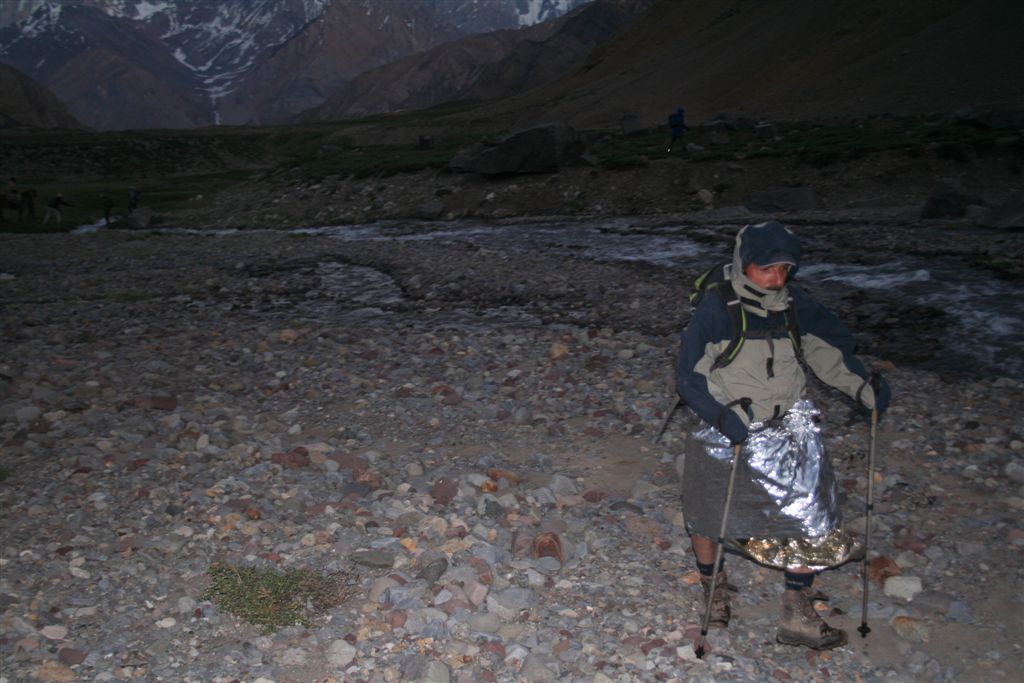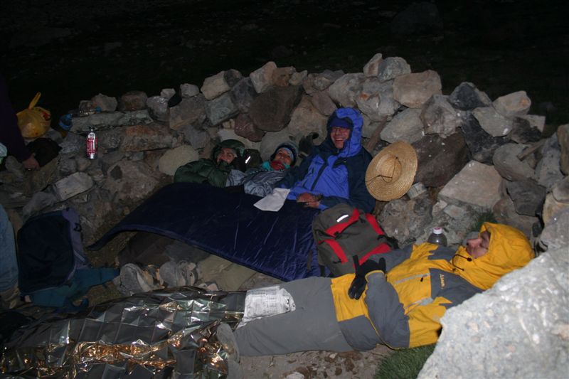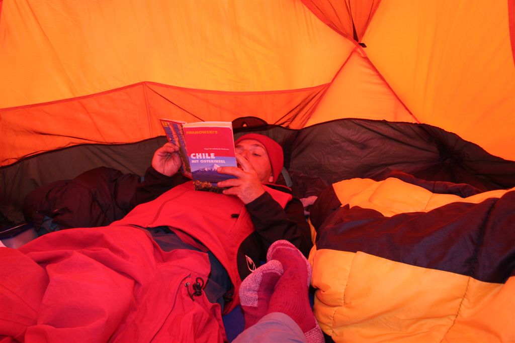 Langsam verschwand die Sonne hinter denn hohen Bergen, es wurde zunehmend kühler. Schnell stellte sich heraus das die Chilenen ausgerüstet waren, nicht das sie nur Essen dabei hatten, nein!! Im Tagesrucksack befand sich auch noch das nötige Textil, wir hingegen standen im wahrsten Sinn des Wortes (Nackt) kurz bekleidet in weiter Flur, mit allem war zurechnen, aber doch nicht mit so etwas. Um nicht auszukühlen, bewegten wir uns im kleinen Radius um unser Quartier. Der der noch etwas zum Essen im Gepäck hatte verteilte es Familiär, ja Jens bekam eine Jacke, und ich verschwand in einer etwas zu großen Hose. Mit dem Einbruch der Nacht gab’s noch zwei Rucksack Hüllen und eine dünne Decke, die letzten Kekse wurden reihum verteilt. Wir kuschelten uns so gut es ging aneinander, Jens steckte die Füße in seinen Rucksack, die anderen behalfen sich mit Rettungs- Decken und Isomatten als Abdeckung. Die Kuhfladen auf denen ich gebettet war, bildete eine brauchbare Bodendämmung. Ja die Stimmung war denn Verhältnissen entsprechend gut, Kein Wehklagen oder jammern für uns verwöhnte Europäer schier unglaublich.