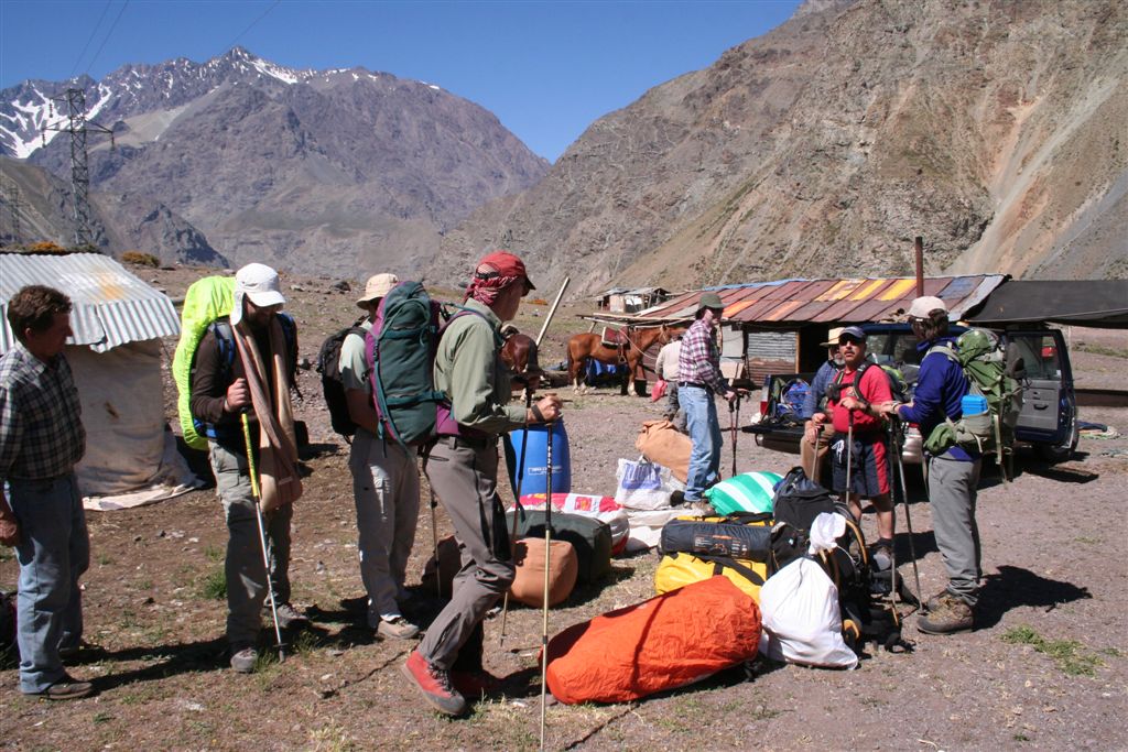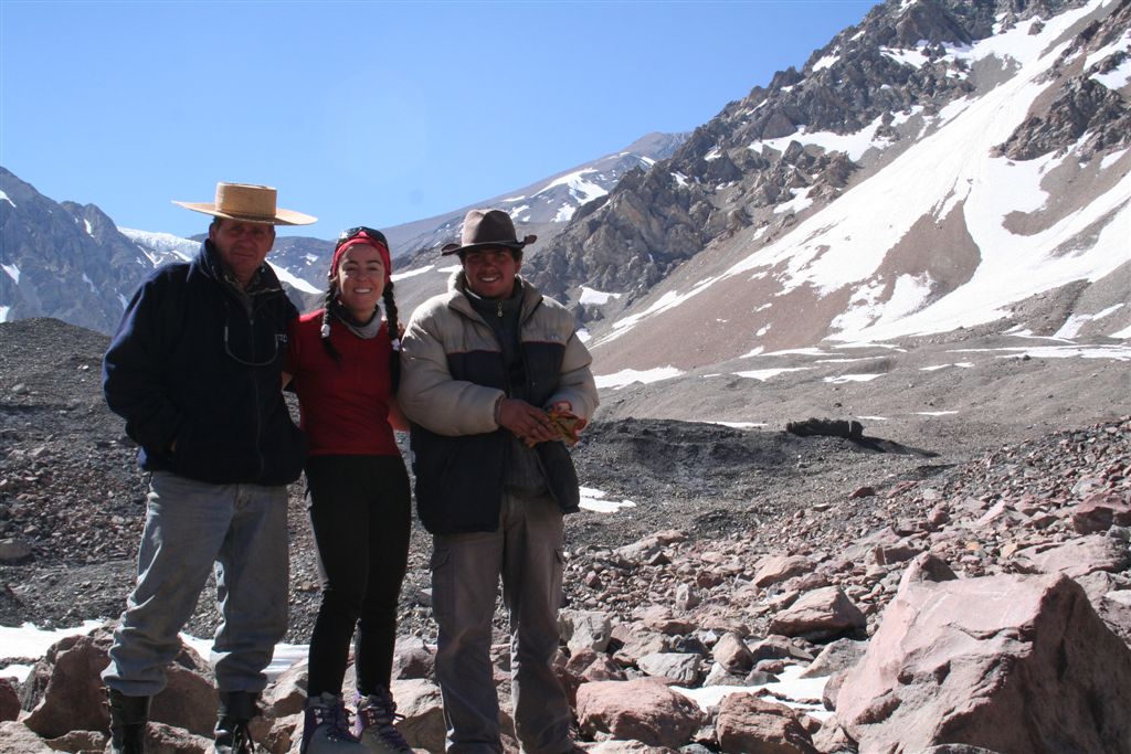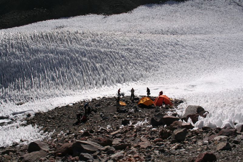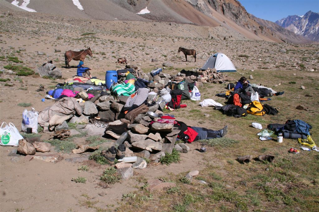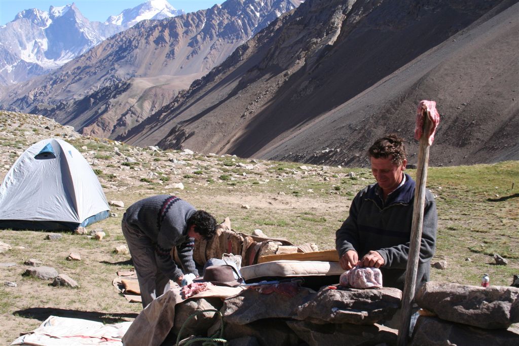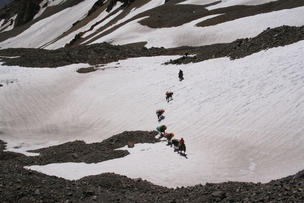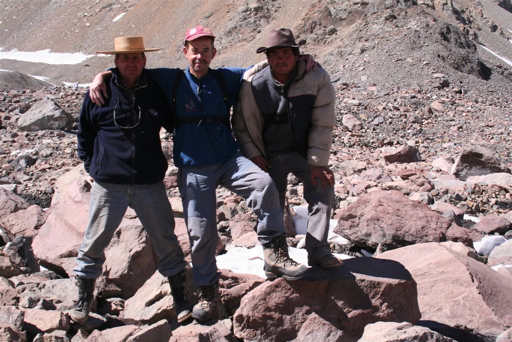 Mein unglaublicher Sinn für Wahrnehmungen, schlug gegen 22.00 Uhr an, in Richtung der morgigen Etappe nehme ich Lichtzeichen wahr, ich informiere mit einem Ruf „Licht“ die anderen und tatsächlich folgt ein weiteres Signal, schnell kommt Euphorie auf, die Lichtzeichen werden erwidert, jetzt ist wohl bekannt wo das Lager steht, aber mit Hilfe ist nicht zurechnen! es wäre für die Tiere zu gefährlich das unwegsame Gelände eben bei Nacht zu begehen. Dies war uns schnell bewusst. Nachdem wir uns längst wieder in die kalte Nacht gelegt hatten. Wie Phönix aus der Asche stand plötzlich Claudio vor dem Lager. In einer etwas lauten aber nicht aggressiven Diskussion konnte das Problem zwar nicht gelöst werden, es handelte sich um ein Missverständnis, na ja wenn sonst nichts ist!! Jedenfalls lies er mir seinen Poncho zurück, der für mich so etwas wie die Rettung bedeutete. Durch das „Kopf loch“ drang zwar Kälte an denn Körper aber durch die Fläche die er bedeckte war dies eher gering. Ein jeder versuchte zur Ruhe zukommen, aber für einen Schlaf war es einfach zu unangenehm, es kam immer wieder zu kleineren Unterhaltungen, und eben zu stetigen Drehbewegungen des Körpers und dies bei engem aneinander! Ja diese Nacht bei 2 Grad und einem traumhaften von Millionen Sternen geprägten Himmelzelt, bleibt wohl allen unvergessen. Langsam werden die Sterne unsichtbar, noch wird es nicht wahrgenommen aber die Sonne naht. Noch vor Anbruch der Dämmerung stehen wir, ich jedenfalls mit eisigen Füßen auf! Claudio kommt auch schon angeritten, ruck zuck ist das Equipment verstaut, es geht los! Ein erster Bach wird gequert, wobei einige nasse Füße bekommen, die Mädels werden von Claudios Pferd übergesetzt, über ein sehr breites ansteigendes Flussbett, erreichen die ersten nach 2.Std. das von Claudio gewählte, sich noch im Schatten befindende Camp auf 3502m. (Ein Anstieg wäre am Vortag bis hier wohl möglich gewesen, da uns der Aufenthalt der Tiere nicht bekannt war, war ein Risiko sich zu verfehlen einfach zu hoch). Am Lagerfeuer konnte ich mich dann wenigstens etwas erwärmen. Gegen 9.15 Uhr erreichten die ersten Sonnenstrahlen das stark angeschlagene „Team“ Es herrscht ein emsiges Treiben, überall surren Kocher, Gepäck wird umgeschichtet ein echt typisches Lagerleben eben. Wir nützen die Zeit zu einem Schläfchen um 13.00 Uhr soll’s weitergehen, schon kurz nach zwölf kommt Bewegung auf, ja wir wollen und müssen nach oben. Punkt 13.00 Uhr gibt Alvaro das Signal „Vamos“ das so viel heißt wir gehen. Die Mulli Treiber benötigen jetzt eine Std. für das bepacken der Esel. Hier oben sind zwar im Sand spuren auszumachen, aber die wenigen Steinmännchen hier „Monolith“ genannt „sprechen“ eine deutlichere Sprache. Über eine erste Hochfläche geht’s abwärts zum Estero Museo dem rechts haltend „Orografisch“ Links entlang gefolgt wird, auf 3800m verliert sich dann die Spur unter dem Schnee, der über die Flanken zu Tal ging, wie ein Spürhund geht’s flott Bergan, eine deutliche Spur zurücklassend, befinde ich mich auf dem richtigen Weg, wie dies ein von weitem Großer Monolith beweist, der nun angesteuert wird, hier wird erstmals verweilt, irgendwann taucht Jens fast wie aus dem nichts hinter denn Schuttbergen inmitten des Gletschers auf, wenig später erscheinen die Tiere, ja die Teilnehmer sind platt, wir werden inmitten zweier kleiner Seen das Lager erstellen, alsbald sind die Tiere abgeladen, 5 Zelte markieren unser Camp, Oskar Gonzales der Spanier blieb ohne unser Wissen zurück, er wird von einem der Treiber später ins Tal gebracht. Team BRD versorgt die Mannschaft mit geschmolzenem Schnee. Alvaro unterbreitet mir hier das Angebot die Expedition zuleiten, lehne aber dankend ab, es wäre mir wohl eine Ehre, eine Expedition zuleiten, aber dafür sollten Ortskenntnisse die Teilnehmer und eben das ganze Drumherum schon weit im Vorfeld abgecheckt sein, Rechtlich (Versicherungstechnisch)gesehen ganz zu schweigen. Jedenfalls versicherte ich ihm, so oder so für das Gelingen dieses Unternehmen alles machbar Mögliche beizutragen. Eine Suppe wird geköchelt, Schinkennudeln und ein Cristal (ein sehr gutes Bier) krönen denn Tag bei Traumwetter. Mo.11.Jan. 0°C Temp. im 3 Mann Zelt von Alvaro, ein warmer Schlafsack, dies Nacht war eine geniale Erholung, auf doch schon über 4000m, wie geht es wohl denn anderen? die Mädels waren auch schon am Berg tätig? sind wir stark genug für die kommenden Aufgaben? Gegen ½ 9 erscheinen die ersten Sonnen Strahlen über dem Gipfel Grat, schon 10 Min. später verlassen wir unsere „Luxusherberge“. Teewasser abkochen, dazu ein guter Kuchen aus Old Germany, sollten Moral und Kraft für das kommende geben. Eine Std. früher als vereinbart, taucht Claudio zur letzten Etappe mit nur noch 4 Tieren auf. Punkt 11 geht’s los, über Schutt und Steine geht es von einem Hügel zum nächsten, noch sind es Schneefelder, doch alsbald wird dieser von Penidentes abgelöst, auf 4200 m zweifeln wir ein erstes mal, ob die Esel mit ihren doch kleinen Hufen im nicht richtig verfestigten Schnee einsinken werden, ja wir lagen nicht ganz falsch Claudio versucht es zwar, aber es gibt kein durchkommen für die gewichtigen 4 Beinern, ich machte mir noch ein Späßchen mit dem Treiber, über das etwas zu kleine Schuhwerk seiner Tiere, das dann übersetzt für gute Stimmung sorgte, aber letztendlich war ab jetzt der Bergsteiger für sein Gepäck verantwortlich. Es galt nun aus dem Sortiment die Lebensmittel für die nächsten 5 Tage auszusortieren, wobei sich zwei Dosen Bier sogleich im Magen von uns Alemanos wieder fanden, leider ging ½ L. Vino im Tetra Pack auf dem Rücken der Tiere zu Bruch. Eine Std. später erklang das Vamos. Irgendwann habe ich die Truppe erreicht und in der ersten Flanke überholt, oben angekommen wird uns nach einem intensiven erforschen der Aufstiegsflanke klar, das uns die Büßer den weiteren Aufstieg deutlich erschweren