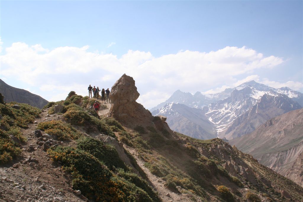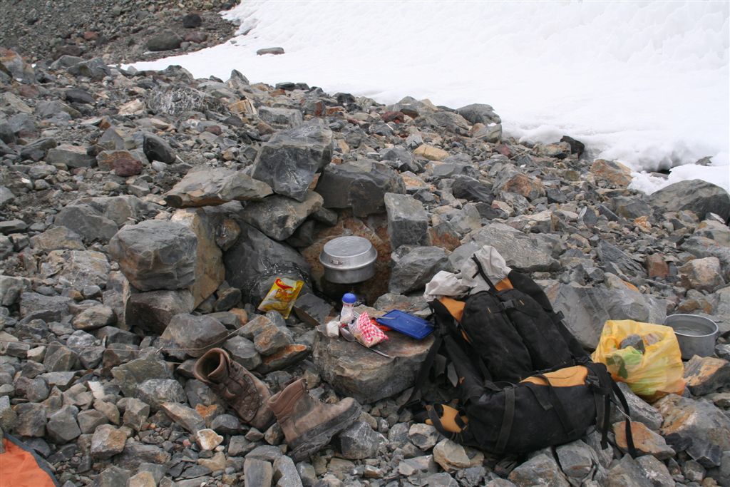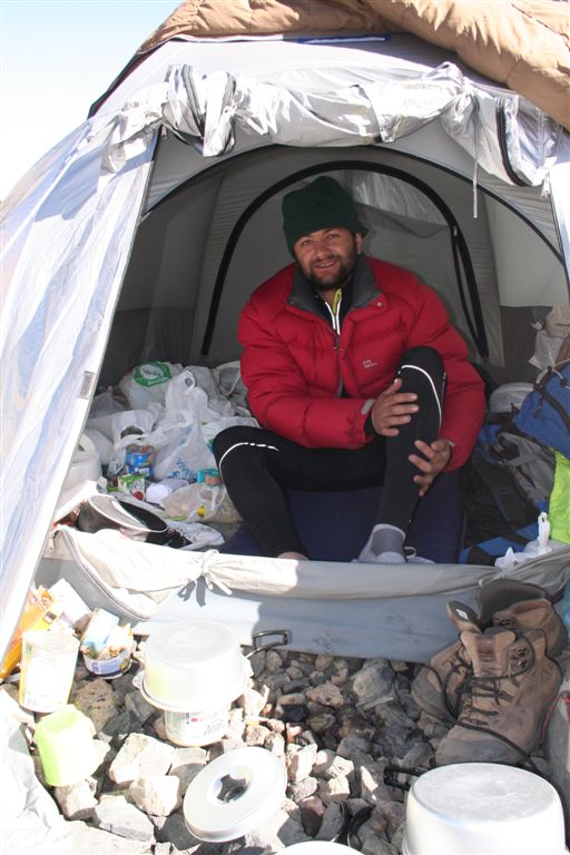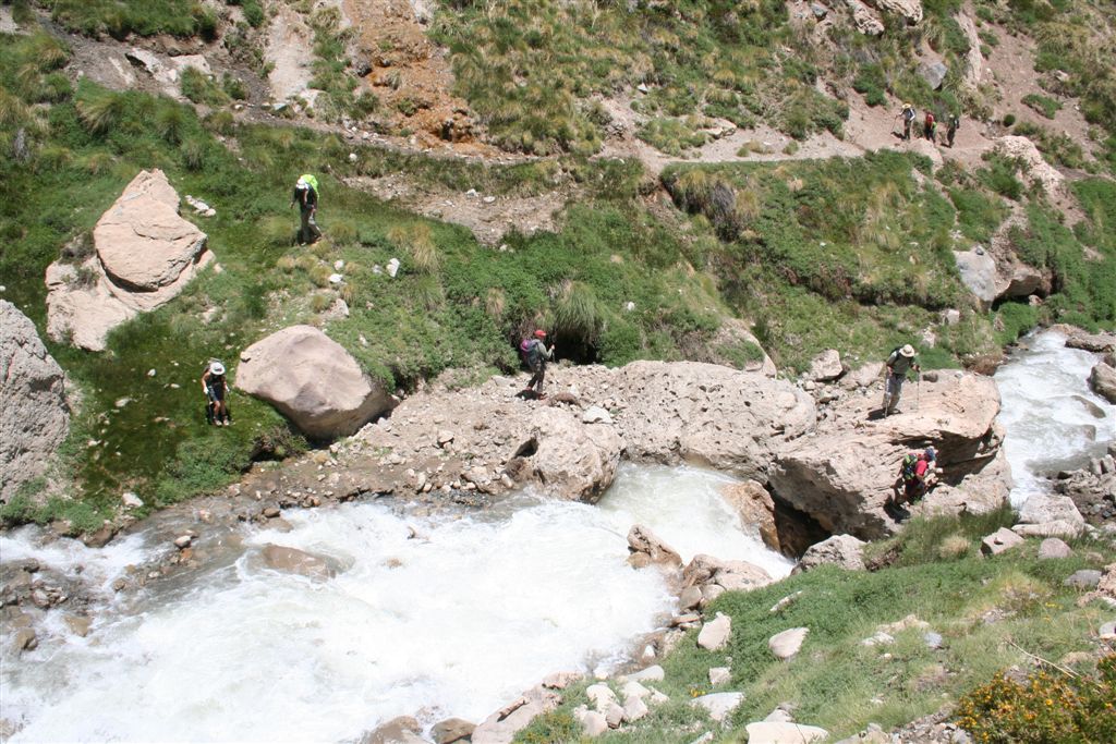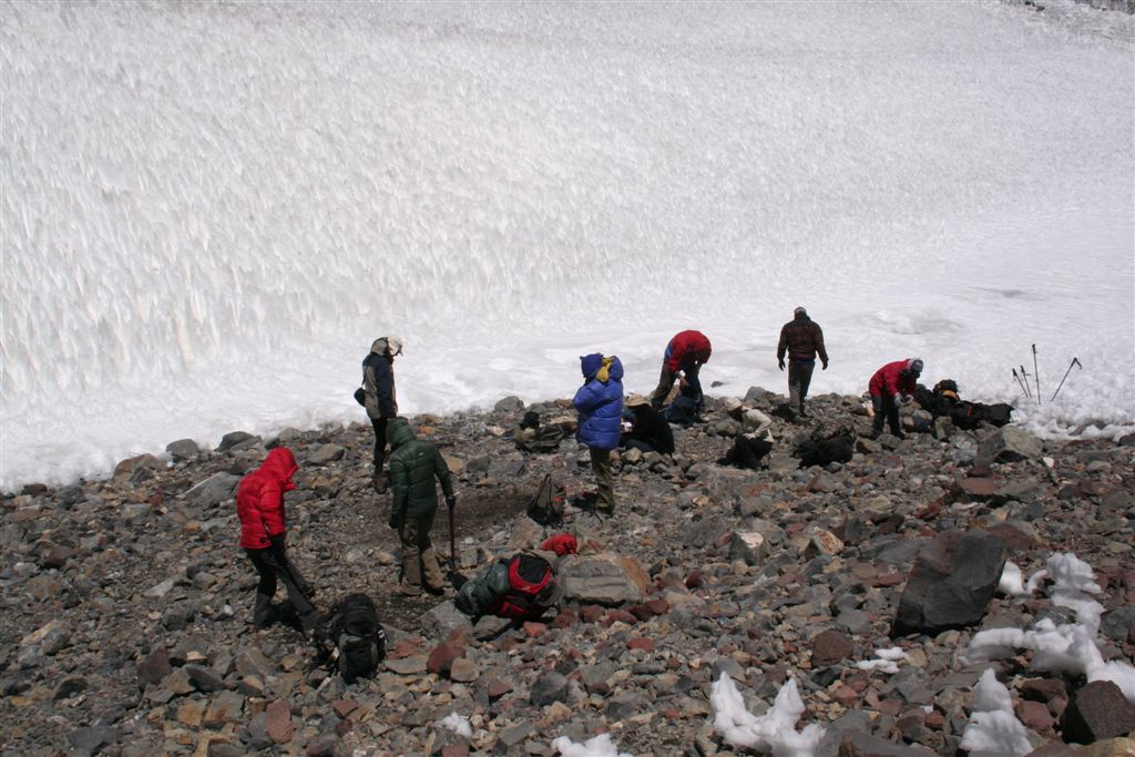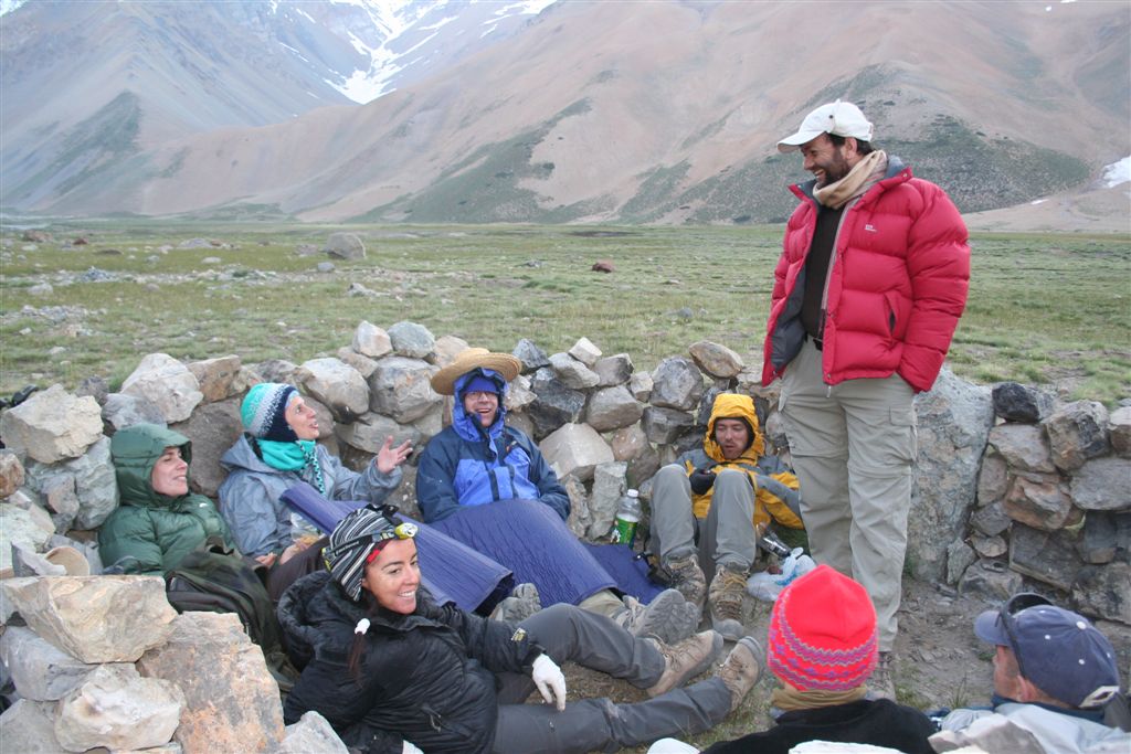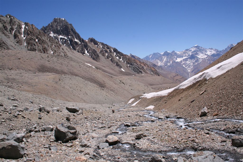 Mein unglaublicher Sinn für Wahrnehmungen, schlug gegen 22.00 Uhr an, in Richtung der morgigen Etappe nehme ich Lichtzeichen wahr, ich informiere mit einem Ruf „Licht“ die anderen und tatsächlich folgt ein weiteres Signal, schnell kommt Euphorie auf, die Lichtzeichen werden erwidert, jetzt ist wohl bekannt wo das Lager steht, aber mit Hilfe ist nicht zurechnen! es wäre für die Tiere zu gefährlich das unwegsame Gelände eben bei Nacht zu begehen. Dies war uns schnell bewusst. Nachdem wir uns längst wieder in die kalte Nacht gelegt hatten. Wie Phönix aus der Asche stand plötzlich Claudio vor dem Lager. In einer etwas lauten aber nicht aggressiven Diskussion konnte das Problem zwar nicht gelöst werden, es handelte sich um ein Missverständnis, na ja wenn sonst nichts ist!! Jedenfalls lies er mir seinen Poncho zurück, der für mich so etwas wie die Rettung bedeutete. Durch das „Kopf loch“ drang zwar Kälte an denn Körper aber durch die Fläche die er bedeckte war dies eher gering. Ein jeder versuchte zur Ruhe zukommen, aber für einen Schlaf war es einfach zu unangenehm, es kam immer wieder zu kleineren Unterhaltungen, und eben zu stetigen Drehbewegungen des Körpers und dies bei engem aneinander! Ja diese Nacht bei 2 Grad und einem traumhaften von Millionen Sternen geprägten Himmelzelt, bleibt wohl allen unvergessen. Langsam werden die Sterne unsichtbar, noch wird es nicht wahrgenommen aber die Sonne naht. Noch vor Anbruch der Dämmerung stehen wir, ich jedenfalls mit eisigen Füßen auf! Claudio kommt auch schon angeritten, ruck zuck ist das Equipment verstaut, es geht los! Ein erster Bach wird gequert, wobei einige nasse Füße bekommen, die Mädels werden von Claudios Pferd übergesetzt, über ein sehr breites ansteigendes Flussbett, erreichen die ersten nach 2.Std. das von Claudio gewählte, sich noch im Schatten befindende Camp auf 3502m. (Ein Anstieg wäre am Vortag bis hier wohl möglich gewesen, da uns der Aufenthalt der Tiere nicht bekannt war, war ein Risiko sich zu verfehlen einfach zu hoch). Am Lagerfeuer konnte ich mich dann wenigstens etwas erwärmen. Gegen 9.15 Uhr erreichten die ersten Sonnenstrahlen das stark angeschlagene „Team“ Es herrscht ein emsiges Treiben, überall surren Kocher, Gepäck wird umgeschichtet ein echt typisches Lagerleben eben. Wir nützen die Zeit zu einem Schläfchen um 13.00 Uhr soll’s weitergehen, schon kurz nach zwölf kommt Bewegung auf, ja wir wollen und müssen nach oben. Punkt 13.00 Uhr gibt Alvaro das Signal „Vamos“ das so viel heißt wir gehen. Die Mulli Treiber benötigen jetzt eine Std. für das bepacken der Esel. Hier oben sind zwar im Sand spuren auszumachen, aber die wenigen Steinmännchen hier „Monolith“ genannt „sprechen“ eine deutlichere Sprache. Über eine erste Hochfläche geht’s abwärts zum Estero Museo dem rechts haltend „Orografisch“ Links entlang gefolgt wird, auf 3800m verliert sich dann die Spur unter dem Schnee, der über die Flanken zu Tal ging, wie ein Spürhund geht’s flott Bergan, eine deutliche Spur zurücklassend, befinde ich mich auf dem richtigen Weg, wie dies ein von weitem Großer Monolith beweist, der nun angesteuert wird, hier wird erstmals verweilt, irgendwann taucht Jens fast wie aus dem nichts hinter denn Schuttbergen inmitten des Gletschers auf, wenig später erscheinen die Tiere, ja die Teilnehmer sind platt, wir werden inmitten zweier kleiner Seen das Lager erstellen, alsbald sind die Tiere abgeladen, 5 Zelte markieren unser Camp, Oskar Gonzales der Spanier blieb ohne unser Wissen zurück, er wird von einem der Treiber später ins Tal gebracht. Team BRD versorgt die Mannschaft mit geschmolzenem Schnee. Alvaro unterbreitet mir hier das Angebot die Expedition zuleiten, lehne aber dankend ab, es wäre mir wohl eine Ehre, eine Expedition zuleiten, aber dafür sollten Ortskenntnisse die Teilnehmer und eben das ganze Drumherum schon weit im Vorfeld abgecheckt sein, Rechtlich (Versicherungstechnisch)gesehen ganz zu schweigen. Jedenfalls versicherte ich ihm, so oder so für das Gelingen dieses Unternehmen alles machbar Mögliche beizutragen. Eine Suppe wird geköchelt, Schinkennudeln und ein Cristal (ein sehr gutes Bier) krönen denn Tag bei Traumwetter. Mo.11.Jan. 0°C Temp. im 3 Mann Zelt von Alvaro, ein warmer Schlafsack, dies Nacht war eine geniale Erholung, auf doch schon über 4000m, wie geht es wohl denn anderen? die Mädels waren auch schon am Berg tätig? sind wir stark genug für die kommenden Aufgaben? Gegen ½ 9 erscheinen die ersten Sonnen Strahlen über dem Gipfel Grat, schon 10 Min. später verlassen wir unsere „Luxusherberge“. Teewasser abkochen, dazu ein guter Kuchen aus Old Germany, sollten Moral und Kraft für das kommende geben. Eine Std. früher als vereinbart, taucht Claudio zur letzten Etappe mit nur noch 4 Tieren auf. Punkt 11 geht’s los, über Schutt und Steine geht es von einem Hügel zum nächsten, noch sind es Schneefelder, doch alsbald wird dieser von Penidentes abgelöst, auf 4200 m zweifeln wir ein erstes mal, ob die Esel mit ihren doch kleinen Hufen im nicht richtig verfestigten Schnee einsinken werden, ja wir lagen nicht ganz falsch Claudio versucht es zwar, aber es gibt kein durchkommen für die gewichtigen 4 Beinern, ich machte mir noch ein Späßchen mit dem Treiber, über das etwas zu kleine Schuhwerk seiner Tiere, das dann übersetzt für gute Stimmung sorgte, aber letztendlich war ab jetzt der Bergsteiger für sein Gepäck verantwortlich. Es galt nun aus dem Sortiment die Lebensmittel für die nächsten 5 Tage auszusortieren, wobei sich zwei Dosen Bier sogleich im Magen von uns Alemanos wieder fanden, leider ging ½ L. Vino im Tetra Pack auf dem Rücken der Tiere zu Bruch. Eine Std. später erklang das Vamos. Irgendwann habe ich die Truppe erreicht und in der ersten Flanke überholt, oben angekommen wird uns nach einem intensiven erforschen der Aufstiegsflanke klar, das uns die Büßer den weiteren Aufstieg deutlich erschweren