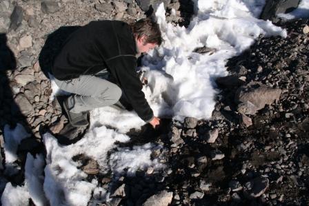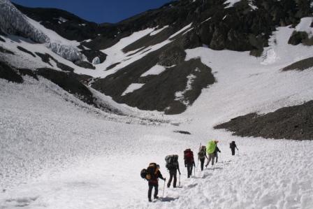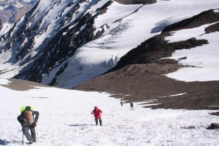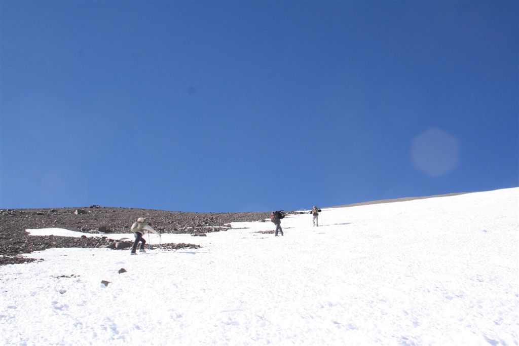 Mittwoch gegen 8.00 Uhr,gibt uns Alvaro das abgesprochene Signal zum Teekochen, selbstverständlich im Zelt, das durch die Feuchtigkeit insbesondere durch denn Atem erzeugt absolut vereist war, trotz eines geöffneten Reisverschlusses, sowohl vom innen und außen Zelt. Nach dem Genuss von Tee, Schokolade sowie Keksen, verlassen wir um 8.30 Uhr die tauende Tropfsteinhöhle. Bei regem Lagerleben werden die Schlafsäcke zum Trocknen ausgelegt, gemeinsam mit Jens verstauen wir etwas Proviant in einem Rucksack, alle anderen tragen je ein Gepäckstück, auf die Frage warum ein jeder seinen eigenen Rucksack der ja doch so ca.2 Kg wiegt trägt? War die Antwort, es sei so üblich wegen Wetter und so. Was passiert wenn es wirklich so kommen sollte, geht dann jeder seinen eigenen Weg? 9.15 Uhr, mit einem Vamos starten 8 Gipfelhungrige einem neuen Abenteuer entgegen. Nach einer kurzen „Plateau“ Querung, erreichen wir die nun ca.30° sehr lose Nordflanke, in einem stetigen mühevollen 1 Schritte nach oben und etwas zurück, quälen sich die Abenteurer gen Gipfel, jetzt zeigt sich Wille, Stärke und Anpassung, Lisa kämpft heftig, Jens machen Atemprobleme zu schaffen. Alvaro hält Anschluss, Beatriz und Gonzalo bleiben im größeren Abstand dran. Nach einer ersten kleineren Versorgungs- und Pinkelpause in der jetzt Ostflanke, macht sich Alvaro unbemerkt auf und davon, bald schon habe ich ihn teilweise kletternd auf einer etwas Südlichen Route,wenn man davon sprechen kann, Höhengleich erreicht, und passiert. Dieser Aufstieg ist im Prinzip bei Wahl einer einfachen Route unkompliziert, es bestand daher kein zwang gemeinsam diesen Anstieg zu begehen.