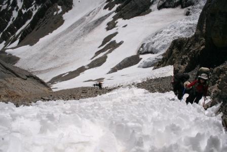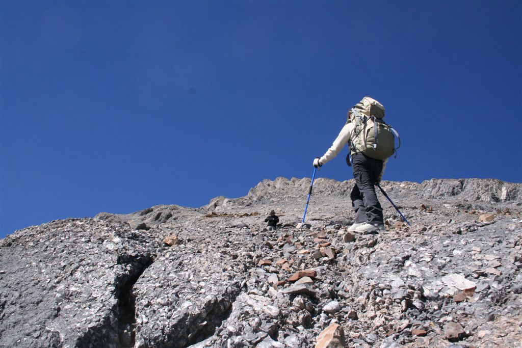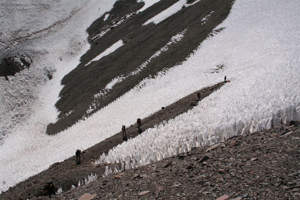 Jetzt setze ich ein Zeichen, taten müssen nun folgen! In wenigen Minuten im langsam steiler werdenden Gelände, erarbeite ich die Führung. Am Rand auf denn verfestigten Büßern und dem losem Gestein setze ich eine deutliche Spur, so nach dem Motto 2 Schritte hoch einer zurück, und tatsächlich folgt der Tross, ich bin in meinem Element, die Willensstärke sowie innere Kraft und ein großes Ziel vor Augen ziehen einen unbändig nach oben, immer größer wird die Distanz zwischen uns, zu gegebener Zeit halte ich inne, sie spüren da geht was, Automatismen spielen sich hier ab, instinktiv folgen sie ihrem „Leitwolf“, das ist Psychologie! alsbald wird ein erster Kamin erreicht, ein guter Platz für eine nötige Trink und Erholungspause, Bea erreicht als nächste diese Stelle, nach und nach schließen die anderen auf. Amin der Pakistani hatte sich selbstständig gemacht, er versucht über die Südseite des Hoch Tals eben das Ende diesem zu erreichen, mit seiner Leuchtgelben Rucksack Hülle konnte man ihn gut ausmachen. Das Eintreffen von Lisa war das Startsignal für denn Kamin, ja diese Passage erforderte nun die ganze Konzentration, teilweise Schnee und Eis, dazwischen lose Steine erfordern höchste Vorsichtig, ja keine Lawine auslösen unten warten die anderen. Trotz der ausgehenden Gefahr geht es recht flott nach oben, oh Graus!! in diesem losen Schutt auch noch nach links queren…unter aller größter Vorsicht. Ohne auch nur ein Steinchen gen Tal zuschicken enteile ich dieser giftigen Passage. Weiter oben halte ich inne, prima gegangen du „Sau Hund“ ich Lobe mich selbst. Alvaro kommt, Super! Eine gewisse Zeit halte ich Blickkontakt, die folgenden Felsen die teilweise um oder überklettert werden, verhindern eben denn Kontakt, ja das ist meine Welt! Ausdauer und Kraft einzusetzen! die mehr als 20 Kg Gepäck werden jetzt erst richtig wahrgenommen, bremsen auch spürbar denn Körper und Aufstieg stark ab! Wie geht es denn anderen solche Fragen gehen einem durch denn Kopf? Die Aufstiegsroute ist leider nicht mehr einzusehen. Wahrscheinlich das große Ziel vor Augen, werden allerseits letzte Kräfte freigesetzt. Ab jetzt gilt es links in Richtung des erkennbaren Wasserlaufs, der vom Joch zwischen Pyramid und dem Piuquenes fließt zu queren. Ohne auch nur einen Meter Umweg in Kauf zunehmen, „überschreite“ ich die einzelnen bis zu 150 m breiten Büßerfelder inmitten, “nichts kann mich mehr aufhalten“ als dann Amin im unteren Abschnitt des vereisten Wasserlaufs auftaucht, ist der für mich ausgemachte Lagerplatz fast schon greifbar. Gegen 14.40 Uhr ist das „Plateau“ eine relativ ebene Hochfläche auf 4930 m jubelnd erreicht. Mit geschultem Auge, wird ein idealer Zelt Untergrund nahe dem Rinnsal reserviert, und von ersten groben Steinen befreit. Als Amin unter einem Ur schrei, die bleibe für die nächste Tage ansteuert, spürt man förmlich dass wir alle zusammengehören. Mit einem herzlichen Shake Hands gratulieren wir uns gegenseitig zu einer harten Etappe. Bei starkem Westwind unterstütze ich denn „Wilden Mann“ diesen Namen bekam er von mir durch seine Raue und irgendwie eigenwillige Art, aber als absoluter Teamplayer, beim eben erschwerten Aufbau des Zeltes. 1 Std. nach meiner Ankunft erreicht Alvaro danach Jens gefolgt von Gonzalo und Beatriz Camp 4.Rasch wird das Zelt er und eingerichtet.