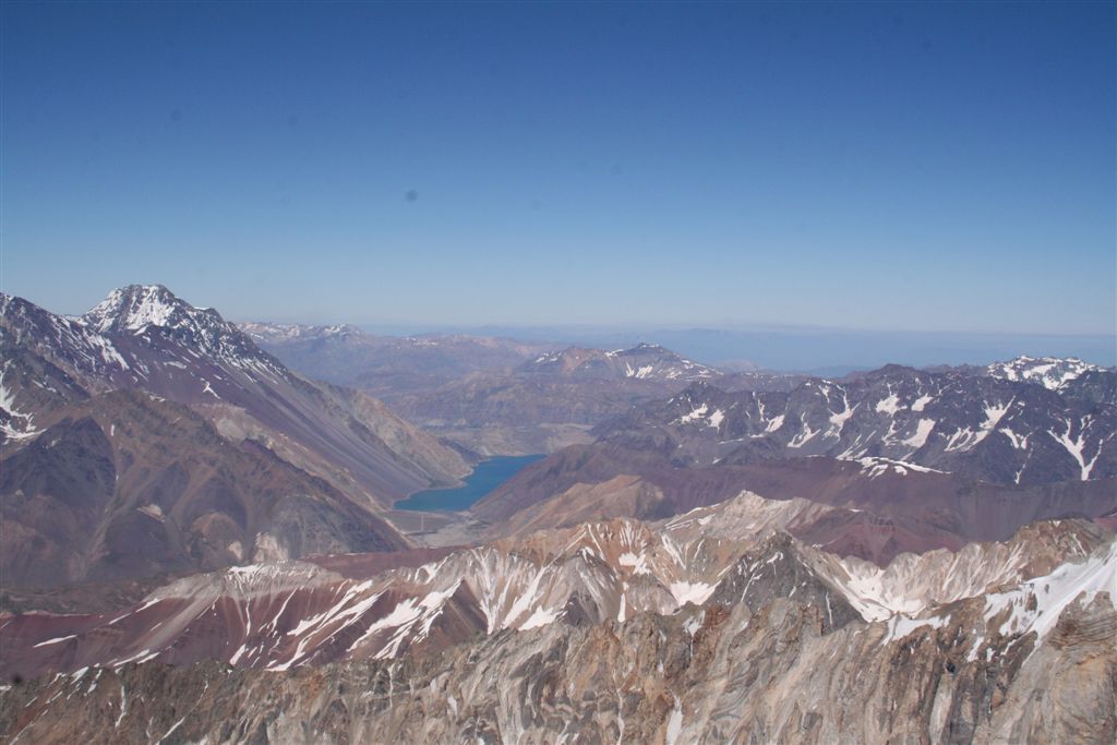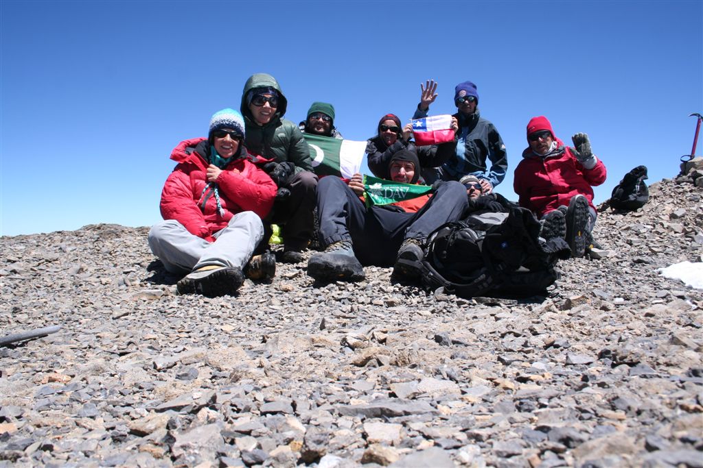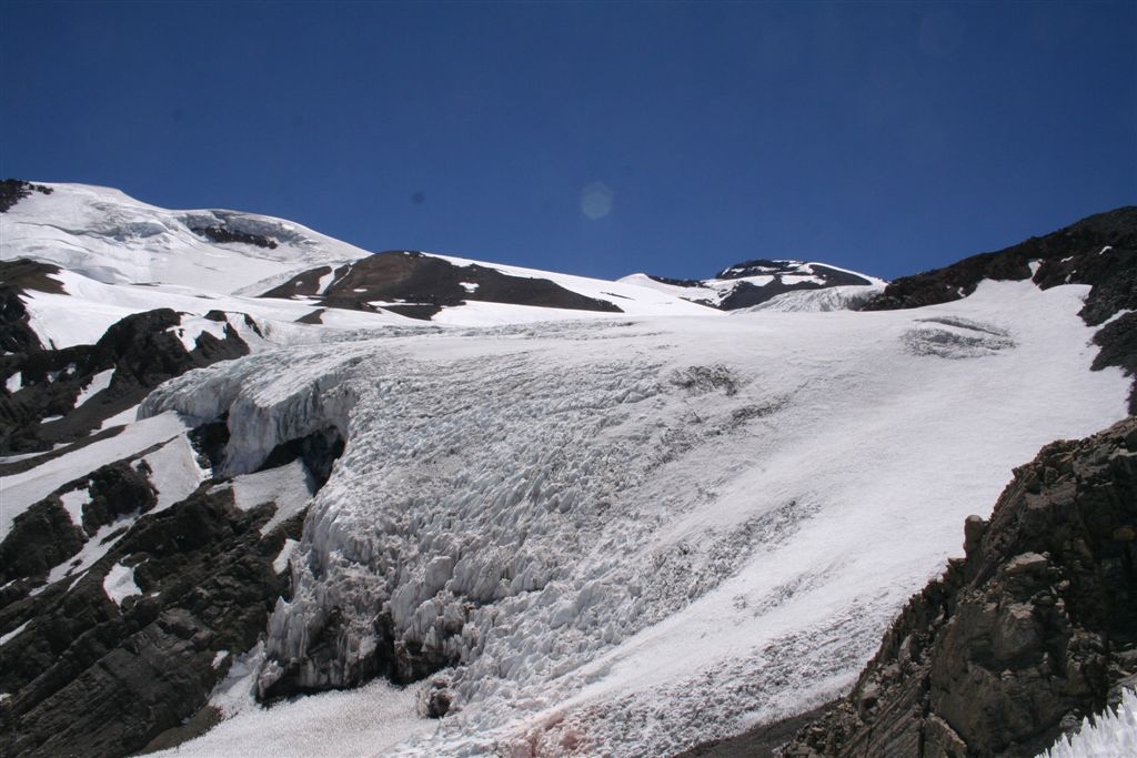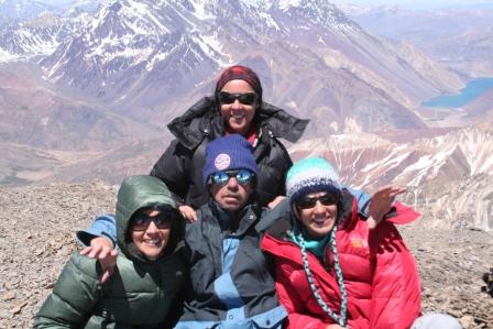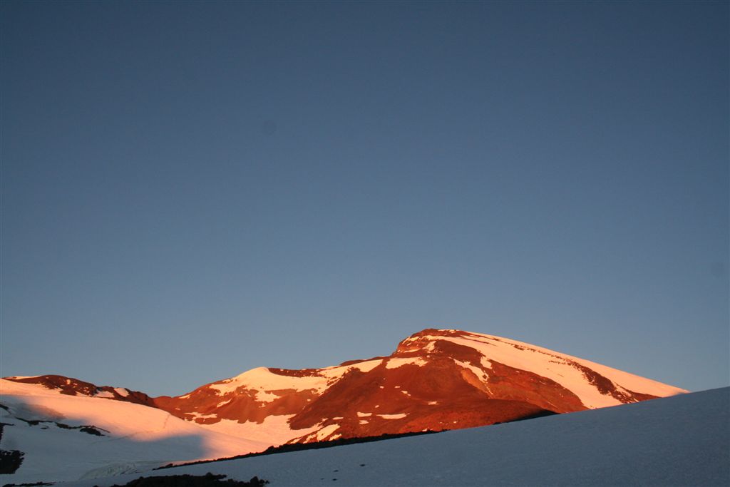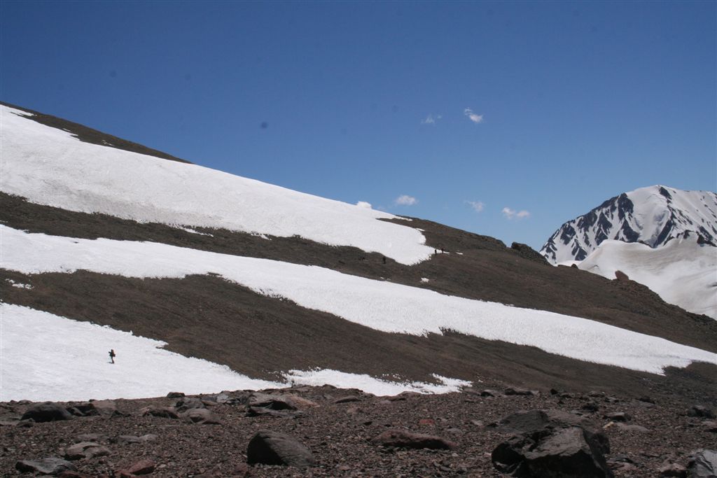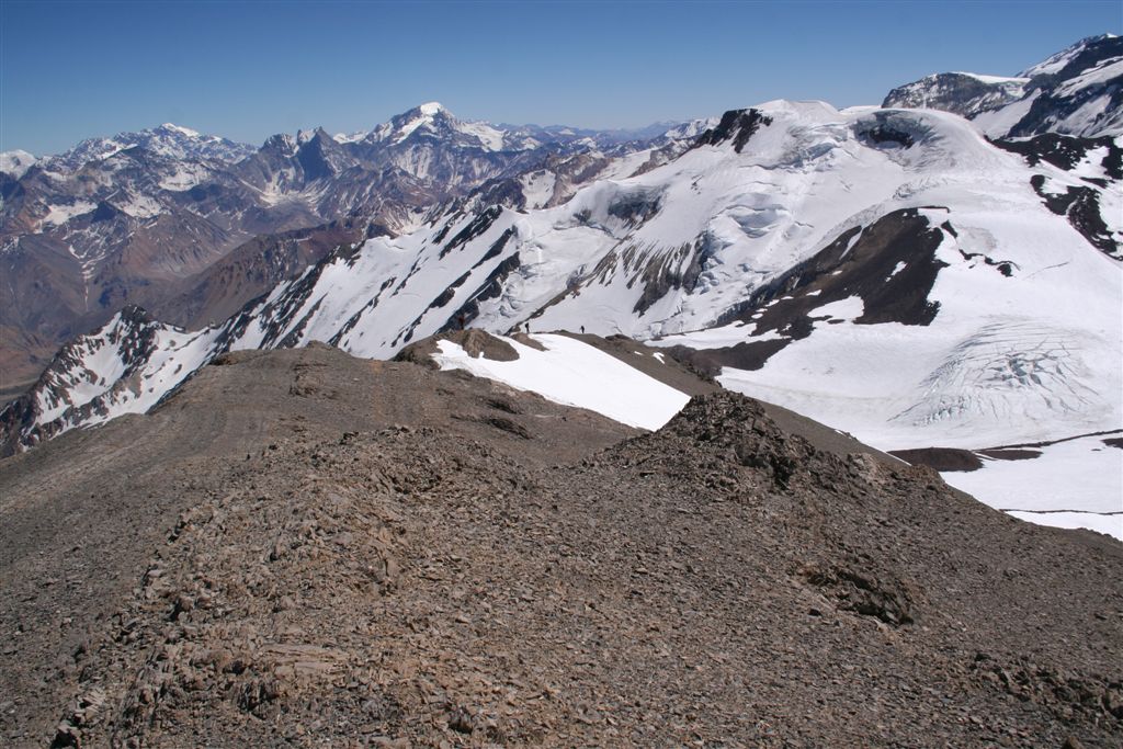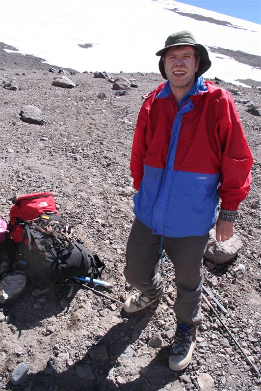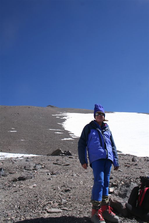 Am ca. 500 m langen Gipfelgrat denn ich aufgrund des starken Winds in der Ostflanke begehe, treffe ich mich mit Alvaro kurz vor dem Gipfel, gemeinsam erreichen wir zum ersten Mal überhaupt einen Anden Summit, gegen 11.45 Uhr stehen wir nach 2 ½ Std. und 615m Anstieg auf dem 5545m Hohen Pyramid. Von hier aus genießen wir zum ersten Mal einen Blick auf denn mächtigen Felsklotz des 6000 er Marmolejo. So langsam trudelt einer nach dem anderen ein. Die zwei Mädels sind noch nicht in Sichtweite, so begebe ich mich auf denn Weg, um nach denn beiden zusehen, die ich bald treffe, voller Stolz erreichen wir gemeinsam das Tagesziel, Lisas erster Gipfel über 5000m Höhe. Nach unzähligen Fotos, bei Super Fernsicht verewigen wir uns in dem unter einem Stein in Folie verpacktem Gipfelbuch. Im Abstieg nehme ich mich der Lisa an, um ihr noch so einige Techniken beizubringen, an dieser Stelle möchte ich feststellen, das dass Schuhwerk einiger Teilnehmer, auch die von Jens absolut nicht für dass Höhenbergsteigen geeignet sind, kaum Sicherheit für denn Fuß im speziellen für den Knöchel!Im Abstieg begegnen wir Ernst und Richard die schon sehr früh auf ca.4600 m gestarrten waren, allein bis zu unserem Camp waren sie 2 ½ Std. unterwegs! Die Zeit im etwas windstillen Lager nützen wir zum Waschen, soweit es in diesem verdammt kalten Wasser (wenige Minuten zuvor waren es ja noch Schneekristalle) eben möglich war. Am spätnachmittag gesellen sich unsere glückstrahlenden Nachzügler zu uns. Es sei erwähnt, das der geplante Schneebedeckte und vergletscherte 5000er Trono, ein echtes Highlight, eigentlich für denn nächsten Tag geplant war, aufgrund der bereits erwähnten Aufstiegs Ereignisse, dem Zeitplan zum Opfer viel. Unsere volle Konzentration galt nun dem Piuquenes ein wenig begangener, abseits des bekannten Tupungato liegender Riese. Nach einem für uns dos Alemanos erholsamen Tag, überließen wir die Küche Alvaro, der obligatorischen Suppe, folgte Reis mit Thunfisch dazu gab es die letzten Traumhaft guten Tomaten.