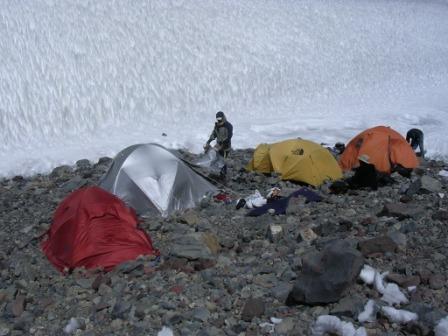 Nach dem befreien des Wasserlaufs von Eis werden die Töpfe befüllt. Ja dies war der beste Lagerplatz weit und breit. Langsam machen wir uns Sorgen um die Chicas. Alvaro und ich kurz dahinter folgt Amin, gehen zurück, wobei der Kamerad mir nicht folgen kann, bald kann ich die beiden ausmachen, mit wildem zurufen werden die beiden aufmerksam, wenige Min. später und sie wären auf dem Weg nach oben, uns ziemlich sicher aus denn Augen geraten, ja das war Rettung in höchster Not! Noch ein Schneefeld galt es zu queren und die beiden hübschen Mädels stehen mit strahlenden Augen vor mir. Franziska deutet an dass ich nicht ihres, sondern das Gepäck von Lisa aufnehmen sollte, gesagt getan, landete der deutlich „leichtere“ Rucksack auf dem Rücken und los ging’s. Alsbald trafen wir auf Amin der sich dem zweite Gepäckstück annahm. Unter letzter Kraftaufwendung aber überglücklich erreichen sie das eigentlich „nur“ 530 m höher liegende Hochlager. Alvaro übermittelte via Satelliten Telefon unsere Koordinaten die mein GPS ermittelte. *Eigentlich war geplant, dass eben diese Expedition im Internet unter „Expe News“ die eben auch dafür das Gerät zurverfügung stellte, verfolgt werden konnte. Bedingt durch das Eintreffen von Nachrichten der Angehörigen oder Freunde der Teilnehmer, wurde Alvaro beim erstellen der Infos gestört bzw. die eingegeben Daten gelöscht, dazu bedingt durch eben die Kälte, bereiteten die Akkus ständig Probleme. So blieb es letztendlich bei einer sehr abgespeckten Information. Bei einem gemeinsamen Austausch, legen wir die Startzeit zum ersten großen Gipfel dem Pyramid auf 9.00 Uhr fest. Eine windgeschützte Kochstelle wurde mittels Steinplatten neben dem Zelt errichtet, wenig später war eine mit Nudeln und Knobi verstärkte Beutelsuppe gekocht, zum Abendessen gab es Nudeln mit Hackfleischsoße und Würstel. Jens kredenzte zum Ausklang des Tages einen guten Kamillentee dazu eine große Tafel leckerer Schokolade. Bevor die Sonne hinter denn Bergen um 20.10 Uhr verschwand, lagen wir schon gebettet, noch war es aber Tag Hell! Über unserem Basislager schwebten in der Nacht Wolken der Glückseligkeit! Wie schon am Vortag herrschte eine Aussentemperatur von -14°C bedingt durch das höhere Lager eben von über 500 m war es eigentlich (Wärmer als Tag zuvor)*Ca. 150 m Höhendifferenz entsprechen in etwa eine Differenz von 1° C.