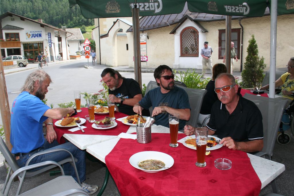 Sonntag 24.Juni: Etwas früher als noch Tag zuvor fand sich die Belegschaft zum Frühstück, wurde ich doch glatt belächelt als sich die Weisswürste die anscheinend schon ein Tag offen in der Küche lagen, sich auf dem Frühstücksteller wiederfanden!! Wer große Berge in der Welt besteigen möchte, sollte auch einen Magen-Darm Tragt haben, der allen Situationen gewachsen ist!! Nach der Essens Aufnahme stand die Hüttenreinigung an, die Tatsache das wir in dieser Saison fast die ersten waren und eine picobello Herberge antreffen, verpflichtete zur höchsten Sorgfalt, selbst um die Hütte war es danach reinlicher als angetroffen. Dies ist eine Selbstverständlichkeit, ein Dankeschön für die vertrauensvolle Überlassung eines Eigentums. Wenig später galt es sich von dieser Tollen Hütte zutrennen, der ein oder andere wird bestimmt mal wieder hier vorbei schauen. Für Nube der Probleme mit seinem Knie hatte war der Abstieg eine Tourtur aber irgendwie erreichten alle zufrieden das Fahrzeug auf der Bichlialpe. Nach der AV Schlüsselabgabe folgt das Abschluss Essen in der Rieder Stube besser gesagt im Hof.