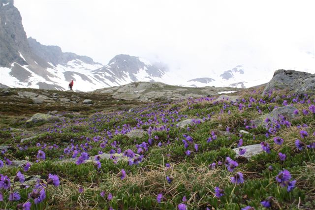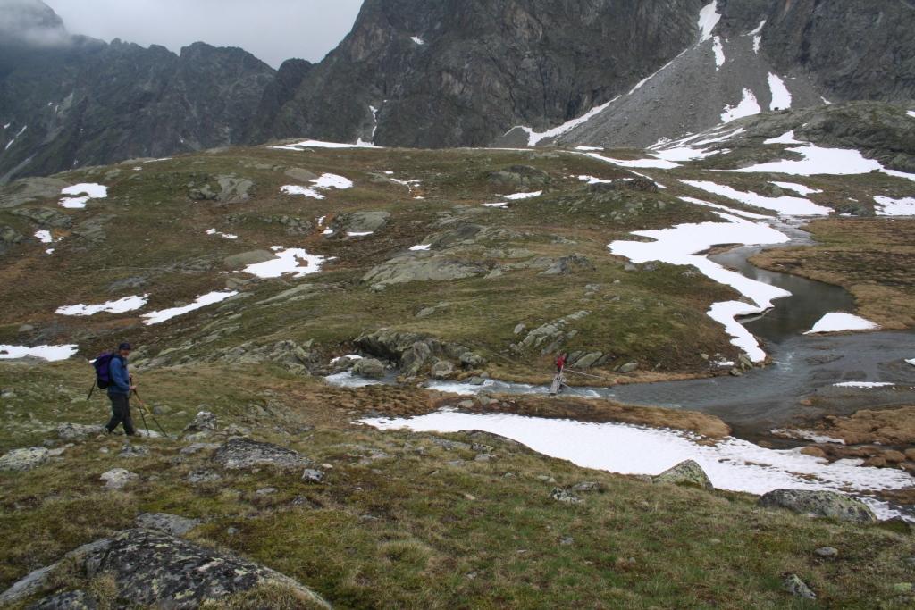 Noch vor wenigen Tagen war diese unter dem Schnee verborgen, doch kaum war dieser gewichen schossen die Pflanzen aus dem Boden, in ganz kurzer Zeit ging die Natur vom Winter in denn Sommer über, eine Entwicklung die normalerweise viele Wochen benötigt! Auf dieser Höhe war schnell klar warum der Wasserfall in gewaltiger Größe gen Tal Donnert, wobei in denn Morgenstunden dieses Schauspiel deutlich geringer ausfiel, ja ab diesem Wochenende werden die Tage wohl wieder kürzer, aber noch lange ob bei Tag oder Nacht schmilzt der Schnee bis fast an die 3000 Meter Marke hin. Die Tagesetappe endete auf knapp 2700 m, dann machte Walter kehrt, er drehte sich wohl in meine Richtung aber wahrscheinlich konnte er mich Winzling nicht wahr nehmen, kurze Zeit später wahr auch für mich ein Ende. Der Abstieg wurde noch für eine kleine Foto Session wahr genommen, wobei auffiel das sich die Wolken stetig mehr nach oben verzogen, eine deutliche Wetter Besserung trat ein. Es war ein ideales Zusammenspiel um eben zu Fotografieren, insbesondere das Spiegeln der Berge in denn noch teilweise im Schnee verborgenen Seen. Der Abstieg selber war ein schaulaufen. An der Schutzhütte angekommen galt es denn Pflichten nachzukommen. Priorität hatte dabei das Brennholz, Wooley machte sich auf denn Weg um eben dieses einzuholen, Nubbe und Stef machten sich am Sägen und Spalten zu schaffen. Walter der Frühaufsteher war schon morgens beim einholen der nachwachsenden Energie Aktiv gewesen, ich kümmerte mich um denn Brunnen, besser gesagt um den Wasser zufluß lag da doch was im Argen, ein besseres Tröpfeln. Bewaffnet mit einem Dosenöffner, (das einzigste auffindbare Werkzeug für die Hütten Gäste), galt es dem ausgemachten Ziel... eine Tonne die oben am Fels stand und sicherlich der Vorratsbehälter sein musste? flott waren die 100m Distanz überbrückt. Eine Reparatur war ohne Künstliche Hilfe möglich, befand sich doch der Schlauch der die Tonne speist, nicht im Wasserfluß geht doch! Beim erreichen des Brunnens floss schon das Lebens Elexier wie in besten Zeiten!! Die nächst grössere Aktion war das kühlen eines 5 Liter Bierfasses, das sich plötzlich und zur Überraschung aller im kalten Brunnen wiederfand