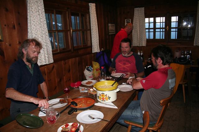 Nachdem auch das letzte Stück Holz fachgerecht aufgearbeitet war, galt es auf Omas Küchenherd mit Wasserschiffchen das 5 Gänge Menü zuzubereiten. Die Vorspeise war eine Erbsensupppe mit angeschmortem Rauchfleisch (Wooley). Gang zwei bestand aus einem Tomatensalat mit Oliven und Mozzarela garniert (Walter) danach zog es uns nach draussen hatten sich die Wolken vollends verzogen, die Sonne sorgte für angenehme Wärme bei 11°C und fast Windstille. Kurz nach 21.00 Uhr war der Tisch festlich gedeckt, Feinstes Zartes Fleisch in einer Marinade eingelegt wurden mit einer Festlichen Soße versehen,(Walter) dazu gab es Nudeln die durfte ich Kochen "mehr trauen die Kameraden wohl nicht zu"