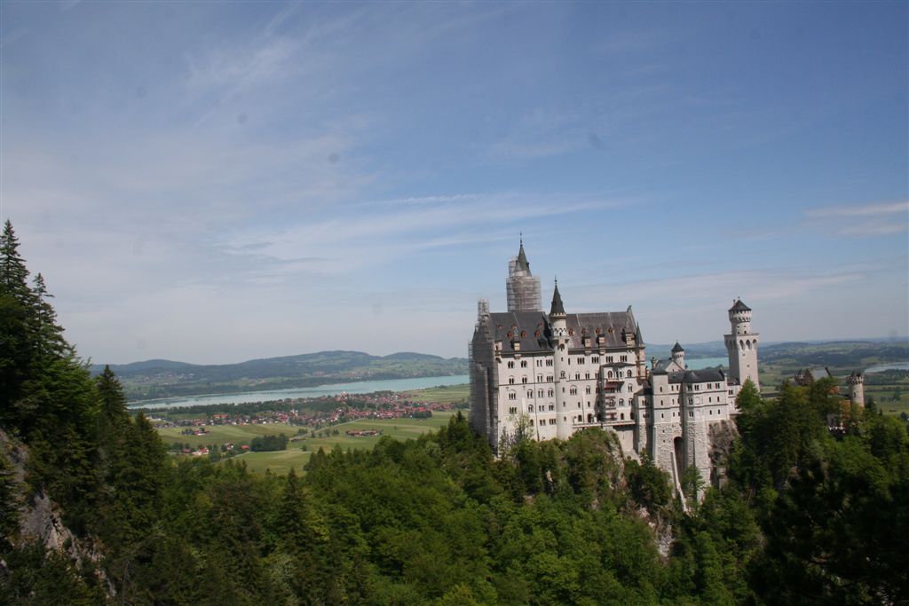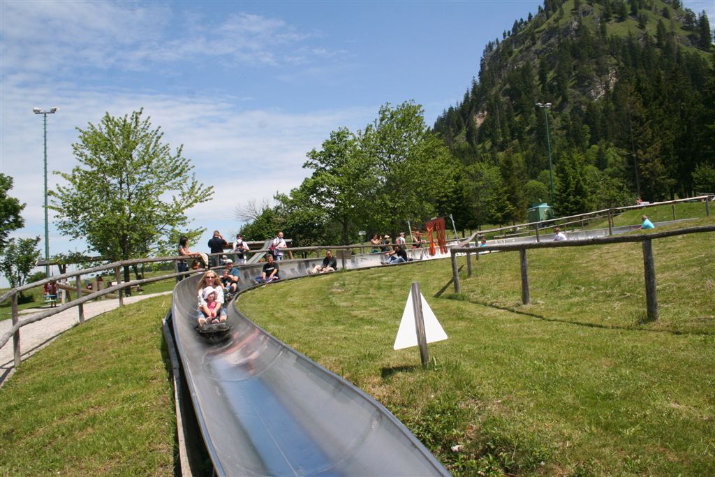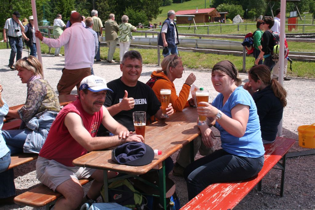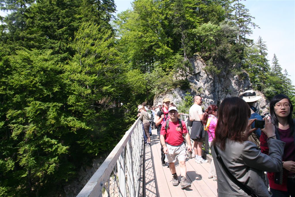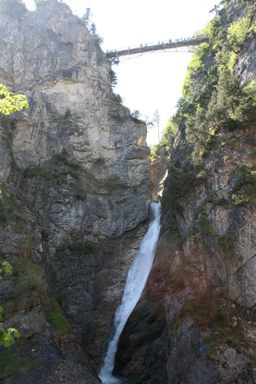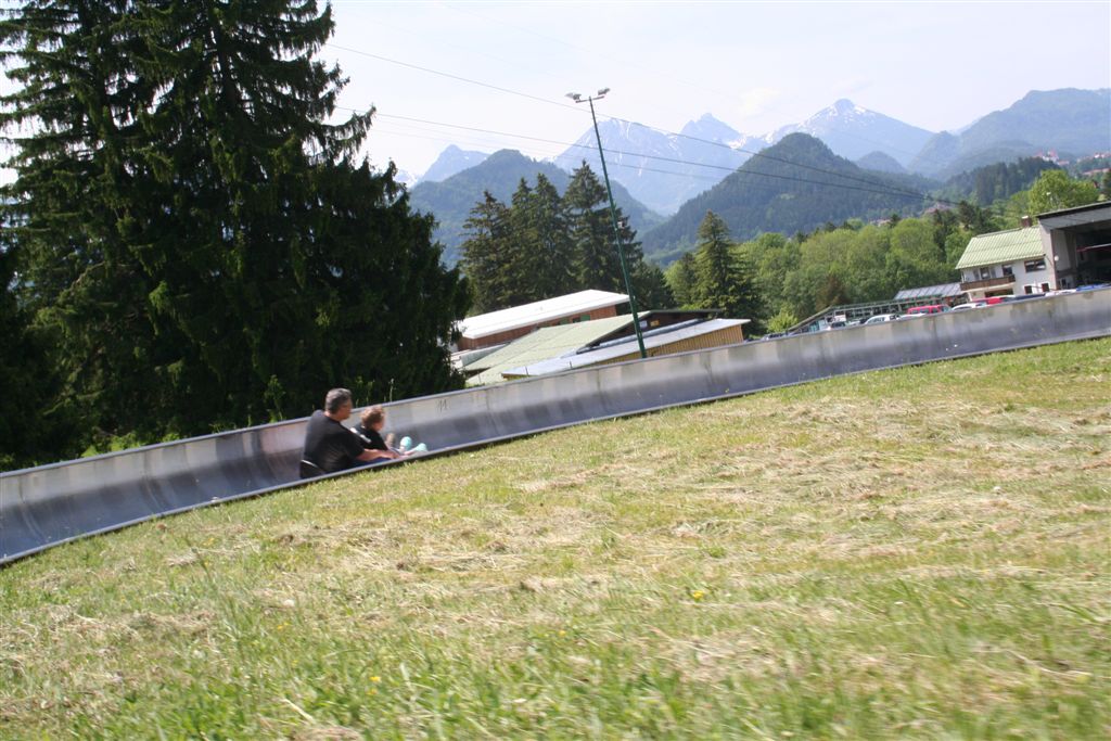 Sonntag 27.Mai: Längst herrschte rege Aktivität, doch wir ließen es uns nicht nehmen, eher später als die Allgemeinheit am Frühstückstisch Platz zu nehmen, was sich so alles brauchbares in denn Rucksäcken findet…..nach dem abspülen galt es die Rechnung zu begleichen, reichlich kompliziert rechnete der Hüttenwart ab, zu allem Unglück hatte er sich zu seinen Gunsten verrechnet, aber aus Dankbarkeit für diese Tolle Herberge, gönnte ich im diesen Zehner aus meinem Portmonai. Es war 10.30 Uhr. Bei leicht diesigen Wetter und 15 °C, es sollte sehr schnell richtig schön und Warm werden, war das nächste Ziel angesagt, die Weltbekannte Marienbrücke. Der Landschaftlich schönere Wasserfallweg wurde der eintönigen Strasse bevorzugt. Dann um 11.15 Uhr nach einer scharfen Kehre der absolute Schock! wie aus dem nichts, waren wahre Menschen Maßen unterwegs, ihr Ziel die Marienbrücke bzw. der Rückweg. Die Pause bis zum eintreffen der Kleinkuchener diente zum anpassen an diese doch völlig verrückte Begegnung nach der Ruhe der Bergwelt. Vor der Brücke ging es richtig Eng zu, Gedränge wohl das bessere Wort, mit etwas Geduld konnte die Stählerne Konstruktion betreten werden, faszinierend wie sich doch einige Krampfhaft am Geländer festhielten, ja die 70m Tiefenblick nicht jedermanns Sache! Jedenfalls ist der Blick von hier aus auf das Märchenschloss absolut überragend, eigentlich Pflicht, denn einen besseren Blick gibt es wohl nirgends zu erhaschen. Über die Pöllatschlucht die im unteren Teil Klammartig ausgebaut ist, war das letzte Ziel unserer Reisegesellschaft die Talstation der Tegelbergbahn. Bevor wir uns verabschiedeten galt das Interesse der Sommerrodelbahn, die bei Christian bestimmt in Erinnerung bleiben wird, ist im doch glatt während der Fahrt die Mütze verloren gegangen, nachdem die anstrengende Suche vergebens war, konnte das Personal nach Nachfrage die Kopfbedeckung aushändigen, ist diese doch glatt in denn Kufen des nachfolgenden Schlittens hängen geblieben. Während die vier denn Nachhauseweg antraten, war für uns erst Halbzeit.