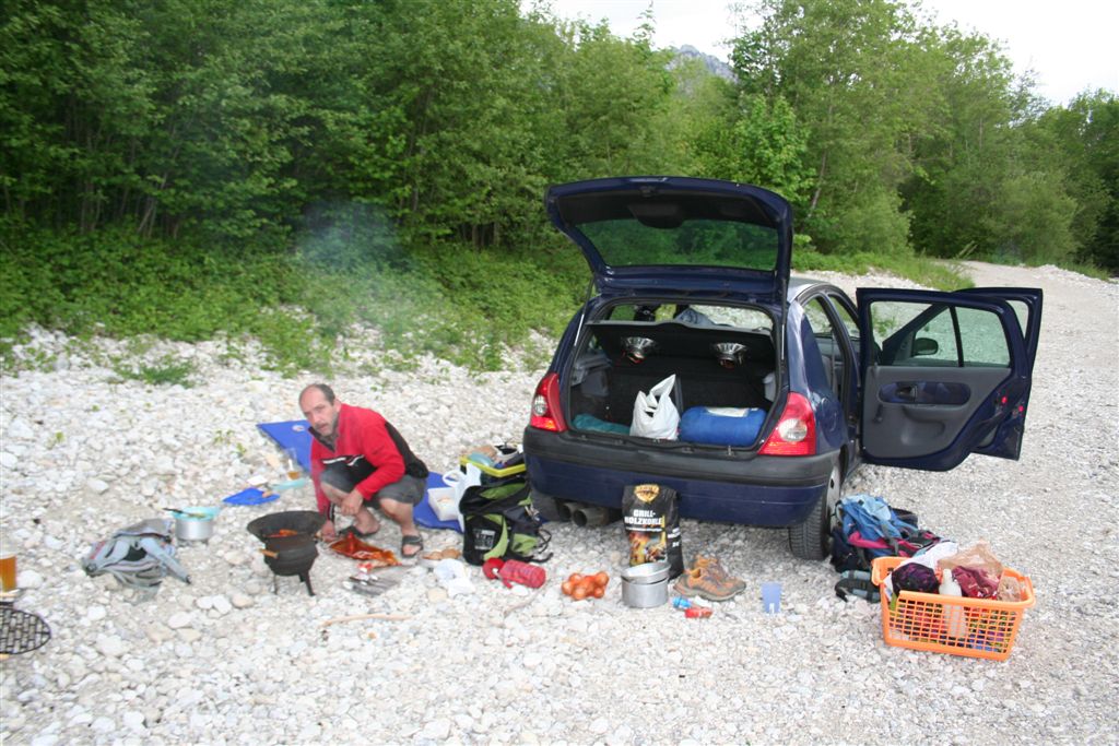Anstatt einen Campingplatz anzufahren, wurde der Parkplatz auf der gegenüberliegenden Straßenseite anvisiert. Der Nachmittag wurde auf der Isomatte zum Sonnen genützt, ja wie der Wetterbericht prophezeit hatte lies der Kalte Wind nach. Am Abend bewegten wir das Auto zum wenige Meter entfernten Flussbett. Der Himmel verdunkelte sich stetig, die Grillwürste und das erste Steak konnte noch bei ersten Regentropfen im Freien gegessen werden, es war dann doch ratsam das Epuipment und mehr im Fahrzeug unterzubringen.Nach dem hereinbrechen der Nacht wurde noch einmal der Platz gewechselt, das Vordach einer Hütte, wenige Meter von der Sommer Rodelbahn mit direktem Blick zum Schloss Neuschwanstein stellte denn idealen Platz dar, war doch glatt ein Biertisch mit zugehöriger Bank wie geschaffen. Nach dem einklappen dieser Garnitur war auch schon das Nachtlager gerichtet, irgendwann dann in dieser Nacht erlosch auf König Ludwigs Erbe die Lichter.