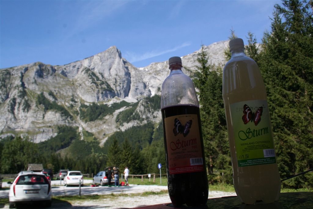 Es war 8.00 Uhr, die Nacht vorbei. Das Ziel noch in "weiter" Entfernung, rasch das Gepäck verstauen,wenig später die Autobahn erreicht. Kurz vor Linz ein Richtungswechsel neues Ziel Graz, das Verkehrsaufkommen gering, zwar hinderten einige Baustellen und Tunnels es lief aber gut, vor Admont ein Stop an einer Mautstelle 4,50 € akzeptabel. Der schönste Teil der Fahrt erfolgte durch das Düstere und tief Eingeschnittene Ennstal (Gesäuse) bekannt durch die Sommeranfangtour 2005. Noch vor 11.00 Uhr, war Eisenerz erreicht, erstes Ziel ein Spar Supermarkt. Bodo hatte sich vorab schon ganz gut mit Lebensmittel eingedeckt, bei der Suche nach einem Sturm wurden wir schnell fündig, je ein Roter und Weißer mit 1,5 Liter weckte schönste Erinnerungen an die Herbsttour 2005 am Hochkönig! Ein netter Herr, der uns schnell als Bergsteiger einschätzte, informierte aus freien stücken über die nähere Welt der Berge , so entstand zu denn vorab Infos detailierteres vor Ort. Ein echt warmer Empfang, bei guten Bedingungen aber noch gedämpfter Temperatur, so um die 10 °C. Inmitten der Kleinstadt mit seinen 5000 Einwohner fand sich ein idealer Platz mit Tisch und Bank für ein Frühstück und das auslegen des Kartenmaterials. Der Blick in die umliegenden Berge lies erkennen das die Schneefall Grenze so bei 1600 m gelegen war, ja und es lag einiges! Hier und jetzt planten wir die vorbereiteten Touren der nächsten Tage! sinngemäß sollte sich das ganze steigern, das G`Hackte als Start klar und wie es so sein muß der weitest Entfernteste Punkt, ab dort dann" rückwärts", der Grete Klinger Steig anschließend, passt auch liegt auch auf dem Weg zurück, einfach Genial! ein Grund um in die Hände zu klatschen. Um keine Zeit zu verlieren werden wir die Details während der Fahrt klären. Kurz vor erreichen der Passhöhe bei Präbichl befand sich ein Parkplatz mit bester Aussicht auf denn Erzberg und Eisenerz, eine Info Tafel veranschaulichte das wichtigste über diesen Steirischen Erzberg, Heimat und Arbeitgeber seit Jahrhunderten. Das Toiletten Haus wie geschaffen. In Leoben viel gleich die Stahl Industrie ins Auge, hier wird das Erz von Voest Linz aufgearbeitet. In Bruck zweigt die Straße nach Aflenz später dann in St.Ilgen zum Gasthaus Bodenbauer ab, hier schöner Parkplatz und ein Museum, dies ist denn Schwaben gewidmet. Nach 75 Km Fahrt der entfernteste Ort der Tour erreicht. Es war 13.15 Uhr, packen und Vespern ist nun angesagt, selbstverständlich wird der Sturm (Neuer Wein) nebenbei getestet. Herrlich so ein edles Tröpfchen des Traubensafts, während einer guten Brotzeit, dies bei angenehmen 15°C und eitlem Sonnenschein