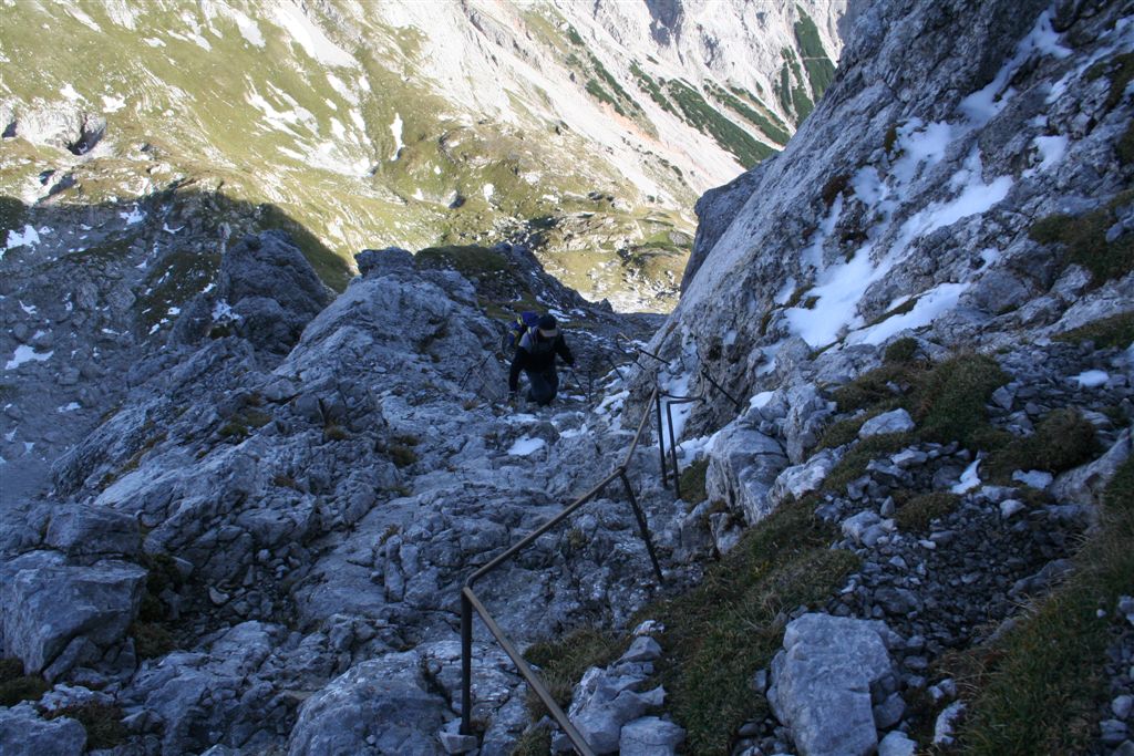 Kurz vor 14.00 Uhr erfolgte der Aufbruch 4 1/2 Std. Gehzeit bis zum Schiestl Haus, die Höhendifferenz 1400 m. Ein schöner Wanderweg leitete durch denn Bunten Wald, so richtig Herbstlich war es aber noch nicht. An einer steilen Felswand tummelten einige Seilschaften Frei Kletterer an bestem Fels, schade zuschauen ist auch schön, das Ziel aber noch in weiter Ferne! die Richtung änderte sich, statt vermutet inmitten des Massiv denn Durchstieg zu finden, lag dieser weit Östlich, über zwei traumhaft schöne Hochflächen weitete sich der Talkessel. Der Anstieg wurde zunehmend steiler, über die Nordseite schlängelt sich der Pfad nach oben, in der Sonne bei Windstille ganz schön heftig. Am Gegenhang tummelten sich Gemsen. Über uns befanden sich Personen am Klettersteig, am G`hacktbrunn 1875 m, das erste Wasser, dieses floss in einen Holz Trog ein, ein Überlauf leitete das Lebens Elixier in einen kleineren, ein anschauliches Spiel. Von hier bis zum Hochschwab Gipfel sind es laut Wegweiser noch 1,5 Std. Über begrünte Wiesen schlängelte sich die Wegspur bis zu der ersten Leiter in einer Schuttrinne auf knapp 1900 m, die wenig Steile Passage ein Platz um die Balance zu testen, aber mit kleineren Mängeln, die Steine und mancher Steinschlag oder Blitz an denn Stufen zeugten von Zerstörung.