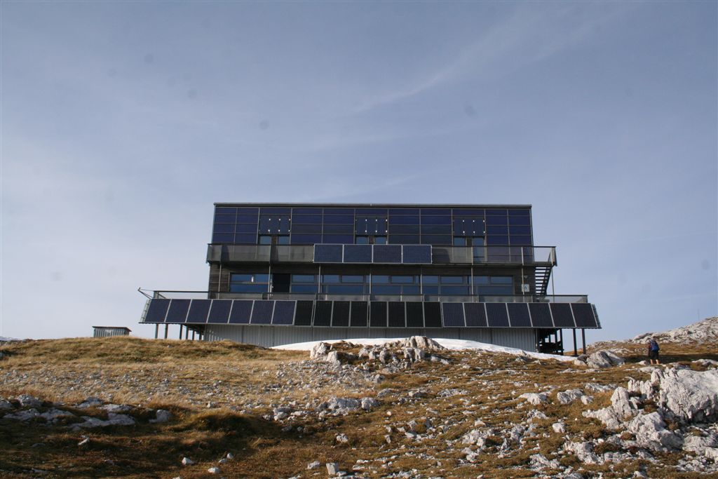 Die gesicherte Route verläuft ständig Oberhalb des Rechten Ufers der Steinschlag gefährdeten Schlucht. Auffallend die unbekannten waagrechten Sicherungsstangen die wie ein Handlauf die Begeher vor abrutschen schützt, einige Schneereste zeugten von dem Wintereinbruch die Tage zuvor, hatten aber keine Auswirkungen auf die Trittsicherheit, ja der Schatten und die zunehmende Höhe kühlten die Luft spürbar ab. Die 250 Hm der Steiganlage waren in knapp 35 Minuten durchstiegen, hier handelt es sich eher um einen gesicherten Steig als einer Klettersteig Anlage. Das Gelände wird nun einfacher wobei in dieser Senke teilweise der Schnee 40 cm tief liegt. Alsbald ist die Fleischer Biwakschachtel erreicht, diese stellt sich als nicht gerade als Unterkunft dar, eher ein Ort zum Schutz sie ist nur spartanisch eingerichtet, völlig ungewöhnlich! Zum Hochschwab Gipfel 2277 m sind es noch 15 Minuten. Am Hang erinnert eine Wächte eher an einen Winter oder Hochtour, Zehn Minuten nach dem Start am Biwak stehen wir am Höchsten Punkt der Herbsttour, ein Freundlicher Österreicher betätigt die im ausgehändigte Kamera dieser Moment bei nun richtig Kalten Wind bleibt Zeuge. Einige besser gekleidete verweilen noch. Fort hier! in wärmere Gefilde das Schiestl Haus ruft! Schon nach der nächsten Biegung erscheint das Schutzhaus im Blickfeld! Ja von weitem schon ist die Ökologische Bauweise auszumachen, ein Kollektor am anderen ziert die nach Süden ausgerichtete Frontseite. Nach gut einhundert Hm Abstieg, trennt ein kurzer Gegenanstieg vor dem schnellen erreichen. Ein Thermometer zeigt 6°C an, geht doch auf 2157 Meter. Im inneren ist es mollig Warm, die Schuhe werden im Trockenraum aufgehängt, Das Textil wieder so gut wie trocken, besser gesagt die Funktion Wäsche, gibt es etwas angenehmeres als Textil auf der Haut das Trocken ist? ein jeder Körper ist dankbar! Beim betreten des Gastraums ein erster umschweifender Blick, etwas aussergewöhnlich die Gestaltung bzw. Bestuhlung des Gastraumes, alles so ganz anders als üblich, das Personal erweckt eher denn Eindruck in einem "Freak Lokal" zu sein, wir stellen später fest alles bestens, aber nicht ganz so wie gewöhnt, auch die Musik macht da keine Ausnahme uns jedenfalls war es nicht unangenehm, und das war und ist! was einzigst und allein zählt!! Der erste Weg ging an die Theke, das Interesse galt einem Lagerplatz, auf die Frage nach einem Platz im Matratzenlager; kein Problem! habt ihr Reserviert? Nein! Gut ich schau nach, Besitzt ihr einen Hüttenschlafsack? Bodo konnte nicht lügen, für 16 € gibt es einen zu kaufen, sofort hatte er einen in Händen! Es ist anzunehmen das dass Geschäft damit blüht. Der Österreichische Touristen Klub gewährt dem DAV Ermässigung (Gegenrecht). Statt 17 € waren es 13,50 €.