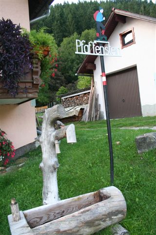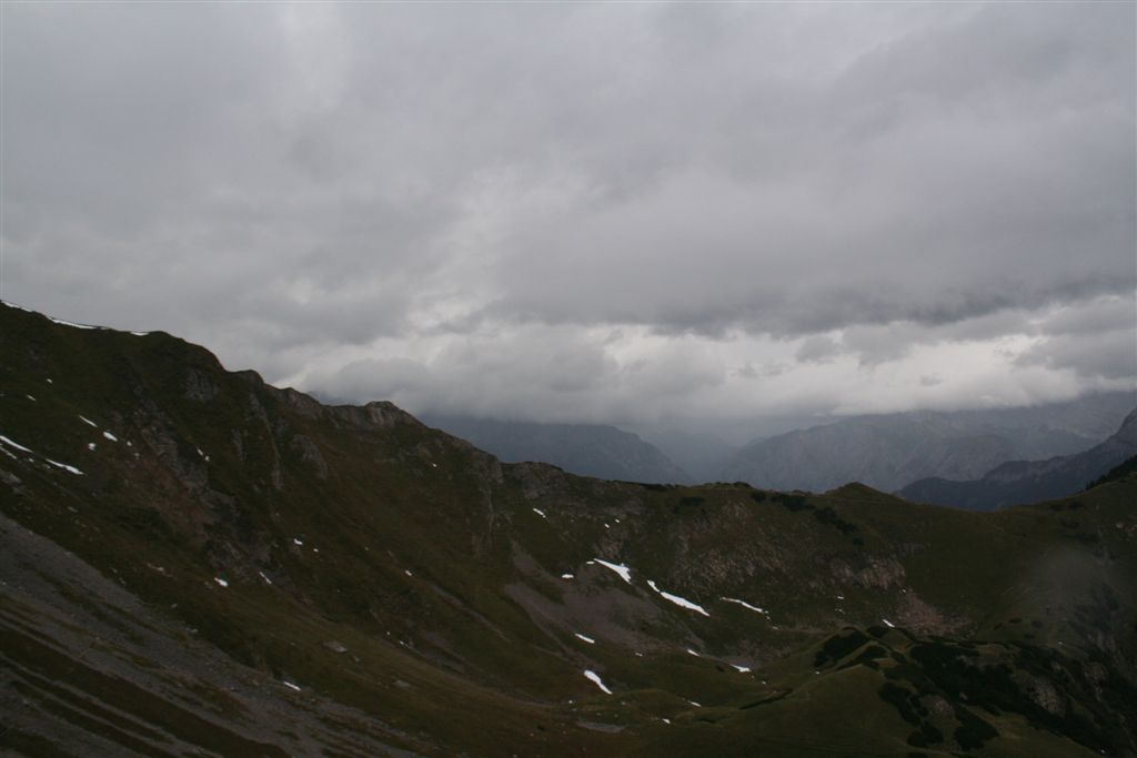 das Geburtstagskind mit dem Freund und Eltern und wenig weitere ein Überbleibsel? Die übliche Bestellung einen Liter Teewasser, die Beutel und mehr aus dem kleinen Rucksack, geschätzte mickrige 3 Kg. Es fehlte an nichts, Butter Marmelade Käse Wurst Brot Gemüse uvm. rundete das Frühstück ab. Der Erste Gast hatte Durst, der Mann am Tresen erteilte während des einschenkens Infos über denn Rückweg, demnach sei der etwas längere Abstieg über das Rottörl dem Weg Nr. 605 über denn Reichhals vorzuziehen. Der Thermometer zeigte 7° Plus an, Prima! Vor dem Abstieg wollten wir noch einen Blick nach Osten werfen, lagen doch die Touren der zwei Tage zuvor in dieser Richtung, 100 m Wegstrecke lagen bis zum Grad als Distanz, die sich in dieser Form aber nicht gelohnt hatten, eine echt Dicke Nebelsuppe ermöglichte wenig besser gesagt keine Sicht, schade gibt`s halt kein Bild. Ganz anders die Situation im Abstieg nach Westen, zwar war es im Schatten etwas Frisch und Feucht, die Sicht dafür bestens, das Tages Ziel der Pfaffenstein mit seinen 1865 m, gut auszumachen.