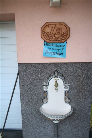 Es war kurz nach 17.00 Uhr, der Abstieg über denn teilweise gesicherten Markussteig stand an. die Ideale Route leitet zuerst in Nördlicher Richtung durch Latschen, führt dann ganz langsam in südlicher Richtung durch nicht ganz einfaches Gelände, von hier wieder ein herrlicher Blick auf denn Leopoldsteiner See, an dessen Nordufer sich der Kaiser Franz Josef Steig befindet, der ja bekanntlicher weise diese Herbsttour krönen wird. Unterhalb des Klettersteigs quert hier der Steig durch eine ausgesetzte Rinne, mit Schwierigkeit B nicht unbedingt für jeden Wanderer das geeignet Terrain. Wenig später ist der Ausgangspunkt des Eisenerzer auf 1530 m erreicht, wir benötigten hierfür knapp 30 Minuten. Der weitere Abstieg schlängelt sich durch schönsten Herbstwald. Vorher war es gar nicht aufgefallen oder war es jetzt der Durst, am ersten Haus befand sich ein Origineller Brunnen mit einem Hinweisschild "Trinkwasser für durstige Bergsteiger" Danke! gerne wurde diese Einladung angenommen.