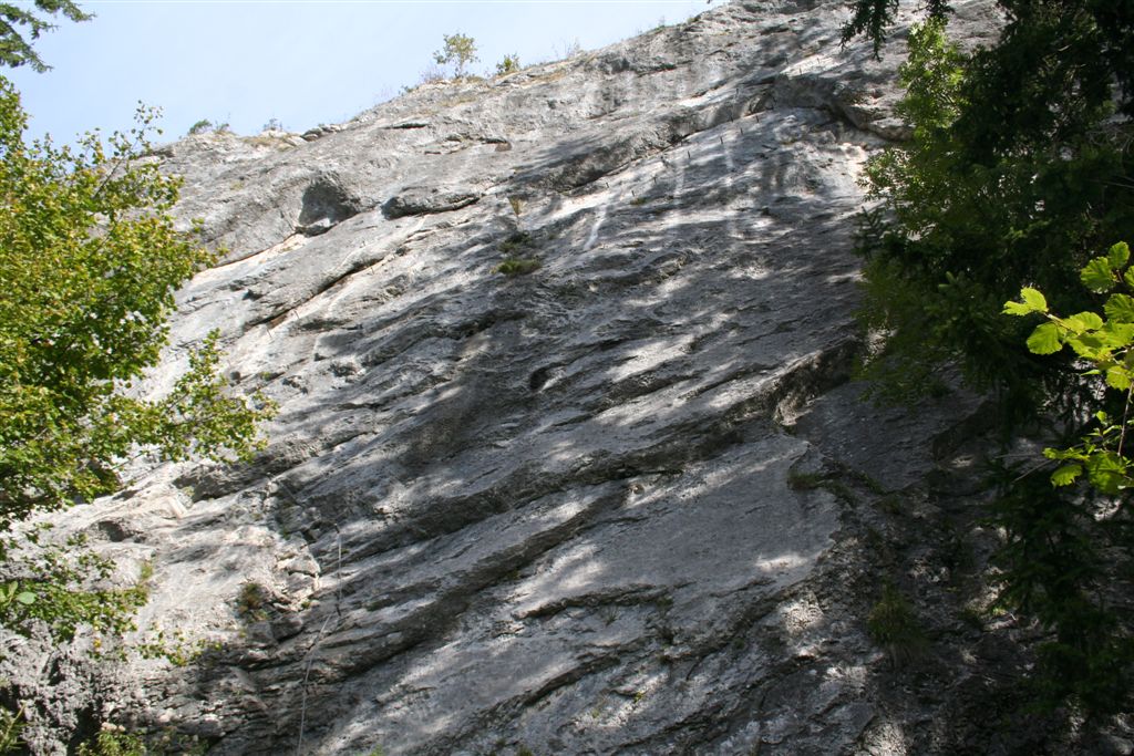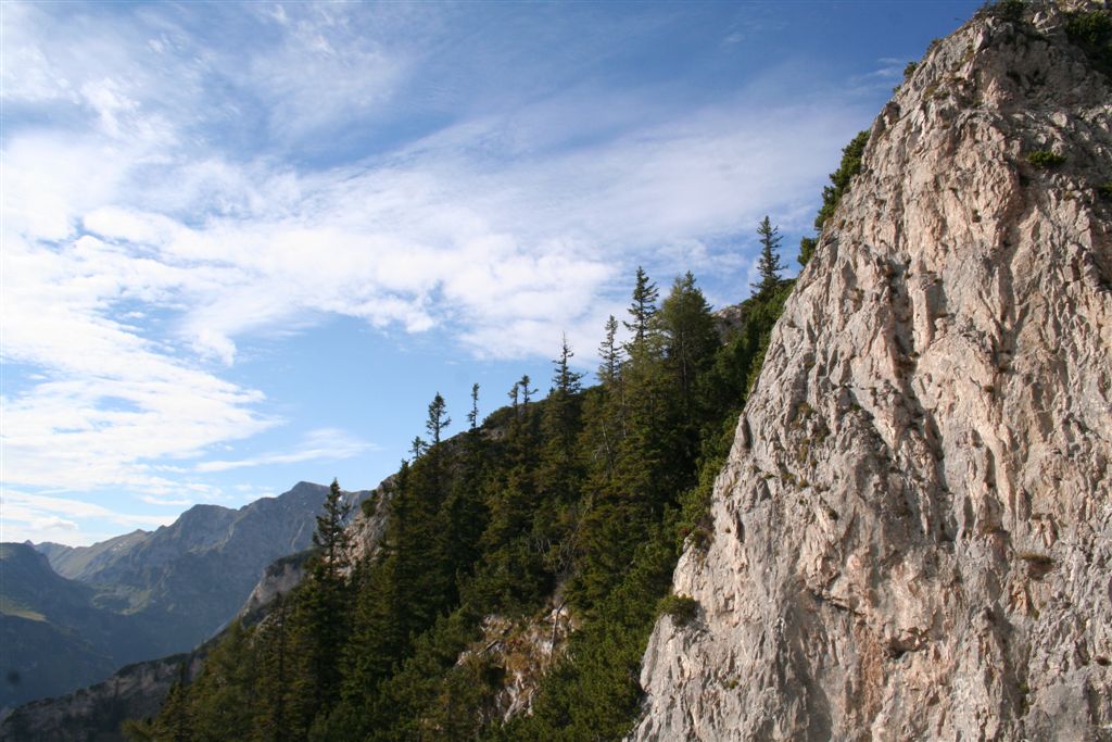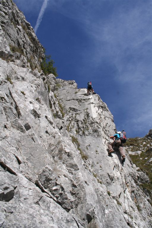 kräftiges zupacken gleich zu beginn und es sollte sich nicht ändern, wahrlich keine Steiganlage für Anfänger, im "Normalfall" beschränkt sich die Schlüsselstelle auf wenige Meter, aber hier sind es einige mehr, ja ich war mehr gefordert als es mir lieb war, der Steig führt die ersten Meter fast Senkrecht nach oben, die darauf folgende ansteigende und ausgesetzte Querung erschlafft die Muskulatur, muss aber auch erwähnen: das ich wie immer dies alles ungesichert und in einem Höllentempo angegangen bin. So nicht zu empfehlen! Obwohl es schon Herbstlich Kühl war, waren die Bedingungen in der kompletten Wand eher zu warm. Im Hochsommer bestimmt "Schweisstreibend ohne Ende" Wer denn Einstieg gut meistert, sollte im weiteren Aufstieg keine Probleme bekommen, es ist zwar noch einige Male anspruchsvoll aber eben nicht mehr so Heftig, wer nicht der sollte jetzt denn Notausstieg benützen, es ist die einzigste möglichkeit abzubrechen, ich habe dabei an Bodo gedacht, "wäre verständlich gewesen einer weiteren Tortour sich hier zu entledigen" Die nächsten 100 Hm war leichtes Gehgelände durch Fichtenbäume. Die zweite Sektion steigerte sich stetig, sehr gute Sicherungen aber nur an denn wichtigsten Stellen befanden sich fast Unterarm Dicke Trittstifte, die Route leiten durch die Gratkante des ersten Pfeilers, es war ein anspruchsvolles Klettern, ärgerlich wenn ich mir dieses hätte entgehen lassen, die Erbauer der Anlage hatten gute Arbeit verrichtet! nach jeder schwierigen Passage wurde eine Rast möglichkeit geschaffen. Als dann plötzlich irgendwo in der Wand Stimmen wahrzunehmen waren, wuchs die Freude, kurz unterhalb des "Adlerhorst" tauchten zwei Personen in das Blickfeld, langsam aber stetig bewegten Sie sich nach oben, in kürzerster Zeit "näherten wir uns", irgend etwas wollten sie mir mitteilen, konnte dies aber nicht wahrnehmen, kurz "unterhalb" dann klappte es besser mit der Kommunikation, "ein Beutel sei bei der letzten Rast vergessen worden" tatsächlich lag etwas unterhalb der Route ein Beutel mit einem belegten Brötchen in einem kleinen Gebüsch, der wie durch ein Wunder nicht in die Tiefe gestürzt ist, diesen befestigte ich mittels eines Knotens am Klettergurt. Nach einer dringend benötigten Pause, folgt die wohl ausgesetzteste und spannendste Phase am zweiten Pfeiler. In wenigen Minuten hatte ich denn "ersten" erreicht, der an einer weniger heiklen Stelle passieren lies. Am Ausstieg des Pfeilers wechselte der Beutel denn Besitzer, es war ihm so wichtig das er mir verschiedenes an Essen anbot, "keine Ursache gerne geschehen" da ich Trottel ohne Flüssigkeit unterwegs war, "würde mir ein schluck Wasser ausreichen", die beiden hatten gut vorgesorgt es fehlte an nichts, aber der Rucksack sah dementsprechend auch aus! Denke so an die 10 Kg, puuuuh die müssen erstmal nach Oben Transportiert werden. 15 Minuten nach der Begegnung etwas über dem Ausstieg des zweiten Pfeilers, befindet sich der letzte Rastplatz "Kaiserwald"