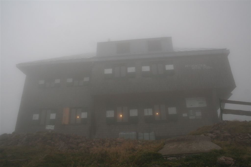 Der Himmel bewölkt sich zunehmend, es trübte ein, jetzt nicht locker lassen, es war wohl an der Zeit für eine kleine Pause, Bodo fiel mehr und mehr zurück, der Aufstieg wollte aber auch nicht Enden. Am Vorderen Zinken auf 1900 so zeigte es das GPS an, hatte ich mit dem Kameraden einsehen. Doch zur Überraschung hatte er sich schon einen Apfel gegönnt, ein Stück der Schokolade konnte er aber nicht ausschlagen, wie schon erwähnt hatten wir doch glatt vergessen Flüssiges einzupacken. Das Rottörl und das (Dach der Reichensteiner Hütte in schier unerreichbarer Entfernung) war schon auszumachen, doch noch einmal stand ein Bergrücken dazwischen, wer geht schon gerne hoch um danach wieder abzusteigen ? Noch vor dem erreichen des Übergangs begann es leicht zu Regnen. Die Hinweisschilder am Rottörl verieten einige Ziele, bis zu der Reichensteiner Hütte 1,5 Std. Bodo in 1 Std. packen wir das! deren 3,5 Std. waren zurückgelegt. Nach dem Überqueren der Scharte ein anderes Bild Altschneereste teilweise auch größere Platten galt es an der Nordflanke des Reichenstein auf 1900m zu queren. Beim wechsel auf die Westseite ein anderes Bild, die aufziehenden Wolken verhinderten eine Sicht, ja es war plötzlich eine richtige Waschküche mit Sicht bis zu 30 Metern. Die deutlich ausgetretene Wegspur geleitet ständig ansteigend nach oben. An einer Wettergeschützten Bank verharrte ich bis zum eintreffen des Begleiters, nach einigen Meter konnten Stimmen ausgemacht werden, deren Herkunft nur zu erahnen. Der Weg teilte sich, Links über die Stiege oder Rechts, Logisch der anspruchsvollere wird gewählt, die Stiege stellte sich als eine Leiter heraus, deren Begehung kein ernsthaftes Problem darstellt, eher die Benützung der nassen und kalten Sicherungsseile. Die Stimmen wurden immer deutlicher alsbald tauchte eine Gruppe wie aus dem nichts aus der Grauen Suppe auf, mit einem Hallo war der Tross überholt, der ein oder andere Versuchte sich an die Fersen zu haften, ein Grund um so richtig die Bremse zu lösen!! Dann der entscheidende und erlösende Moment, ein Schild mit der Aufschrift Reichensteiner Hütte 5 Minuten, das war glatt gelogen, tatsächlich waren es deren 3. Statt der am Rottörl angegebenen 1,5 Std, waren es tatsächlich nur 39 Minuten, Geht doch wenn man möchte oder kann, da soll einer sagen Altes Eisen! In Summe so knapp 3000 Höhenmeter an diesem Tag kann sich sehen lassen. Der Eingansbereich erinnerte an das Habsberger Haus in der Rax mit Bushaltestelle und sonstigen Fantastereien, echt originell die Öschis. In der Gaststube ging es um 18.15 Uhr schon hoch her, ich wurde nur wenig beachtet, ein gutes Zeichen? Sicherlich!