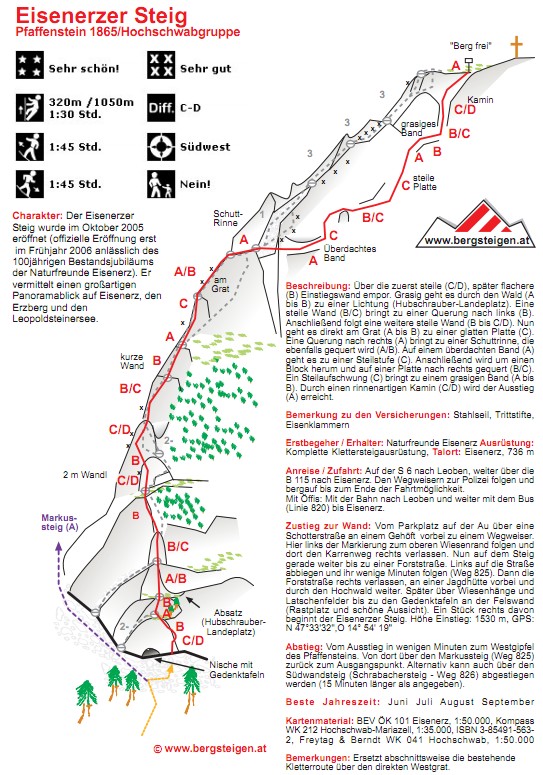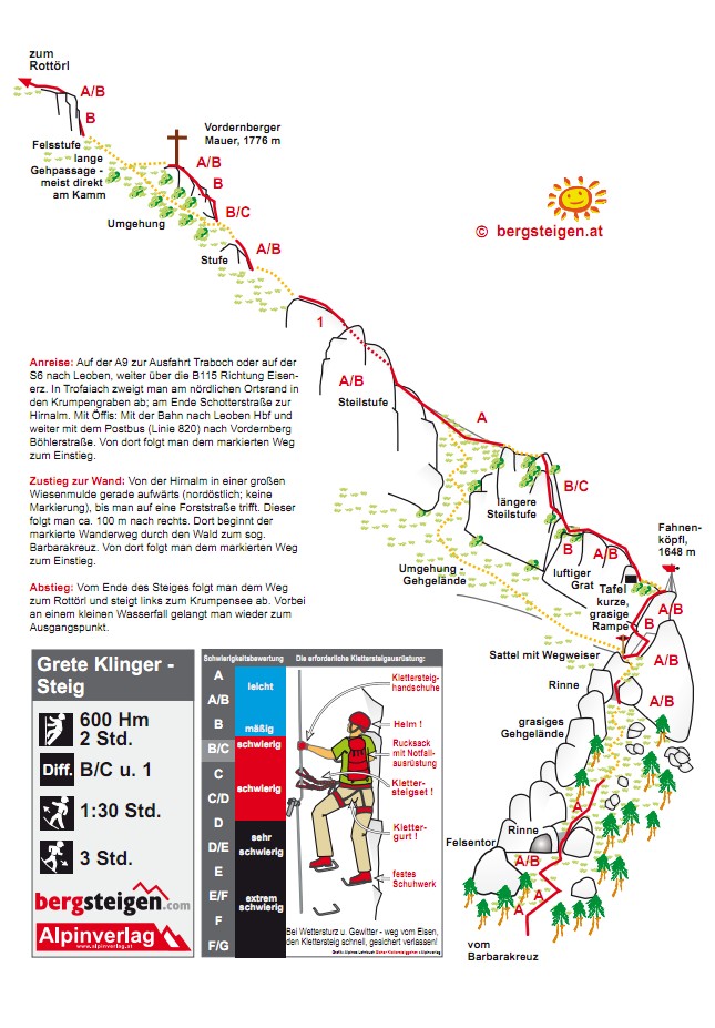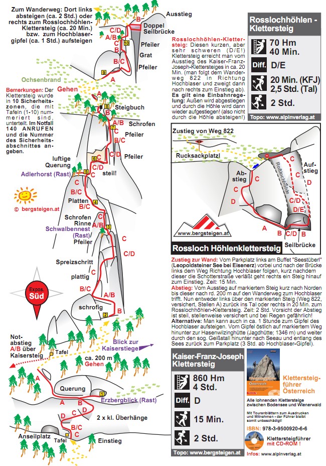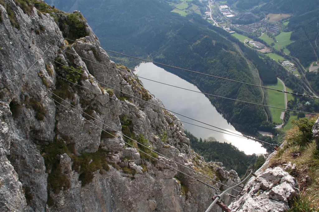 Schwierigkeit; Sehr schwierig. Zumeist zw. B und C, mehrere Passagen C/D und D, verbunden mit tw. grosser Ausgesetztheit Charakter: Ein wirklich sehr gut gelungener, abwechslungsreicher und schwieriger Klettersteig. Neben gefühlvoll dem Gelände angepassten Passagen sind auch einige recht knackige, kraftbetonte und ausgesetzte Stellen zu überwinden. Die herrlichen Tiefblicke zum Leopoldsteinersee und zum gegenüberliegenden Erzberg runden das großartige Klettersteigerlebnis ab.