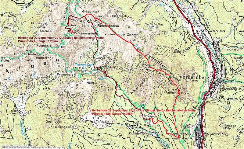 Es war 8.00 Uhr, die Nacht vorbei. Das Ziel noch in "weiter" Entfernung, rasch das Gepäck verstauen,wenig später die Autobahn erreicht. Kurz vor Linz ein Richtungswechsel neues Ziel Graz, das Verkehrsaufkommen gering, zwar hinderten einige Baustellen und Tunnels es lief aber gut, vor Admont ein Stop an einer Mautstelle 4,50 € akzeptabel. Der schönste Teil der Fahrt erfolgte durch das Düstere und tief Eingeschnittene Ennstal (Gesäuse) bekannt durch die Sommeranfangtour 2005. Noch vor 11.00 Uhr, war Eisenerz erreicht, erstes Ziel ein Spar Supermarkt. Bodo hatte sich vorab schon ganz gut mit Lebensmittel eingedeckt, bei der Suche nach einem Sturm wurden wir schnell fündig, je ein Roter und Weißer mit 1,5 Liter weckte schönste Erinnerungen an die Herbsttour 2005 am Hochkönig! Ein netter Herr, der uns schnell als Bergsteiger einschätzte, informierte aus freien stücken über die nähere Welt der Berge , so entstand zu denn vorab Infos detailierteres vor Ort. Ein echt warmer Empfang, bei guten Bedingungen aber noch gedämpfter Temperatur, so um die 10 °C. Inmitten der Kleinstadt mit seinen 5000 Einwohner fand sich ein idealer Platz mit Tisch und Bank für ein Frühstück und das auslegen des Kartenmaterials. Der Blick in die umliegenden Berge lies erkennen das die Schneefall Grenze so bei 1600 m gelegen war, ja und es lag einiges! Hier und jetzt planten wir die vorbereiteten Touren der nächsten Tage! sinngemäß sollte sich das ganze steigern, das G`Hackte als Start klar und wie es so sein muß der weitest Entfernteste Punkt, ab dort dann" rückwärts", der Grete Klinger Steig anschließend, passt auch liegt auch auf dem Weg zurück, einfach Genial! ein Grund um in die Hände zu klatschen. Um keine Zeit zu verlieren werden wir die Details während der Fahrt klären. Kurz vor erreichen der Passhöhe bei Präbichl befand sich ein Parkplatz mit bester Aussicht auf denn Erzberg und Eisenerz, eine Info Tafel veranschaulichte das wichtigste über diesen Steirischen Erzberg, Heimat und Arbeitgeber seit Jahrhunderten. Das Toiletten Haus wie geschaffen. In Leoben viel gleich die Stahl Industrie ins Auge, hier wird das Erz von Voest Linz aufgearbeitet. In Bruck zweigt die Straße nach Aflenz später dann in St.Ilgen zum Gasthaus Bodenbauer ab, hier schöner Parkplatz und ein Museum, dies ist denn Schwaben gewidmet. Nach 75 Km Fahrt der entfernteste Ort der Tour erreicht. Es war 13.15 Uhr, packen und Vespern ist nun angesagt, selbstverständlich wird der Sturm (Neuer Wein) nebenbei getestet. Herrlich so ein edles Tröpfchen des Traubensafts, während einer guten Brotzeit, dies bei angenehmen 15°C und eitlem Sonnenschein