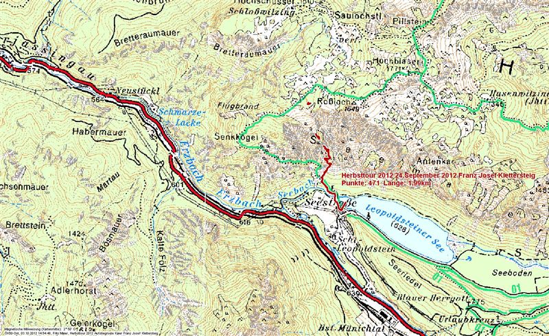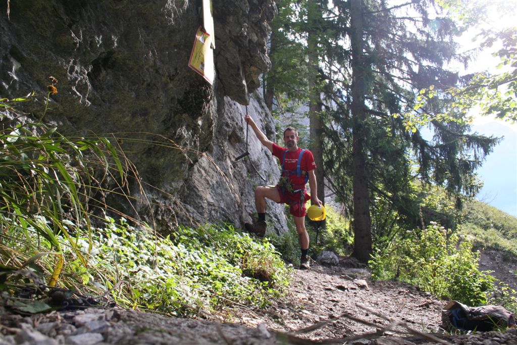 Am See herrschte schon Betriebsamkeit, während wir uns "herrichteten" überraschte mich Bodo, er erklärte "das er diesen Steig nicht angehen möchte" die feratte sei einfach zu anspruchsvoll, dies schlug wie eine Bombe ein, die erste Reaktion wohl überzogen, "dann brechen wir ab"! "ne geh du ruhig allein, begnüge mich mit dem Normalweg". Gesagt getan, von der freundlichen Kiosk Besitzerin gab es noch eine Info Broschüre über die Klettersteige der "Eisenerzer". Wahrlich hier wurde in denn letzten Jahren einiges an Infrastruktur geschaffen!! Ein Apfel und eine Tafel Schokolade die Wegzehrung, über eine kleine Brücke am Ausläufer des Sees führte der Promenaden Weg zu einer ersten Weggabelung, die Markierungen bestens, wenig später zweigt der Einstieg zum Kaiser Franz Josef Steig ab, es war jetzt 9.41 Uhr, wir vereinbarten uns Telefonisch nach dem Ausstieg "auszutauschen" in wenigen Minuten wurde der Einstieg erreicht, diese Wand sah ganz schön heftig aus, Respekt!
