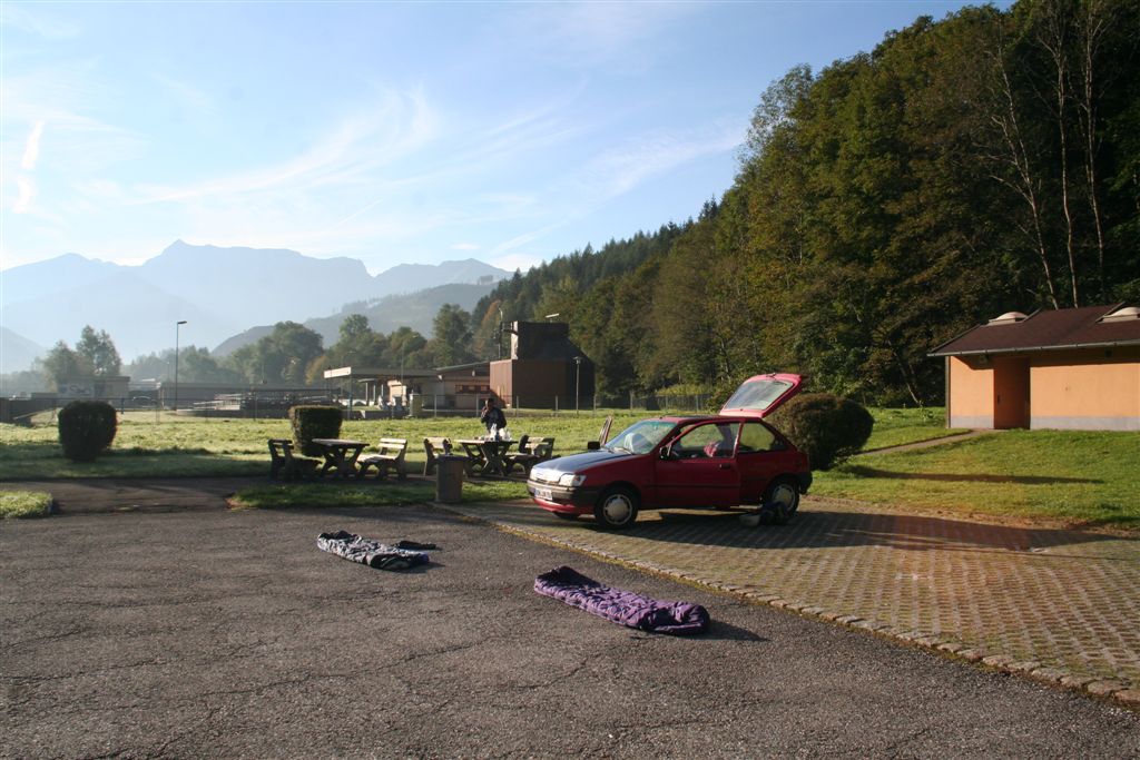 Montag 24.September: ein Blick auf die Uhr, es war sieben, hohe Luftfeuchtigkeit und kühle hielten vom aufstehen ab, der Herbst hatte wahrlich Einzug gehalten! Eine Stunde später war es dann soweit, die Sonne hatte denn Berg gegenüber mit seinen warmen Strahlen erreicht. Auf der Fahrt zum Leopoldsteiner See erspähten wir ein Öffentliches WC mit zwei Bänken und Tischen. Frisches Wasser direkt aus dem Wasserhahn der ideale Ort für die morgen Toilette. Während des Kochens des Teewassers "erreichte" uns die Sonne, die Strahlen erwärmten nicht nur denn Körper. Der nasse Schlafsack und die Isomatte wurden sogleich zum trocknen ausgelegt.