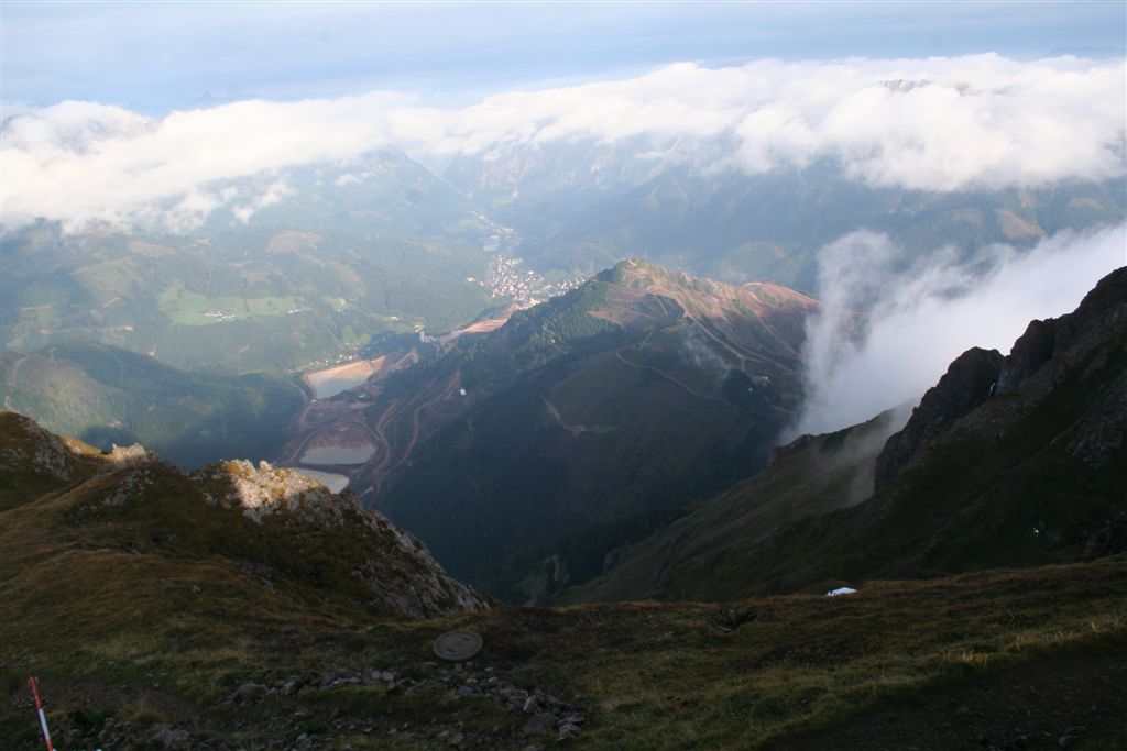 Der Eisenberg mit seinen Stauseen lag ebenfalls zu Füßen. Tags zuvor noch in denn Wolken erfolgte jetzt der Abstieg mit guter Sicht, schnell war die Wegteilung erreicht, rechts haltend über die Stiege - vorbei an der Sitzbank, danach flachte das Gelände ab. Etliche Wanderer die über den Weg 295 von Präbichl aufstiegen, ließen klar werden das ja heute Sonntag war. von Präbichl erfolgt der kürzeste Aufstieg zum Reichenberger Haus 2 1/2 Std. Am Rottörl um 10.40 Uhr, ein ganz anderes Bild, Nebel wohin das Auge reicht, erst aus näherer Entfernung ist der Kumpensee auszumachen, wenig später tauchte die bewirtete Kumpenalm wie aus dem nichts auf, es wurde wohl wärmer aber die Schönheit des Kumpentals blieb uns noch einige Zeit verwehrt! Vorbei an einem Wasserfall der nur Akkustisch wahrzunehmen war wechselte die Szenerie, war es erst noch zarte Laubbäume wurden später Bäume daraus, auch hier begeneten uns erste Wanderer noch vor der Mittagszeit. Nur das dröhnen von Motorsägen störten diese beschauliche Idylle. Hatten sich doch einige bewaffnete weit in das Dickicht vorgearbeitet um Holz einzuholen, die spinnen doch! mittlerer weile war die Sicht frei, die Wolken lösten sich langsam auf, die Sonne stand auf unserer Seite. Kurz nach 12.00 Uhr, war der Parkplatz Hirnalm erreicht. Ein Holzbrunnen mit Wasser-speiher "schön das es dich gibt" diente für ein Gesichtsbad. Am Fahrzeug erfolgte eine kurze Pause um denn Durst zu stillen, natürlich mit dabei der "liebliche Sturm" . Über Trofaiach - Präbichl war das Ziel Eisenerz, besser gesagt der Pfaffenstein mit dem Eisenerzer Klettersteig. Ausgangspunkt hierfür ist der Nördlichste Punkt der Stadt, der ohne Probleme direkt angesteuert wurde, klar einige Hinweisschilder lotsten geschickt durch denn Ort.