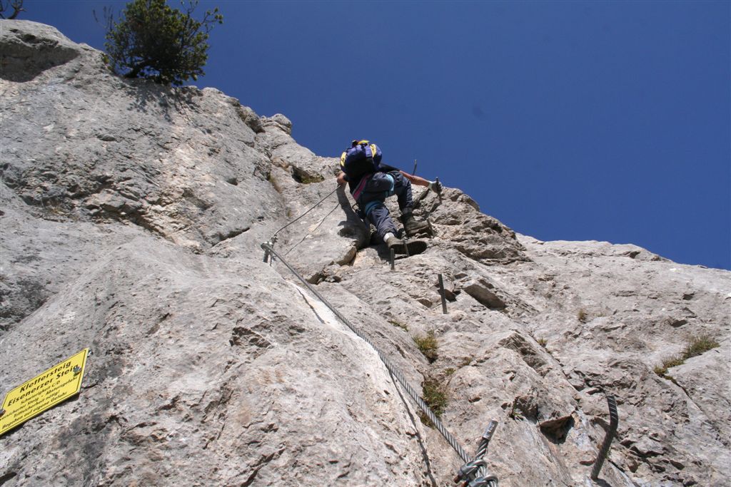 So richtig los ging es ab dem Barbarakreuz zunehmend steilte das Gelände auf, der Schweiß ronn aus allen Poren die Sonne brannte heftigst, Bodo musste sich ganz schön mühen um dran zu bleiben. Nach gut einer Stunde war der Einstieg des Grete Klinger Klettersteig erreicht. Zuerst noch einfach und wenig ausgesetzt, änderte sich dies Bild ständig, Selbstsicherung war aber nicht erforderlich, vorbei am Fahnenköpfle 1648 m mit Super Fernsicht oder auch Tiefenblick zur Passtraße nach Eisenerz, dann die Schlüsselstelle, eine ausgesetzte gut gesicherte Wandstelle mit Schwierigkeit C das erste Highlight der Tour. In leichter Gratkletterei weiter über die Vordere Mauer teilweise auch in Latschen, nach 2 Std. der Ausstieg um 16.00 Uhr erreicht.