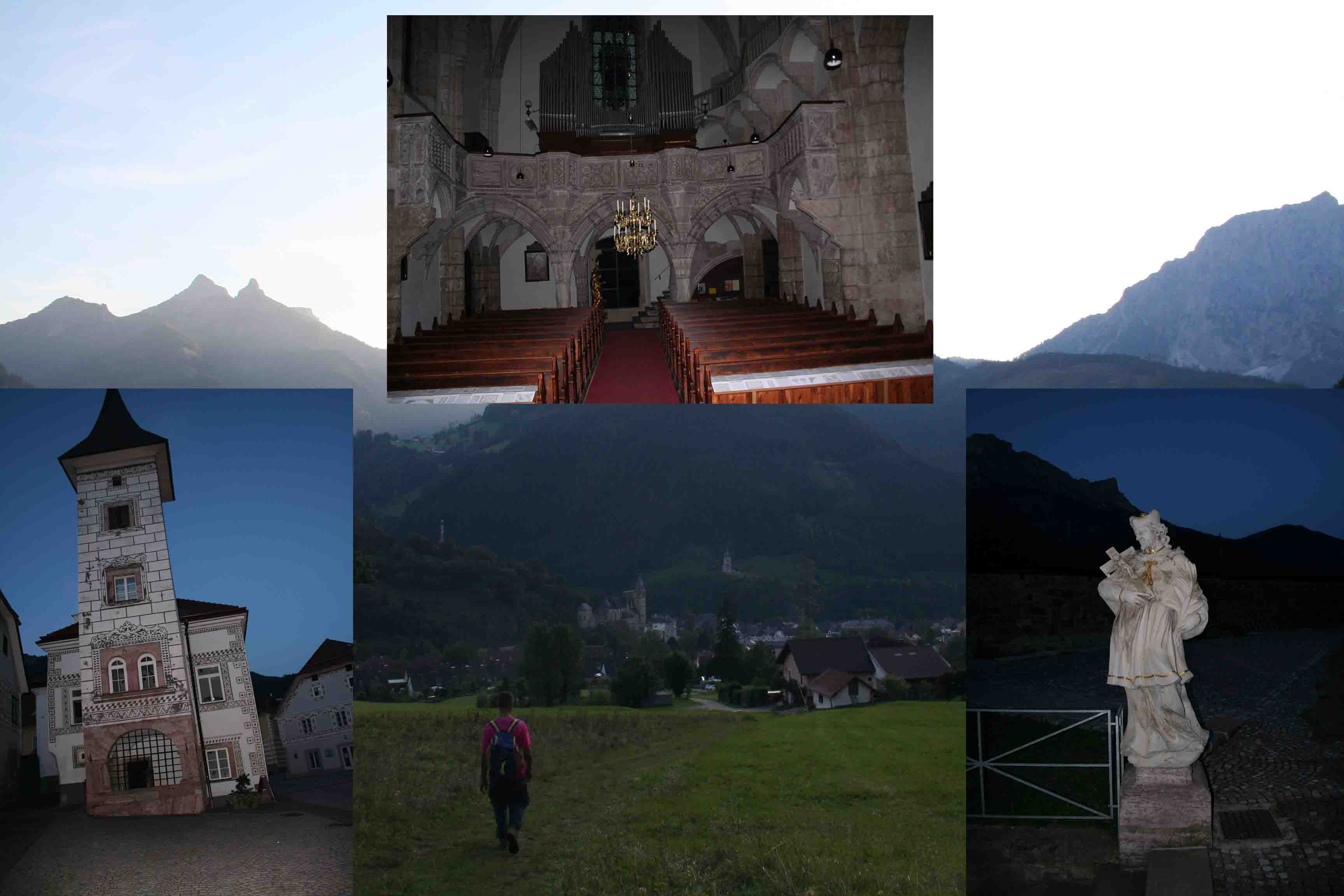 Nur noch wenige Meter trennten uns bis zu unserem Fahrzeug, erstmal die Stiefel ablegen, eine Wohltat nach über 4,5 Std. anspruchsvolle und körperliche Höchstleistung, als Belohnung na was wohl, eine Russ hurra! An diesem Abend war zwar eine Hüttenübernachtung eingeplant, doch die Behörde verweigerte der Leobener Hütte die Lizenz aufgrund Trinkwasser Probleme (Qualität). In diesem Fall sollte es für uns eher ein Vorteil sein. Immerhin ein Anstieg von 600 HM. Die Planung für denn Abend schlicht und einfach. War da nicht ein Brunnen wo wir Freitag die Tour "Vorort" planten? Klar doch! nichts wie hin, ungewaschen ins Nachtleben zustürzen ein klares No Go. Gesagt getan, einige Meter unterhalb der Straße in die Altstadt, befand sich ein Parkplatz, bewaffnet mit Seife Handtuch und frischen Socken erfolgte inmitten der Stadt die leichte Körperreinigung. So langsam Dämmerte es, die Zeit lief davon, die Altstadt mit seiner Burgkirche das erklärte Ziel. Schade nur das Kerzenlicht im inneren sorgte für Helligkeit, so blieb es bei einer kurzen Visite![]()
