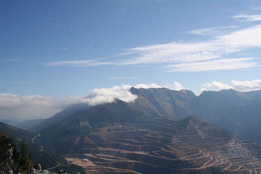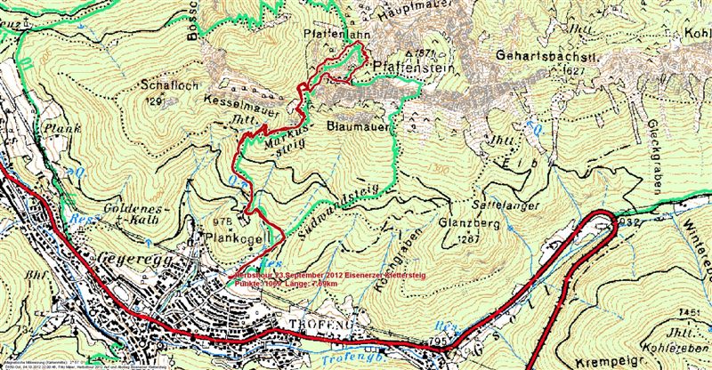 Der Eisenberg mit seinen Stauseen lag ebenfalls zu Füßen. Tags zuvor noch in denn Wolken erfolgte jetzt der Abstieg mit guter Sicht, schnell war die Wegteilung erreicht, rechts haltend über die Stiege - vorbei an der Sitzbank, danach flachte das Gelände ab. Etliche Wanderer die über den Weg 295 von Präbichl aufstiegen, ließen klar werden das ja heute Sonntag war. von Präbichl erfolgt der kürzeste Aufstieg zum Reichenberger Haus 2 1/2 Std. Am Rottörl um 10.40 Uhr, ein ganz anderes Bild, Nebel wohin das Auge reicht, erst aus näherer Entfernung ist der Kumpensee auszumachen, wenig später tauchte die bewirtete Kumpenalm wie aus dem nichts auf, es wurde wohl wärmer aber die Schönheit des Kumpentals blieb uns noch einige Zeit verwehrt! Vorbei an einem Wasserfall der nur Akkustisch wahrzunehmen war wechselte die Szenerie, war es erst noch zarte Laubbäume wurden später Bäume daraus, auch hier begeneten uns erste Wanderer noch vor der Mittagszeit. Nur das dröhnen von Motorsägen störten diese beschauliche Idylle. Hatten sich doch einige bewaffnete weit in das Dickicht vorgearbeitet um Holz einzuholen, die spinnen doch! mittlerer weile war die Sicht frei, die Wolken lösten sich langsam auf, die Sonne stand auf unserer Seite. Kurz nach 12.00 Uhr, war der Parkplatz Hirnalm erreicht. Ein Holzbrunnen mit Wasser-speiher "schön das es dich gibt" diente für ein Gesichtsbad. Am Fahrzeug erfolgte eine kurze Pause um denn Durst zu stillen, natürlich mit dabei der "liebliche Sturm" . Über Trofaiach - Präbichl war das Ziel Eisenerz, besser gesagt der Pfaffenstein mit dem Eisenerzer Klettersteig. Ausgangspunkt hierfür ist der Nördlichste Punkt der Stadt, der ohne Probleme direkt angesteuert wurde, klar einige Hinweisschilder lotsten geschickt durch denn Ort.