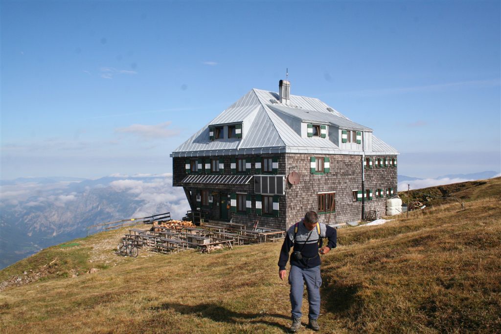 Es war kurz nach 17.00 Uhr, der Abstieg über denn teilweise gesicherten Markussteig stand an. die Ideale Route leitet zuerst in Nördlicher Richtung durch Latschen, führt dann ganz langsam in südlicher Richtung durch nicht ganz einfaches Gelände, von hier wieder ein herrlicher Blick auf denn Leopoldsteiner See, an dessen Nordufer sich der Kaiser Franz Josef Steig befindet, der ja bekanntlicher weise diese Herbsttour krönen wird. Unterhalb des Klettersteigs quert hier der Steig durch eine ausgesetzte Rinne, mit Schwierigkeit B nicht unbedingt für jeden Wanderer das geeignet Terrain. Wenig später ist der Ausgangspunkt des Eisenerzer auf 1530 m erreicht, wir benötigten hierfür knapp 30 Minuten. Der weitere Abstieg schlängelt sich durch schönsten Herbstwald. Vorher war es gar nicht aufgefallen oder war es jetzt der Durst, am ersten Haus befand sich ein Origineller Brunnen mit einem Hinweisschild "Trinkwasser für durstige Bergsteiger" Danke! gerne wurde diese Einladung angenommen.