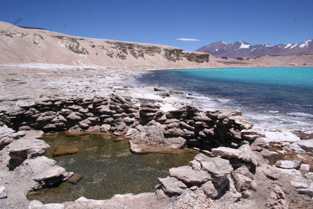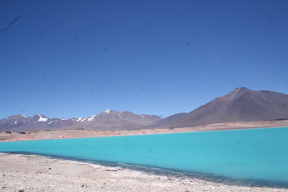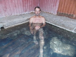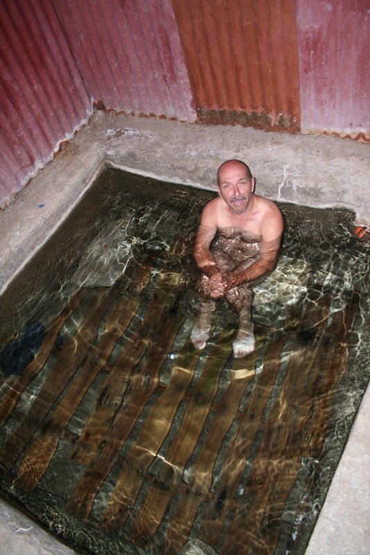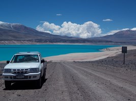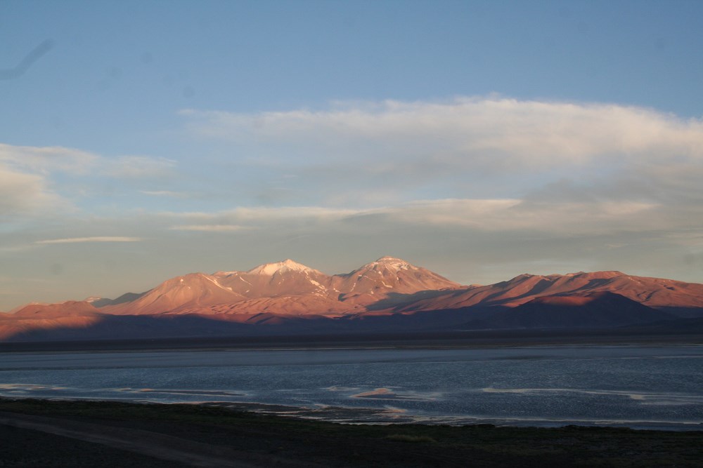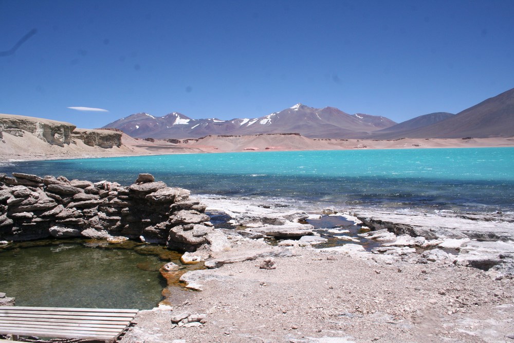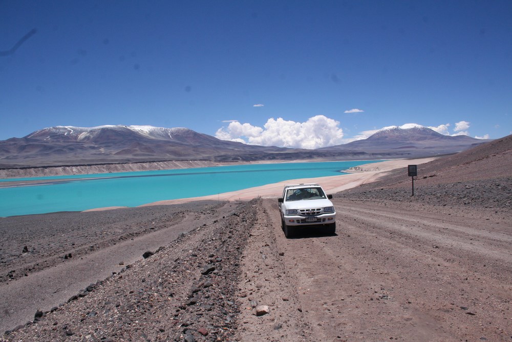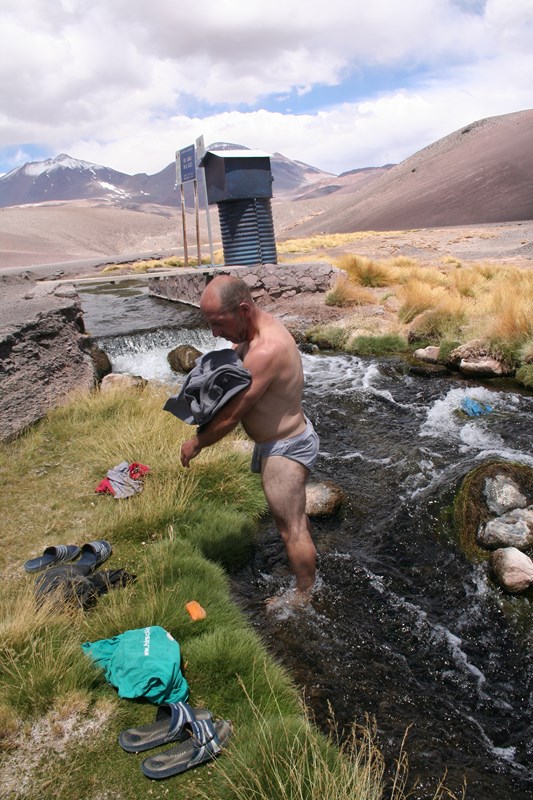 Freitag 10.Januar: noch in der Nacht drückt die Blase, nur mit der Unterhose begleitet geht es in das Freie, es ist gar nicht so Kalt geschätzt 7°C. Im Halbschlaf gehen so Gedanken durch den Kopf, "nach der Übernachtung im Rifugio Lucero, Anfahrt zum Tres Cruces mit sofortigem Aufstieg zum Base Camp"? wohl eine verrückte Idee! Frühstück vor der Hütte, in der Aufsteigenden Sonne wird es sehr schnell Warm, Wecken mit Wurst dazu Tee, nebenbei wird die Ausrüstung gepackt, zwei Füchse wagen sich bis 10 m an die Hütte. Im See tummeln sich so um die 100 Flamingos, ein Romantischer Ort inmitten einer Wüste. Kurz nach 10.00 Uhr, startet Jens den Motor, nach einigen Kilometer die Weggabelung, Links das Ziel, rechts liegen wohl auch sehr hohe Berge über 6000 m, doch wir wollen ja auf die Straße die Chile mit Argentinien verbindet, 4 Guanakos kreuzen, Perfekt im Hintergrund das ganz große Ziel im Blick davor diese schönen Wüstentiere, klar der Foto steht’s greifbar. Die Entscheidung ob Grenzpolizei Posten oder direkt zu der Laguna Verde, ist schnell entschieden die kürzere Variante die wohl bessere, eigentlich sollte man sich am Grenzposten melden, gehen wir davon aus das alles glatt läuft! Die Piste ist nicht einfach, doch unser Fahrzeug erweist sich als wirklich gut, ohne die Differenzial Sperre zu benützen gelingt die Anfahrt, wobei wir uns kurzzeitig sehr nahe am Berg befinden, wird klar das von hier aus kein Zugriff möglich ist. Etwas enttäuscht sind wir über die Piste anscheinend sollte sie komplett Asphaltiert sein, dies berichtete Fritz, nichts war es der Zustand wie eh und je. 2 Radfahrer werden überholt mit verminderter Geschwindigkeit und großem Abstand trotzdem wirbelt das Fahrzeug heftig Staub auf, sie Winken uns zu. Verrückt hier inmitten der Wüste, die nächste erreichbare Zivilisation ist verdammt weit weg. Als die Laguna Verde ein Stahlblauer Salzsee ohne jegliches Leben in das Blickfeld rückt Stoppt Jens das Auto, ein guter Ort für ein Foto, es fällt auf das die Sonst üblichen Salzklumpen am Wegesrand entfernt worden sind. Wenig später biegen wir zum See Links ab, mehrere Fahrzeuge verlassen gerade das Camp (später erfahren wir dass es sich um eine Russische Expedition handelt, auf dem Weg zum Ojos del Salado). Weitere Zelte stehen wohl aber die Besitzer sind wohl unterwegs zum Akklimatisieren, aus einem Militär Jeep steigen drei Soldaten sie informieren sich bei uns über diesen Ort, auf Englisch erkläre ich das am Ojos und hier niemand mehr für die Sicherheit und Kontrolle verantwortlich ist. Herrlich das Bad in der Therme inmitten der Hütte. Wie Neu Geboren wird die Weiterfahrt angetreten.