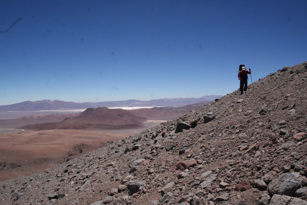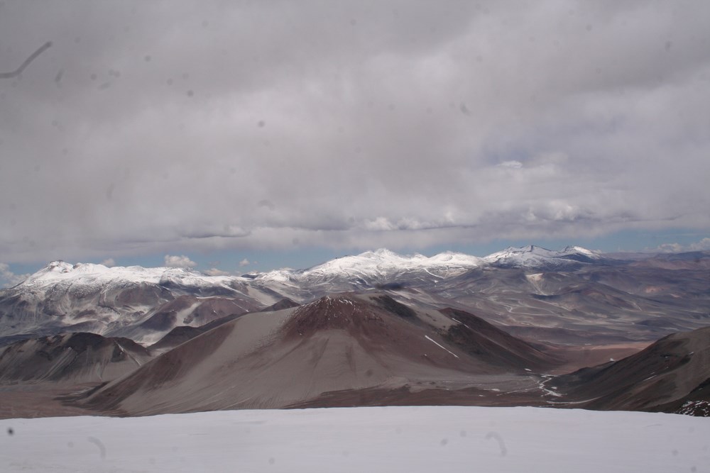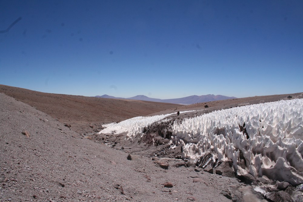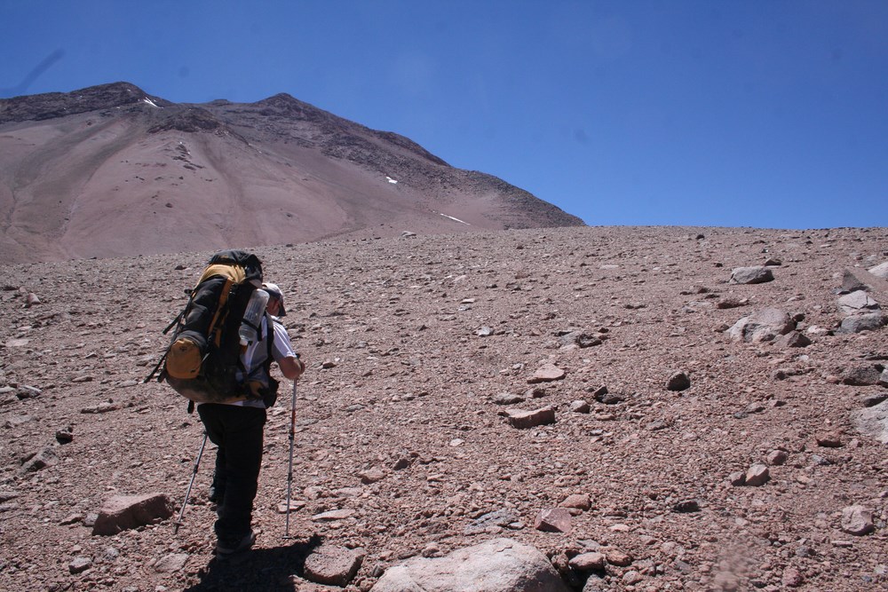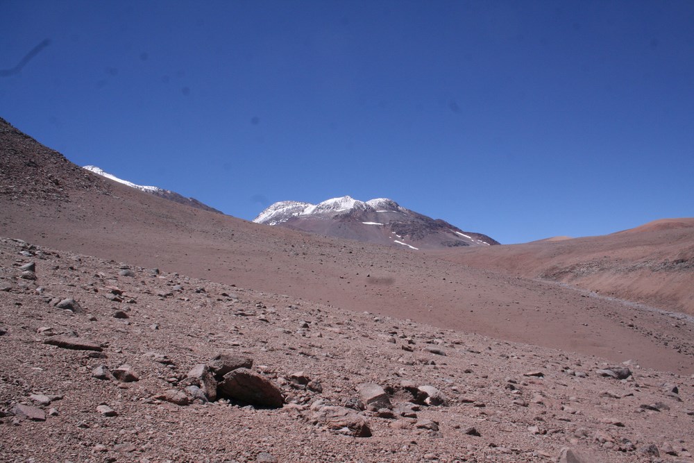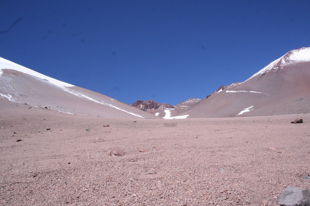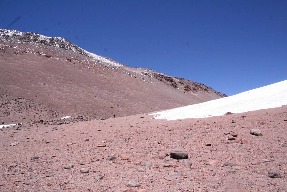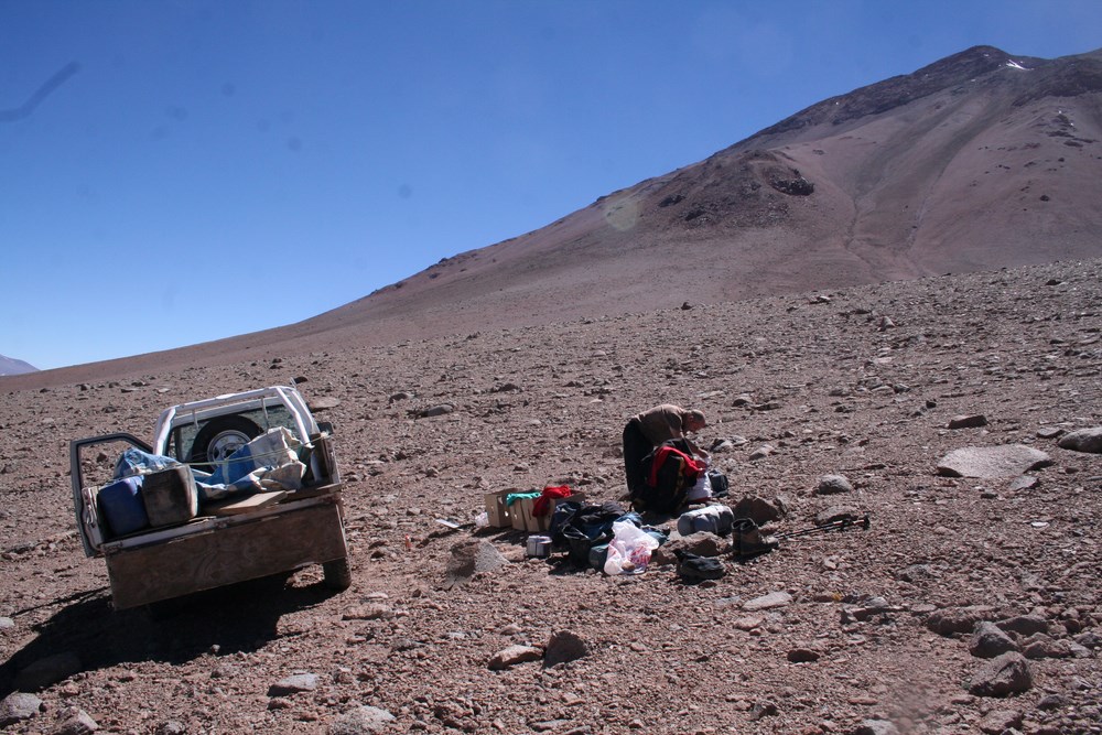 Samstag 11.Januar: 5 Uhr morgens wird es unruhig, 5 Personen brechen zu einer Akklimatisation Tour zum Barancas Blancas auf, Besteigung 2008, auch die Engländer starten früh zu einer Besteigung eines knapp 6000 m hohen Berges nicht so weit entfernt, klar ihre Räder sind mit dabei! 8.30 Uhr, auch für uns beginnt nun der Tag, die Schlafsäcke werden zum Trocknen in der warmen Sonne platziert, nebenher abkochen des Teewassers zum Tee gibt es leckeren Kuchen, der Blick auf einige 6000er die um das Rifugio stehen ist schon allein die Reise hier her wert! Nachdem wieder alles im Auto bzw. der Ladefläche verladen ist, galt es sich zu verabschieden, in wenigen Minuten ist die Hauptstraße erreicht, Fahrtrichtung Copiapo die Straße wird bis zum Ende der Hochfläche Piedra Pomez befahren, die Abzweigung befindet sich deutlich Westlicher als der Gipfel des Tres Cruces Nord, Wir versuchen direkt Südlich den Berg anzusteuern, gelingt aber nicht da durch den Schlamm und Steine die von der Schneeschmelze angespült wurden, ein durchkommen absolut unmöglich wurde, eine Frische Spur wohl ein Fingerzeig, zwar endet diese in steilem Gelände, noch lange kein Grund aufzugeben, nur hier ist eine Anfahrt möglich! da waren wir uns einig, Per Fuß erkundige ich das Gelände, in einem ausgetrockneten Flussbett ist eine Spur zu erkennen, diese biegt links nach oben ab, Jens bekommt ein Zeichen das Fahrzeug setzt sich in Bewegung, ohne Rücksicht auf Verluste quält er das Fahrzeug mit Allrad Antrieb über die Steine, der Tiefe und Weiche Sand erschwert das Ganze erheblich, ja nicht anhalten sonst ist es aus, deutlich weiter als alle anderen Fahrspuren bleibt das Vehikel auf 4780 m stehen, fast so hoch wie der Mont Blanc! Im ersten Moment sind wir enttäuscht war doch die Rede von 5200 m und so. Jetzt ist es klar, für drei Tage gilt es Lebensmittel einzupacken. In der aktiven Phase ist diese Höhe deutlich zu spüren, der Puls hämmert die Atmung heftig. Nachdem alles nicht benötigte im Fahrzeuginneren verstaut war, bricht ein neues und völlig unbekanntes Unternehmen an. Es ist 12.10 Uhr, der Sand ist tief, weit und breit keine Weg Spur, nicht einmal das Ziel ist auszumachen, stetig Links haltend wird die Flanke gequert, es geht leicht Bergauf, wie aus dem nichts taucht ein einzelnes Guanako auf, es folgt eine Gewisse Zeit, an einem Büßerschneefeld hält es inne, der Durst wohl der Beweggrund so nahe zu kommen.