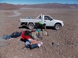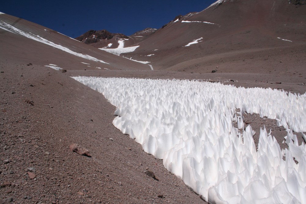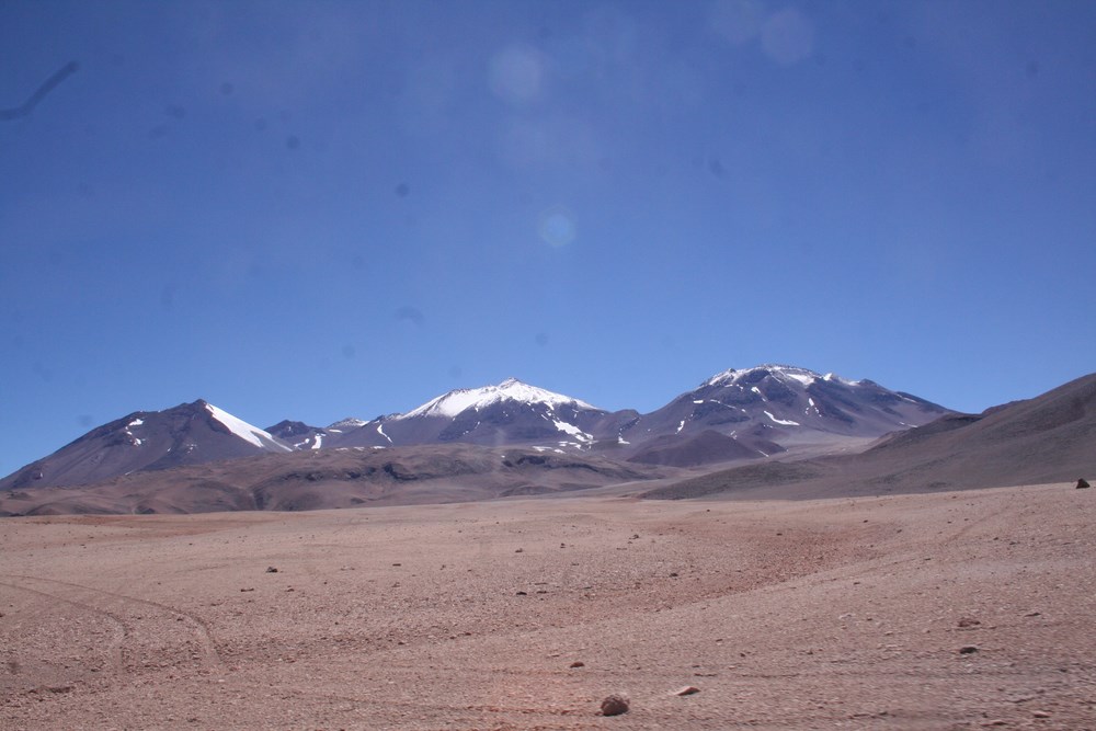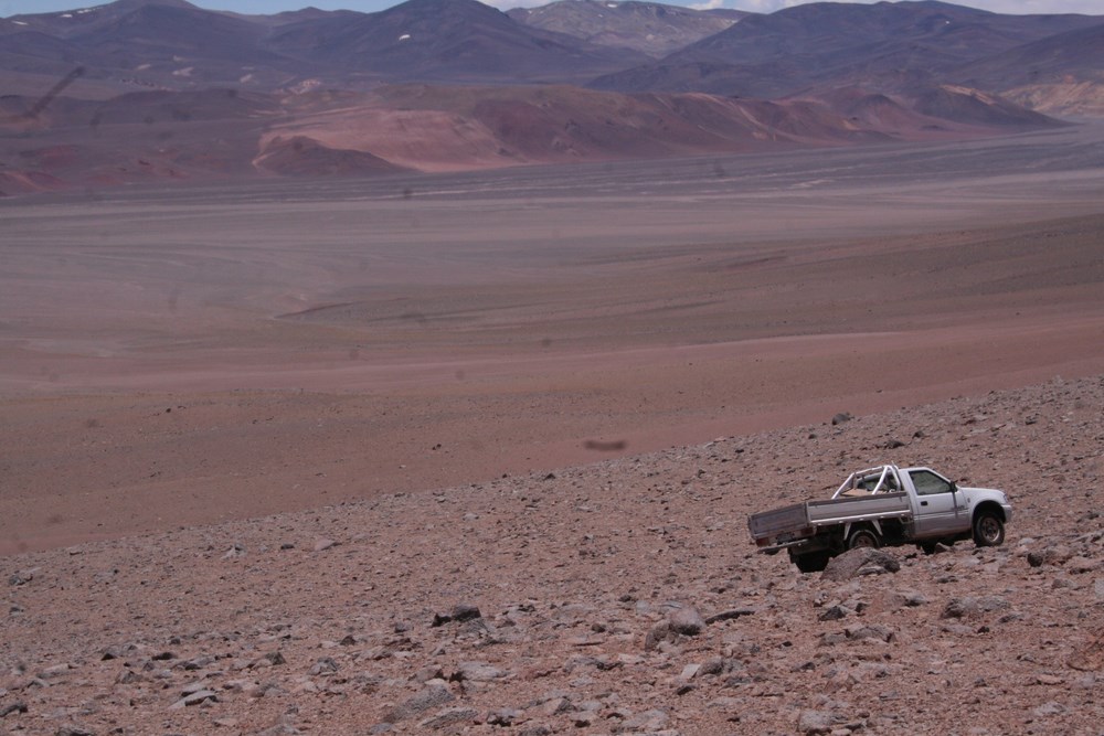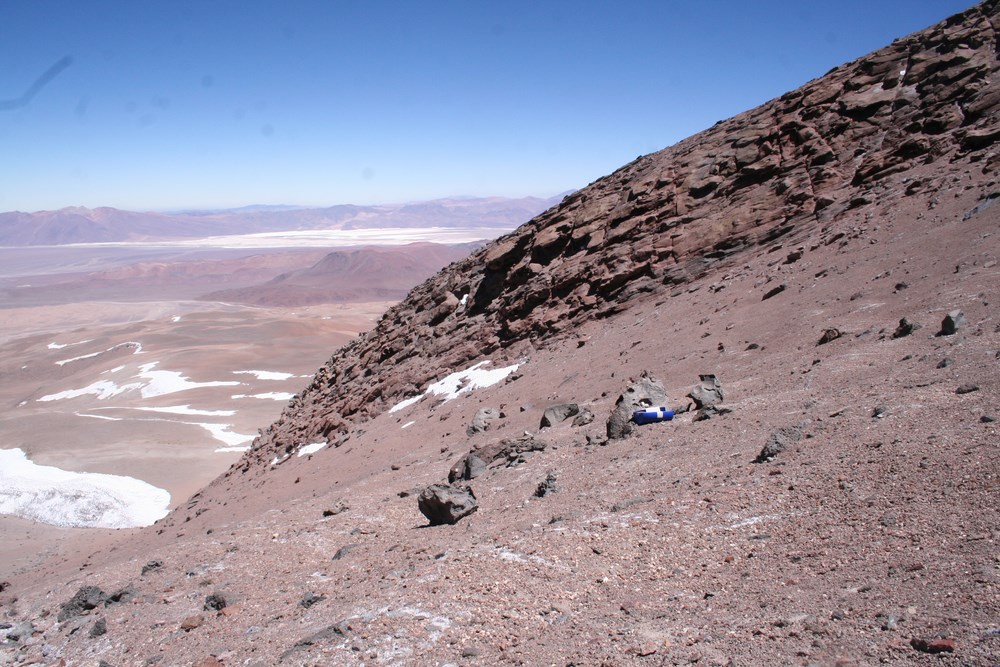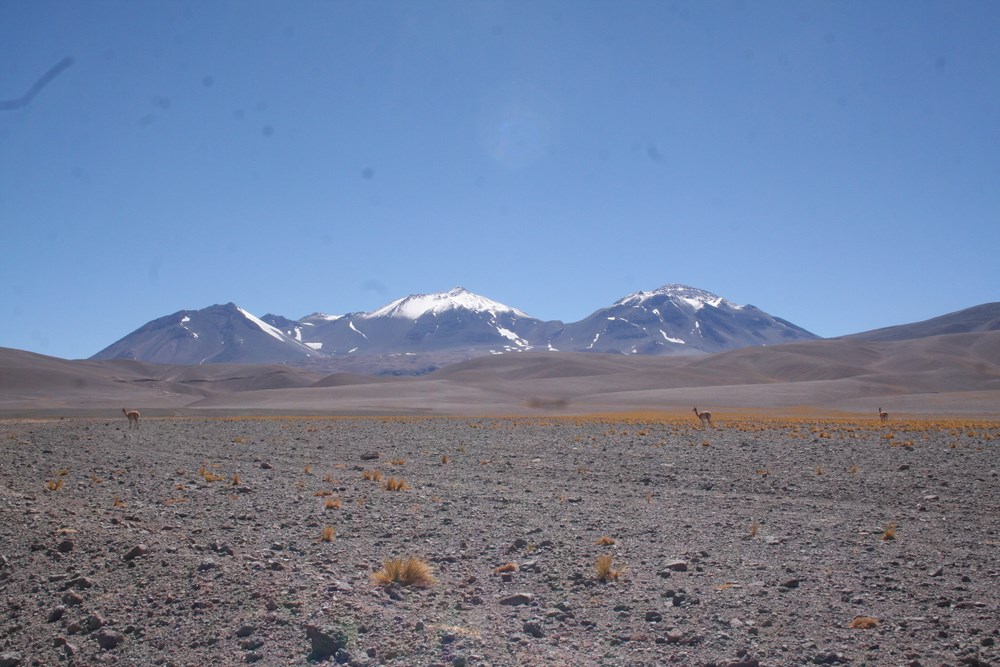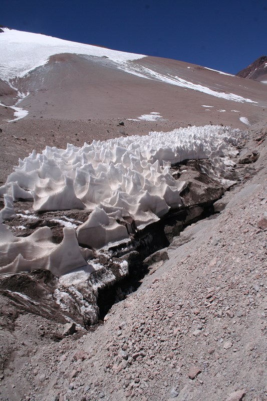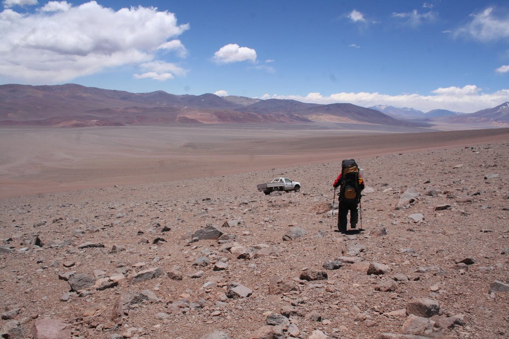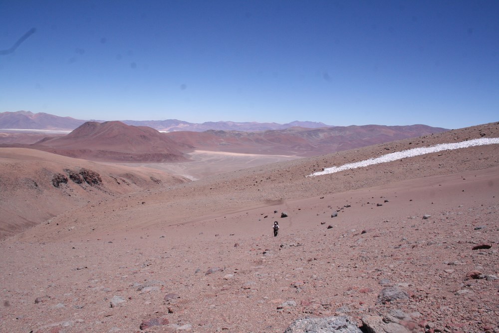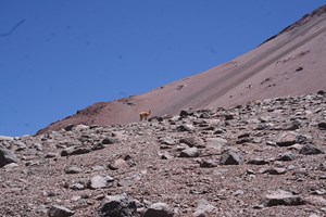 Samstag 11.Januar: 5 Uhr morgens wird es unruhig, 5 Personen brechen zu einer Akklimatisation Tour zum Barancas Blancas auf, Besteigung 2008, auch die Engländer starten früh zu einer Besteigung eines knapp 6000 m hohen Berges nicht so weit entfernt, klar ihre Räder sind mit dabei! 8.30 Uhr, auch für uns beginnt nun der Tag, die Schlafsäcke werden zum Trocknen in der warmen Sonne platziert, nebenher abkochen des Teewassers zum Tee gibt es leckeren Kuchen, der Blick auf einige 6000er die um das Rifugio stehen ist schon allein die Reise hier her wert! Nachdem wieder alles im Auto bzw. der Ladefläche verladen ist, galt es sich zu verabschieden, in wenigen Minuten ist die Hauptstraße erreicht, Fahrtrichtung Copiapo die Straße wird bis zum Ende der Hochfläche Piedra Pomez befahren, die Abzweigung befindet sich deutlich Westlicher als der Gipfel des Tres Cruces Nord, Wir versuchen direkt Südlich den Berg anzusteuern, gelingt aber nicht da durch den Schlamm und Steine die von der Schneeschmelze angespült wurden, ein durchkommen absolut unmöglich wurde, eine Frische Spur wohl ein Fingerzeig, zwar endet diese in steilem Gelände, noch lange kein Grund aufzugeben, nur hier ist eine Anfahrt möglich! da waren wir uns einig, Per Fuß erkundige ich das Gelände, in einem ausgetrockneten Flussbett ist eine Spur zu erkennen, diese biegt links nach oben ab, Jens bekommt ein Zeichen das Fahrzeug setzt sich in Bewegung, ohne Rücksicht auf Verluste quält er das Fahrzeug mit Allrad Antrieb über die Steine, der Tiefe und Weiche Sand erschwert das Ganze erheblich, ja nicht anhalten sonst ist es aus, deutlich weiter als alle anderen Fahrspuren bleibt das Vehikel auf 4780 m stehen, fast so hoch wie der Mont Blanc! Im ersten Moment sind wir enttäuscht war doch die Rede von 5200 m und so. Jetzt ist es klar, für drei Tage gilt es Lebensmittel einzupacken. In der aktiven Phase ist diese Höhe deutlich zu spüren, der Puls hämmert die Atmung heftig. Nachdem alles nicht benötigte im Fahrzeuginneren verstaut war, bricht ein neues und völlig unbekanntes Unternehmen an. Es ist 12.10 Uhr, der Sand ist tief, weit und breit keine Weg Spur, nicht einmal das Ziel ist auszumachen, stetig Links haltend wird die Flanke gequert, es geht leicht Bergauf, wie aus dem nichts taucht ein einzelnes Guanako auf, es folgt eine Gewisse Zeit, an einem Büßerschneefeld hält es inne, der Durst wohl der Beweggrund so nahe zu kommen.