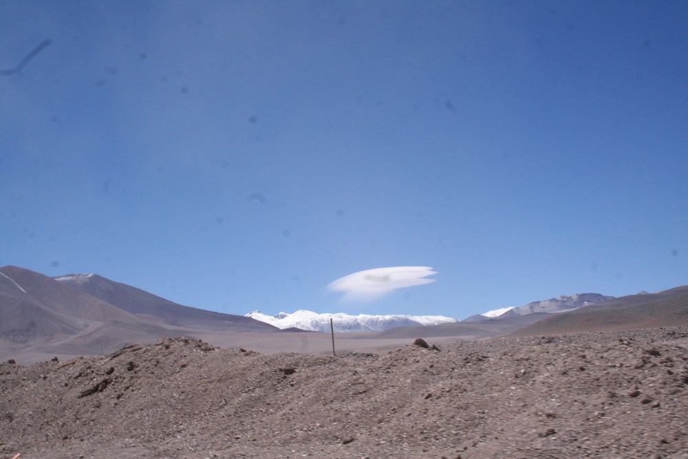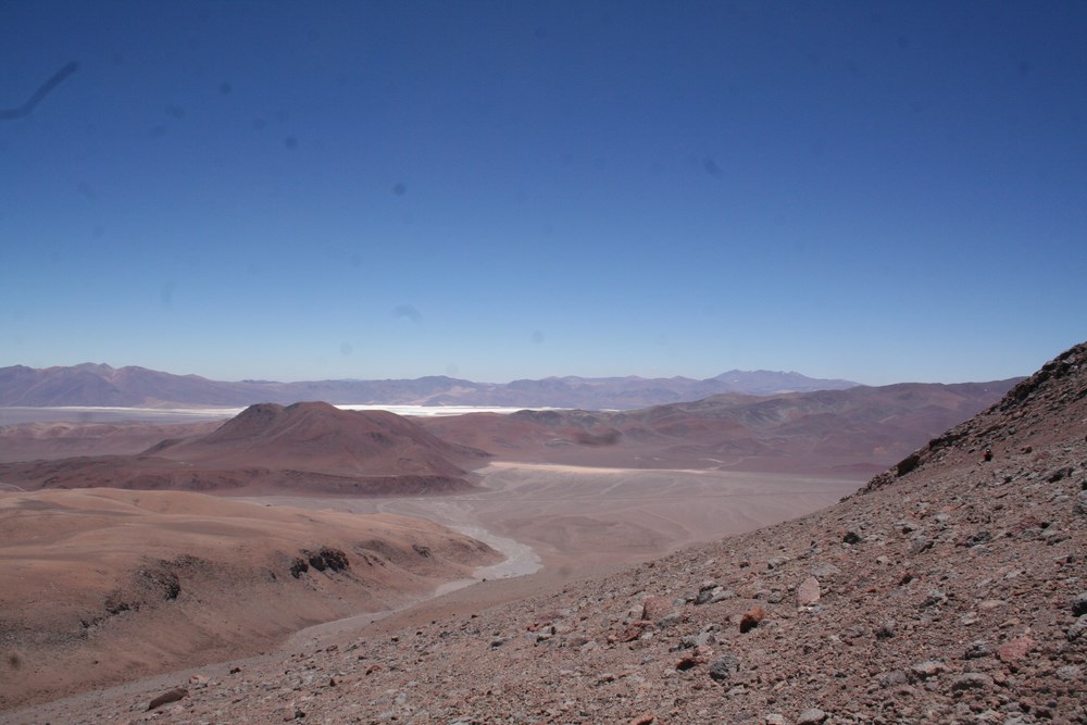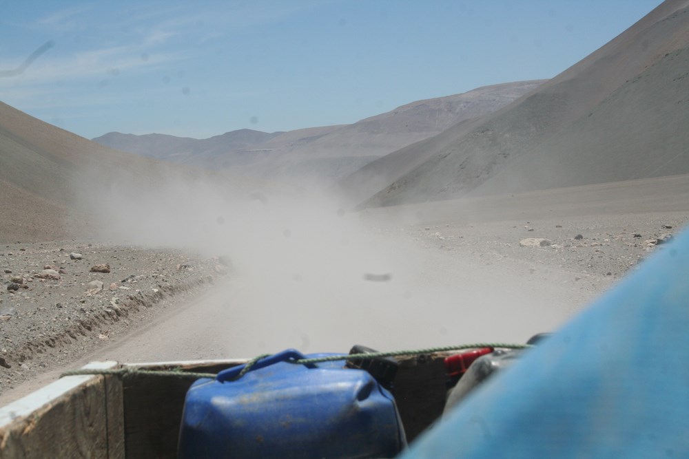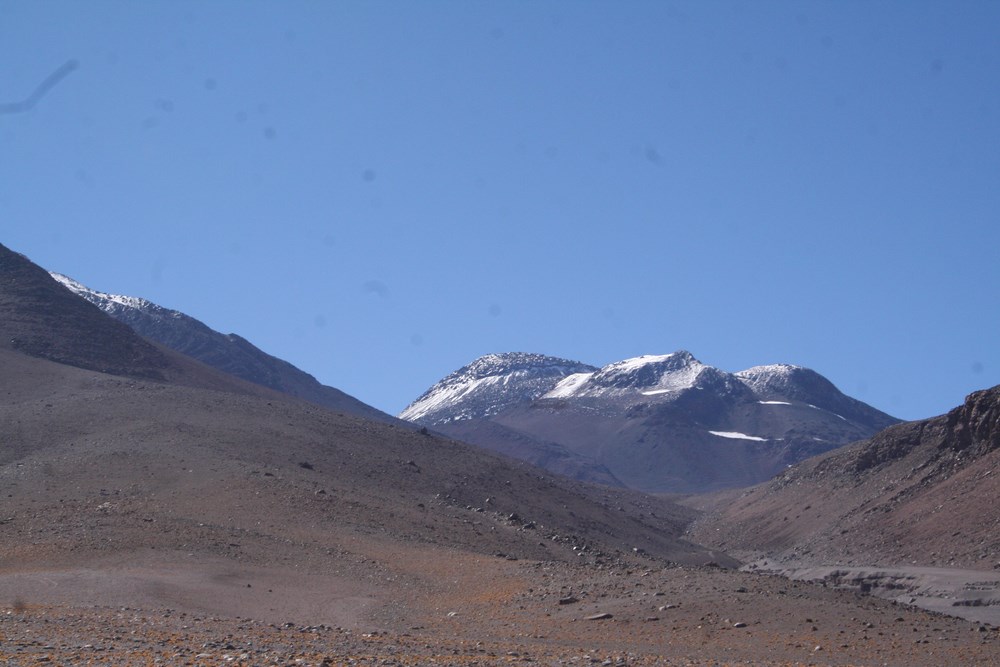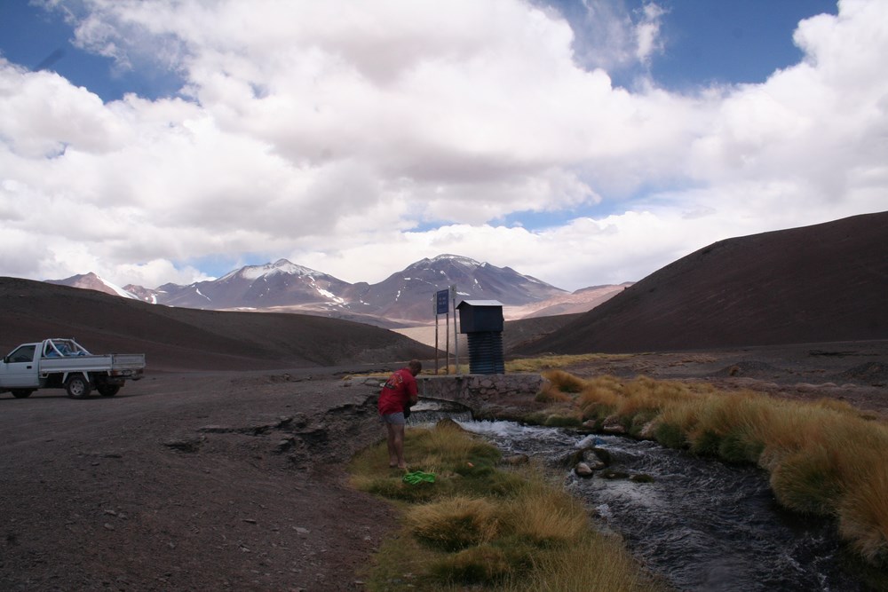 Etwas später verlassen wir an Hand des GPS das Becken, um leicht in Nördlicher Richtung am Hang zu queren, die „Zielfahrt“ und das Gespür führte uns direkt zum Auto, es war genau 14.45 Uhr, 2 ½ Std. für den Abstieg bei 1200 Hm Differenz, prima! Um und im Fahrzeug war alles in Ordnung, das Ersatzrad fand als erstes wieder seinen Platz auf der Ladefläche, nach und nach folgte weiteres, nach dem aufziehen und verspannen der Plane, gab es ein neues Ziel, die Rückfahrt. Ah ja da war da noch, an diesem Berg gab es weder eine Pflanze..und nur drei Lebewesen 1 Guanako und zwei Schmetterlinge kammen uns zu Gesicht. Die Abfahrt durch die Steinwüste zog sich richtig hin, ja Jens war sehr weit heraufgefahren, klar vieles wäre wohl anders gelaufen, wenn ja wenn das Camp I erreicht werden könnte! Am Ursprung des Rio Lama in 3912 m, wurde das angenehm warme Wasser für eine erste leichte Körperreinigung genützt. Sehr gut konnte beobachtet werden, wie sich die Wolken um die Berge verdichteten, ja das Wetter ist in dieser Saison nicht gut gesinnt, wie ja schon am Rifugio Claudio Lucero berichtet wurde! Die Rückfahrt dann mein Part, an der Grenze der Obligatorische Stopp, da ja keine Einreise, von Permit und so wollten die Grenzer nichts wissen, 2 eiskalte Dosenbier gab es für das Personal, die in dieser Einöde einen langweiligen Job nachgehen. Die Fahrt selber wenig aufregend, für Begeisterung allein sorgte die Vielfältigkeit dieser unglaublichen Bergwelt, voll von Mineralien Sand und Steinen die in allen Farben erstrahlten. Etwas Hilflos die Straßenarbeiter die mit Riesigen Wasserfahrzeugen versuchen aus der Piste eine brauchbare Fahrbahn zu schaffen! Hie und da begegnet noch ein Fahrzeug auch ein Deutscher Unimog war dabei, ab der ersten Mine dann mehr Bewegung. In Copiapo schnurstracks zu einer Tankstelle, 38 Liter, das Auto war betankt, auf zu Rodaggio Rückgabe des Vehikels. Zur Freundlichen Begrüßung gab es gleich darauf die Abrechnung 357.000 Peso, bezahlt wurde mit Karte, das abladen verlief etwas schleppend, war es doch Heiß und wir ausgepowert. Im Office wurde das Gepäck sortiert, das große Wasserfass sowie einige Lebensmittel schenkten wir der freundlichen Angestellten. Letzter Akt: Ein Rückfahrt Ticket nach Santiago, bei Condor ging heute gar nichts mehr, erfolgreich dann bei Ciktur, um 21.45 Uhr, wären noch Plätze frei, ohne zu zögern lagen je 15.000 Peso auf der Theke, das sind 20 € pro Person für 800 km Busfahrt in einem bequemen Sessel, Super! am Plazza Colipri sei Abfahrt hmmh. Zurück zu Rodaggio Gepäck Aufnahme Durst und Hungergefühle plagen, die erste Anlaufstelle ohne Küche, ne der zweite Versuch besser, leider war die Türe zu schmal (Copiapo Live alles klein und bieder gehalten) es musste der zweite Flügel geöffnet werden, um mit dem Gepäck in das Lokal zu gelangen. Leider gab es nicht vernünftiges zu Essen, doch das Curasco Sandwich schmeckte echt gut, zum Trinken dazu ein Sprit das richtige. 5 Ecken weiter ein ähnliches Bild nur eine Suppe stand zu Auswahl, dazu kredenzte die Bedienung ein 1 L Flasche Eiskaltes Cristal Cerveza, das Schwitz Wasser sorgte auch noch für eine Kühlung der Hände im Fernseher lief ein Spiel der ersten Chilenischen Liga mit uns unbekannten Mannschaften, ein kommen und gehen, noch mehr Bewegung in der Öffentlichkeit obwohl schon Dunkel 21.30 Uhr, ganz schön Publikumsverkehr auf den Gehwegen. Als der erste Bus verspätet eintraf konnte erahnt werden das die Nachfolgenden nicht Pünktlich starten. Mit 30 Minütiger Verspätung dann die Abfahrt, auffällig sehr viele Eltern mit Kleinkindern in den Armen, keine einfache Reise durch eine lange Nacht. Ein Essen wurde dann auch noch serviert: Reis mit Huhn oder mit Rind, in guter Qualität, der Schlaf besser als die Nächte davor in „Eisigen Höhen.