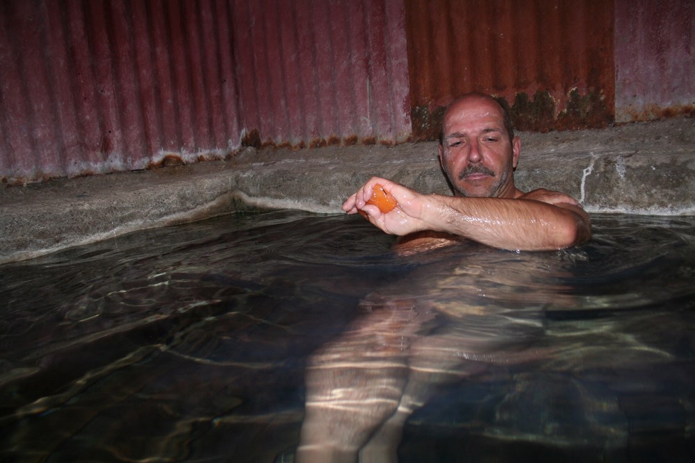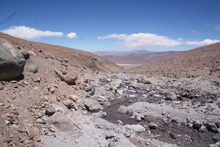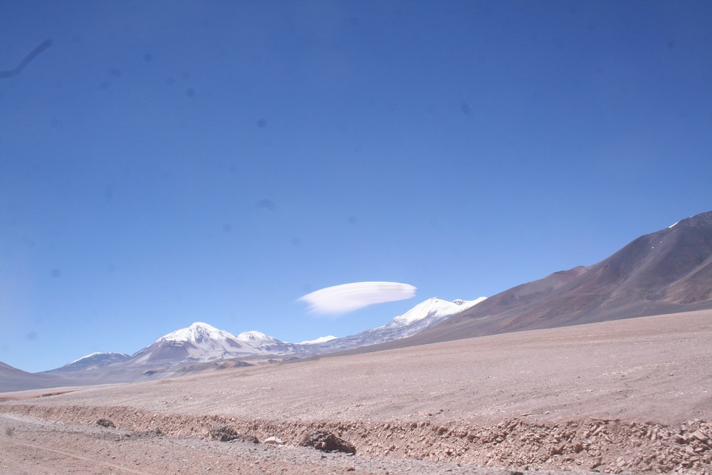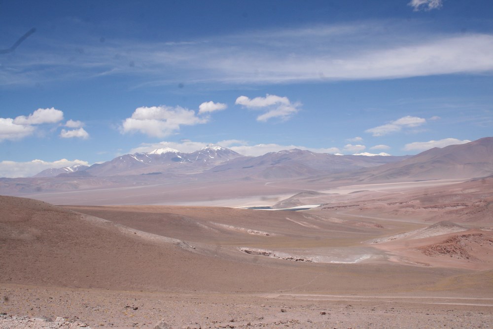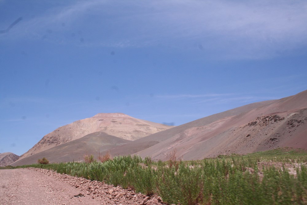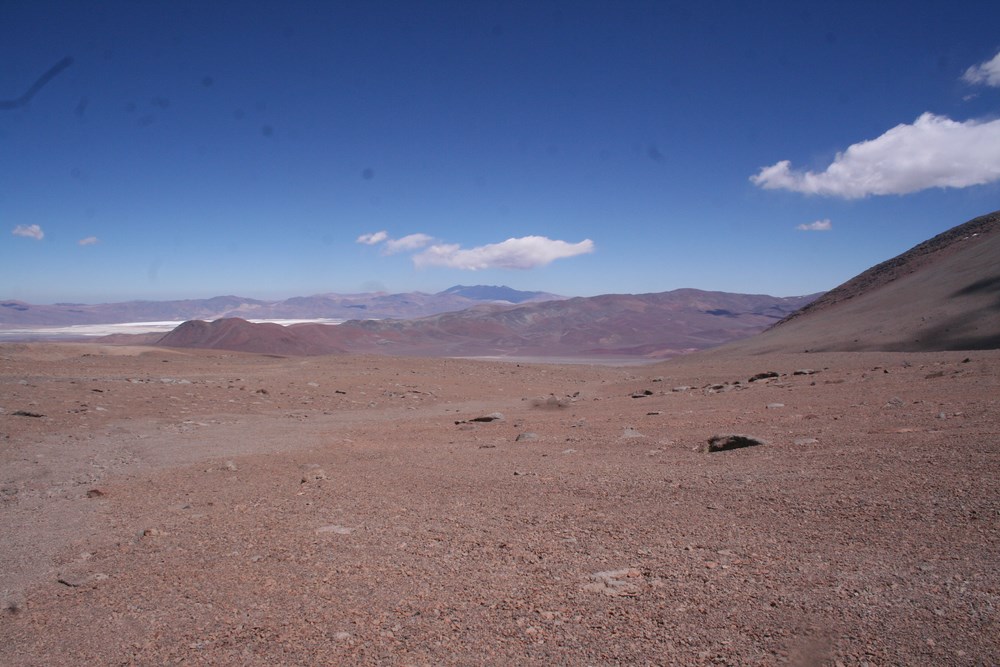 Etwas später verlassen wir an Hand des GPS das Becken, um leicht in Nördlicher Richtung am Hang zu queren, die „Zielfahrt“ und das Gespür führte uns direkt zum Auto, es war genau 14.45 Uhr, 2 ½ Std. für den Abstieg bei 1200 Hm Differenz, prima! Um und im Fahrzeug war alles in Ordnung, das Ersatzrad fand als erstes wieder seinen Platz auf der Ladefläche, nach und nach folgte weiteres, nach dem aufziehen und verspannen der Plane, gab es ein neues Ziel, die Rückfahrt. Ah ja da war da noch, an diesem Berg gab es weder eine Pflanze..und nur drei Lebewesen 1 Guanako und zwei Schmetterlinge kammen uns zu Gesicht. Die Abfahrt durch die Steinwüste zog sich richtig hin, ja Jens war sehr weit heraufgefahren, klar vieles wäre wohl anders gelaufen, wenn ja wenn das Camp I erreicht werden könnte! Am Ursprung des Rio Lama in 3912 m, wurde das angenehm warme Wasser für eine erste leichte Körperreinigung genützt. Sehr gut konnte beobachtet werden, wie sich die Wolken um die Berge verdichteten, ja das Wetter ist in dieser Saison nicht gut gesinnt, wie ja schon am Rifugio Claudio Lucero berichtet wurde! Die Rückfahrt dann mein Part, an der Grenze der Obligatorische Stopp, da ja keine Einreise, von Permit und so wollten die Grenzer nichts wissen, 2 eiskalte Dosenbier gab es für das Personal, die in dieser Einöde einen langweiligen Job nachgehen. Die Fahrt selber wenig aufregend, für Begeisterung allein sorgte die Vielfältigkeit dieser unglaublichen Bergwelt, voll von Mineralien Sand und Steinen die in allen Farben erstrahlten. Etwas Hilflos die Straßenarbeiter die mit Riesigen Wasserfahrzeugen versuchen aus der Piste eine brauchbare Fahrbahn zu schaffen! Hie und da begegnet noch ein Fahrzeug auch ein Deutscher Unimog war dabei, ab der ersten Mine dann mehr Bewegung. In Copiapo schnurstracks zu einer Tankstelle, 38 Liter, das Auto war betankt, auf zu Rodaggio Rückgabe des Vehikels. Zur Freundlichen Begrüßung gab es gleich darauf die Abrechnung 357.000 Peso, bezahlt wurde mit Karte, das abladen verlief etwas schleppend, war es doch Heiß und wir ausgepowert. Im Office wurde das Gepäck sortiert, das große Wasserfass sowie einige Lebensmittel schenkten wir der freundlichen Angestellten. Letzter Akt: Ein Rückfahrt Ticket nach Santiago, bei Condor ging heute gar nichts mehr, erfolgreich dann bei Ciktur, um 21.45 Uhr, wären noch Plätze frei, ohne zu zögern lagen je 15.000 Peso auf der Theke, das sind 20 € pro Person für 800 km Busfahrt in einem bequemen Sessel, Super! am Plazza Colipri sei Abfahrt hmmh. Zurück zu Rodaggio Gepäck Aufnahme Durst und Hungergefühle plagen, die erste Anlaufstelle ohne Küche, ne der zweite Versuch besser, leider war die Türe zu schmal (Copiapo Live alles klein und bieder gehalten) es musste der zweite Flügel geöffnet werden, um mit dem Gepäck in das Lokal zu gelangen. Leider gab es nicht vernünftiges zu Essen, doch das Curasco Sandwich schmeckte echt gut, zum Trinken dazu ein Sprit das richtige. 5 Ecken weiter ein ähnliches Bild nur eine Suppe stand zu Auswahl, dazu kredenzte die Bedienung ein 1 L Flasche Eiskaltes Cristal Cerveza, das Schwitz Wasser sorgte auch noch für eine Kühlung der Hände im Fernseher lief ein Spiel der ersten Chilenischen Liga mit uns unbekannten Mannschaften, ein kommen und gehen, noch mehr Bewegung in der Öffentlichkeit obwohl schon Dunkel 21.30 Uhr, ganz schön Publikumsverkehr auf den Gehwegen. Als der erste Bus verspätet eintraf konnte erahnt werden das die Nachfolgenden nicht Pünktlich starten. Mit 30 Minütiger Verspätung dann die Abfahrt, auffällig sehr viele Eltern mit Kleinkindern in den Armen, keine einfache Reise durch eine lange Nacht. Ein Essen wurde dann auch noch serviert: Reis mit Huhn oder mit Rind, in guter Qualität, der Schlaf besser als die Nächte davor in „Eisigen Höhen.